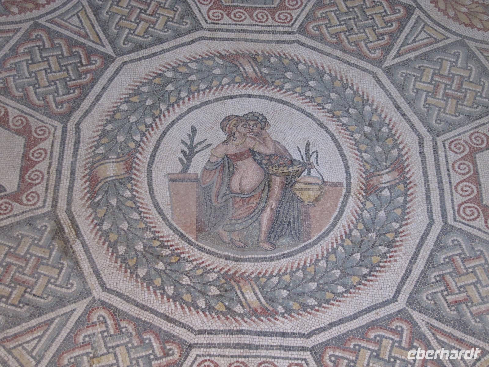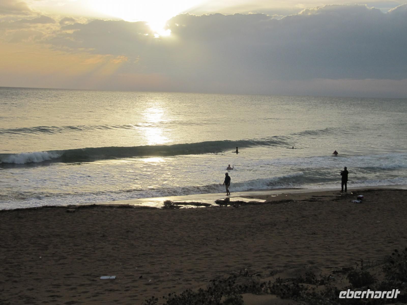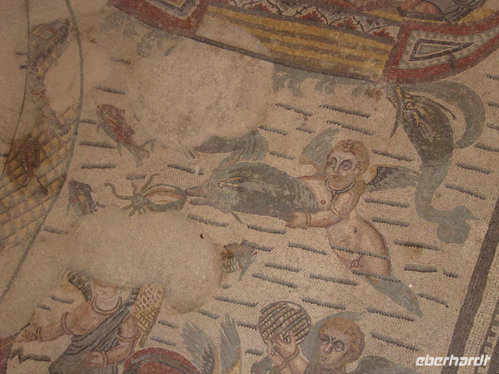 Weiterfahrt in den Süden der Insel! Von Catania fahren wir ein Stück Richtung Palermo auf der Autobahn und dann geht es über Piazza Armerina in die Villa Romana del Casale. Führerin Giusy erwartet uns schon und erklärt uns viel über diese berühmten phantastischen Mosaike. Danach sind wir beim Tenuta Barone Nicolo La Lumia zur Weinverkostung angemeldet. Auch ein kleiner Imbiss gehört dazu! Die Weine und das Essen sind ausgezeichnet! Wir sind ganz entzückt von vier kleinen Hundewelpen - ach wie süß! Unser heutiges Hotel Baia di Ulisse befindet sich in San Leone, einem Vorort von Agrigent, über einer kleinen Steilküste direkt am Meer. Viele Gäste nehmen noch ein Bad in den Wellen. Ein heftiges Gewitter entlädt sich am Abend, es stürmt und regnet stark!