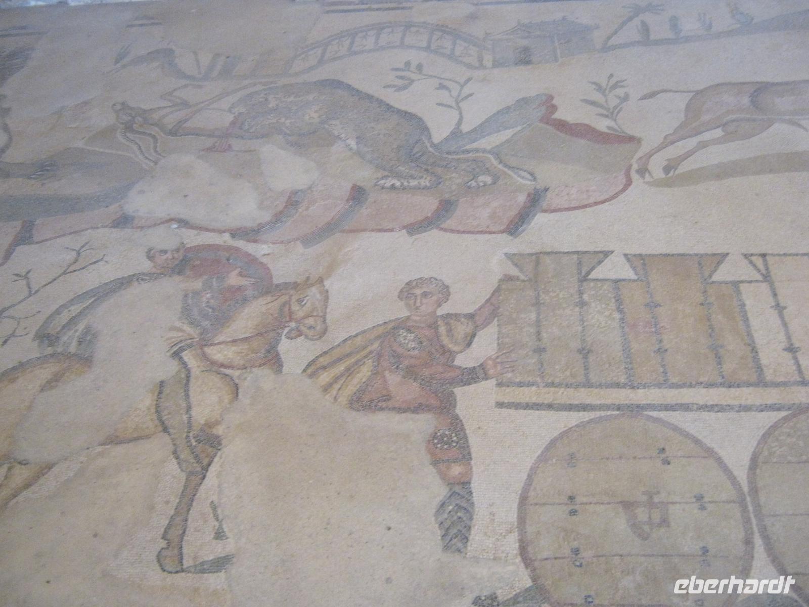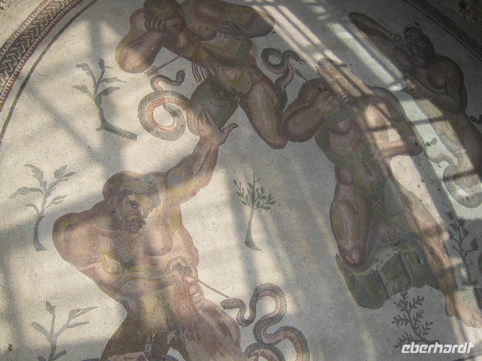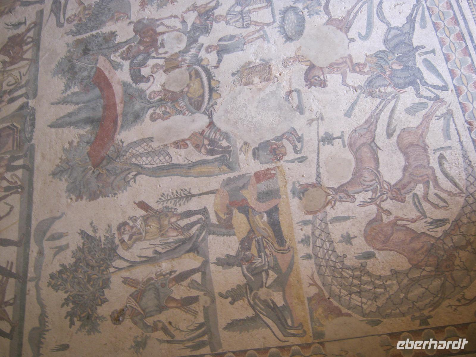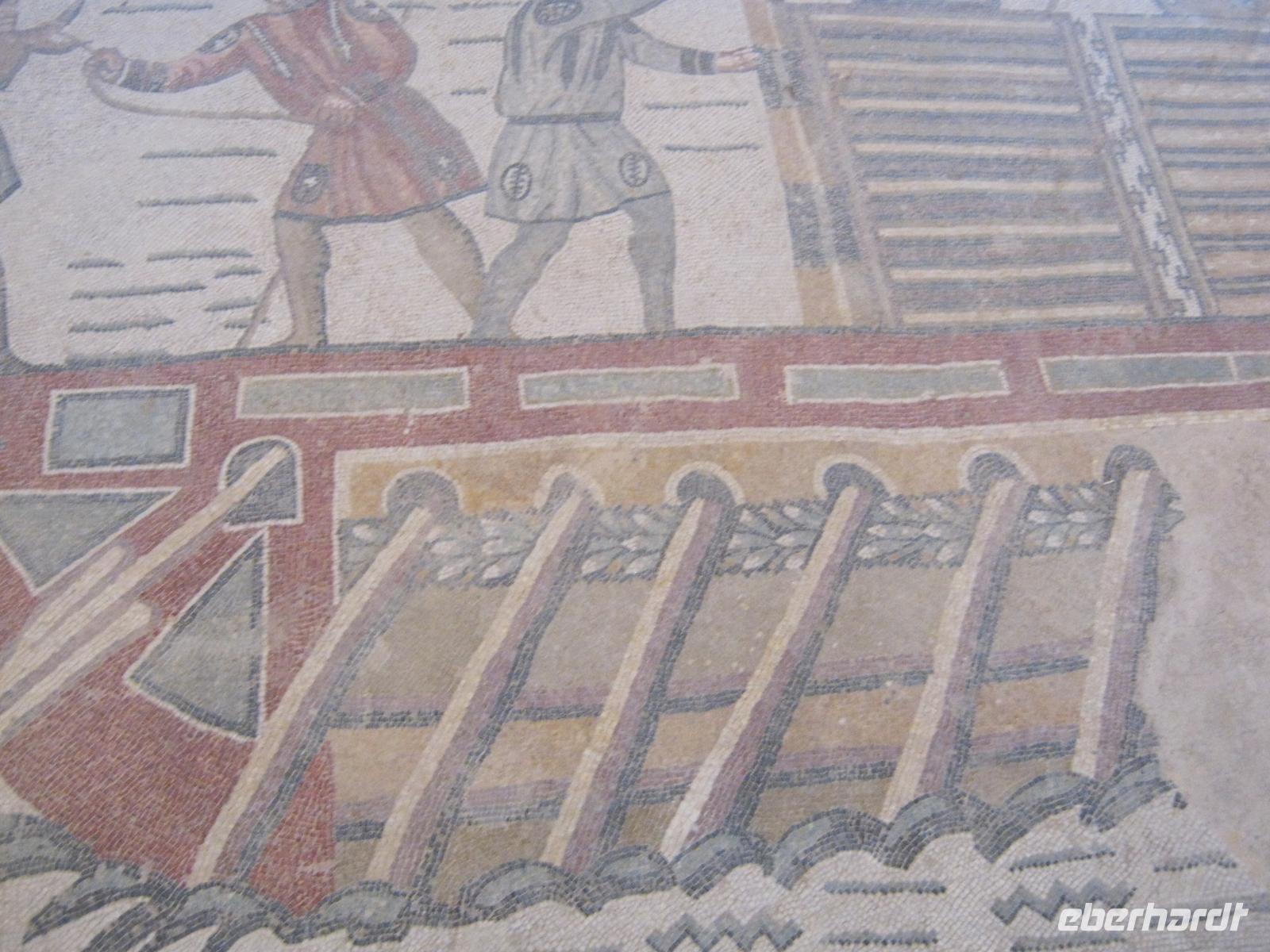Am nächsten morgen gab es beim Koffertransport durch das Hotelpersonal kleine Schwierigkeiten, aber schließlich hatten wir alles beisammen und konnten uns auf den Weg nach Piazza Armerina machen, um.die wegen ihrer perfekt erhaltenen römischen Fußboden-Mosaiken weithin berühmte Villa zu besichtigen. Mit staunenden Augen konnten wir uns davon überzeugen, dass sie völlig zu Recht in jedem Handbuch der römischen Kulturgeschichte steht (u.a. erste Darstellung von Damen im Bikini!). Später dann wurden wir vom jungen Herrn Baron persönlich auf dem Weingut Tenuta La Lumia empfangen, wo wir uns von der Qualität der lokalen Gewächse, begleitet mit einem herzhaften Imbiss, „berauschen" ließen. Das Hotel an der Odysseus-Bucht war wirklich schön.