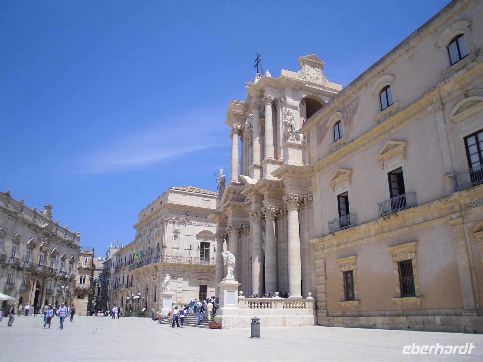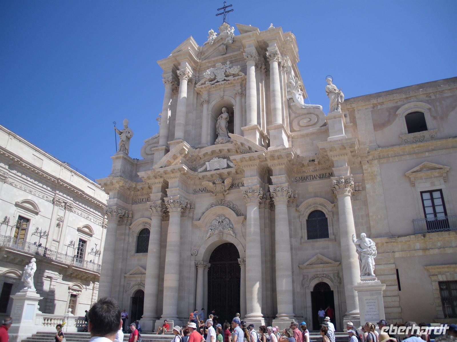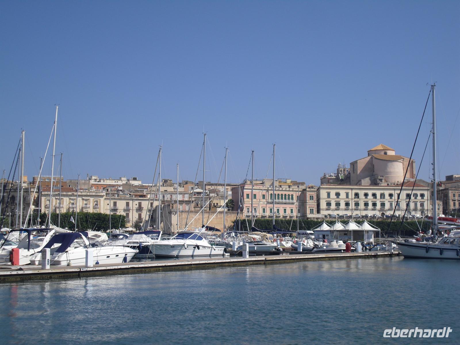 Man erzählt sich, dass der Tyrann Dionysios, nach dem die Grotte benannt ist, jedes Wort der in ihr Gefangenen, und sei es auch nur geflüstert, von einem in ihrer Höhe befindlichen Schlitz aus mitgehört habe. Anschließend fahren wir mit unserer sympathischen örtlichen Reiseleiterin Carolina bis zum Hafen bzw. der Altstadt von Syrakus, die auf der Insel Ortigia liegt und über eine Brücke mit dem Festland verbunden ist. Wir gelangen zunächst zu den Resten des Apollotempels, er geht auf das Ende des 7. Jahrhunderts zurück und ist damit der älteste der großen sizilianischen Tempel. Gemütlich spazieren wir gemeinsam durch die engen Gassen bis zum Domplatz. Der lange und schmale Domplatz wird von der wuchtigen, durch Säulen gegliederten Barockfassade des Doms beherrscht. Hinter ihr verbirgt sich der vollständig erhaltene Athena-Tempel aus dem 5. Jahrhundert v. Chr. In der seitlichen Außenwand sind die dorischen Säulen sichtbar, deren Zwischenräume zugemauert wurden. Das Innere ist schlicht, das Mittelschiff besitzt eine schöne Renaissance-Holzdecke, und ein von zwei romanischen Löwen getragener hellenistischer Prunkkrater bildet das Taufbecken. Wir gelangen nun weiter zu dem mit Papyrus bepflanzten Becken der Arethusa-Quelle, die heute nur noch brackiges Wasser führt. Diese kleine Quelle steht als Metapher für das Band, das Syrakus mit seiner Mutterstadt Korinth verbindet und das trotz der Entfernung nie durchschnitten wurde.
