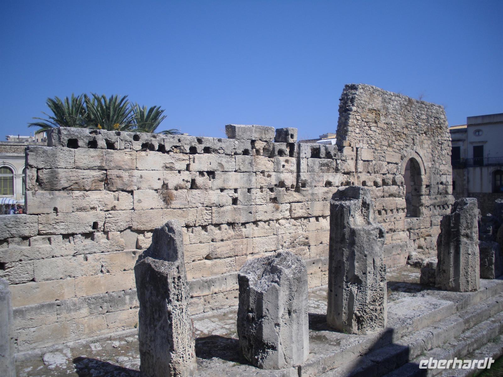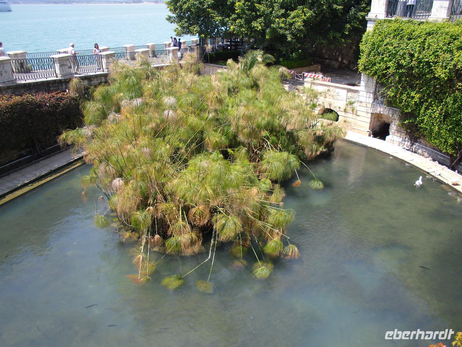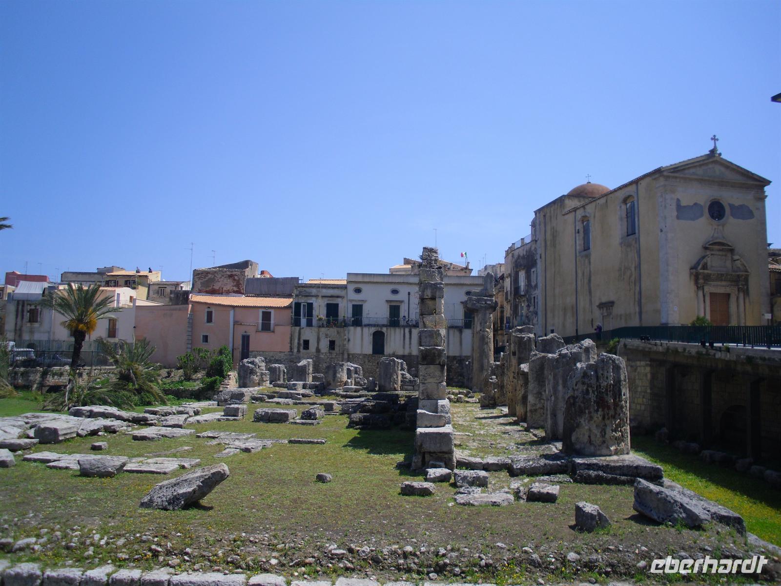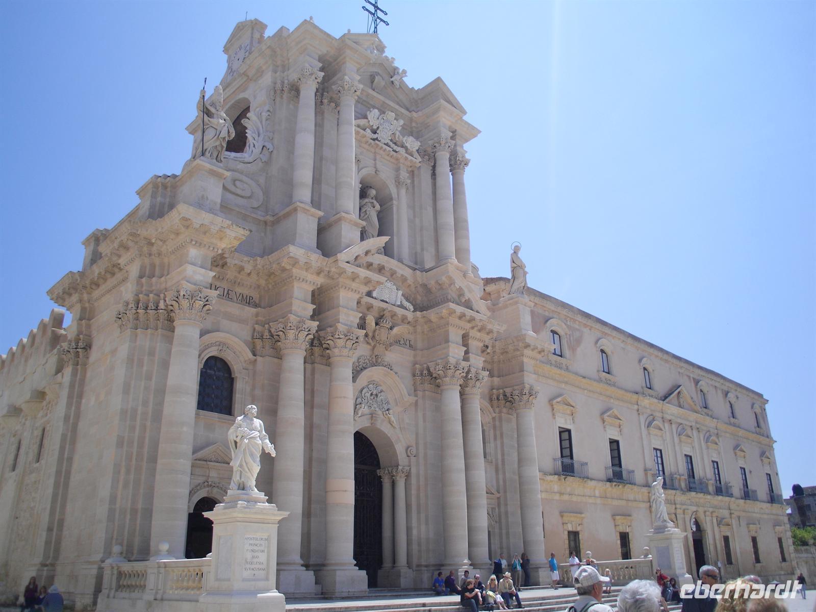 Man erzählt sich, dass der Tyrann Dionysios, nach dem die Grotte benannt ist, jedes Wort der in ihr Gefangenen, und sei es auch nur geflüstert, von einem in ihrer Höhe befindlichen Schlitz aus mitgehört habe. Anschließend fahren wir mit unserer sympathischen örtlichen Reiseleiterin Carolina bis zum Hafen bzw. der Altstadt von Syrakus, die auf der Insel Ortigia liegt und über eine Brücke mit dem Festland verbunden ist. Wir gelangen zunächst zu den Resten des Apollotempels, er geht auf das Ende des 7. Jahrhunderts zurück und ist damit der älteste der großen sizilianischen Tempel. Gemütlich spazieren wir gemeinsam durch die engen Gassen bis zum Domplatz. Der lange und schmale Domplatz wird von der wuchtigen, durch Säulen gegliederten Barockfassade des Doms beherrscht. Hinter ihr verbirgt sich der vollständig erhaltene Athena-Tempel aus dem 5. Jahrhundert v. Chr. In der seitlichen Außenwand sind die dorischen Säulen sichtbar, deren Zwischenräume zugemauert wurden. Das Innere ist schlicht, das Mittelschiff besitzt eine schöne Renaissance-Holzdecke, und ein von zwei romanischen Löwen getragener hellenistischer Prunkkrater bildet das Taufbecken. Wir gelangen nun weiter zu dem mit Papyrus bepflanzten Becken der Arethusa-Quelle, die heute nur noch brackiges Wasser führt. Diese kleine Quelle steht als Metapher für das Band, das Syrakus mit seiner Mutterstadt Korinth verbindet und das trotz der Entfernung nie durchschnitten wurde.