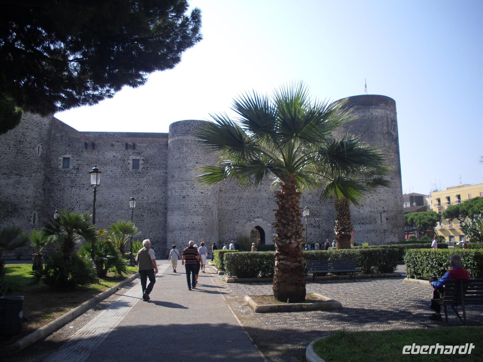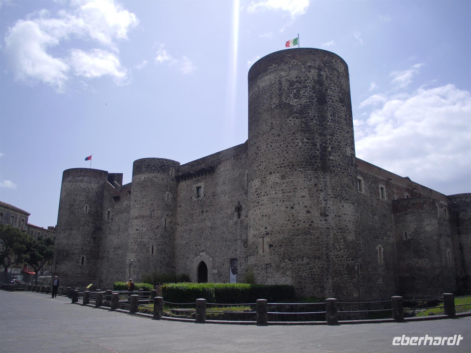 In Catania unternehmen wir eine kleine Stadtrundfahrt entlang der Via Etnea und steigen anschließend in der Nähe des berühmten Teatro Massimo Bellini aus. Es ist eines der schönsten Opernhäuser Siziliens und wurde im Jahre 1890 mit der Aufführung der Oper "Norma" eröffnet. Während seines Bestehens wurden fast die gesamten Werke Bellinis hier aufgeführt. Der Komponist Vincenzo Bellini ist übrigens einer der berühmtesten Söhne Catanias! Weiter geht es nun zu Fuss in Richtung Domplatz. Inmitten des Domplatzes befindet sich Catanias Wahrzeichen, ein Elefant mit erhobenem Rüssel - eine tierische Geste, die Glück bringt, wie man auf Sizilien glaubt. Der Elefant selbst steht für Intelligenz und Langlebigkeit, und intelligent mussten die Catanier seit der Gründung ihrer Stadt im Jahr 730 v. Chr. immer wieder sein, um trotz Vulkan und Erdbeben lange zu leben. Eine Legende erzählt übrigens, dass ein Elefant bei der Gründung der Stadt alle wilden Tiere vertrieb und damit den ersten Siedlern zu Hilfe kam, weshalb er seit dem 13. Jahrhundert das Wahrzeichen Catanias ist. Wir gehen nun etwas weiter und sehen unter anderem das Schloss Ursino.