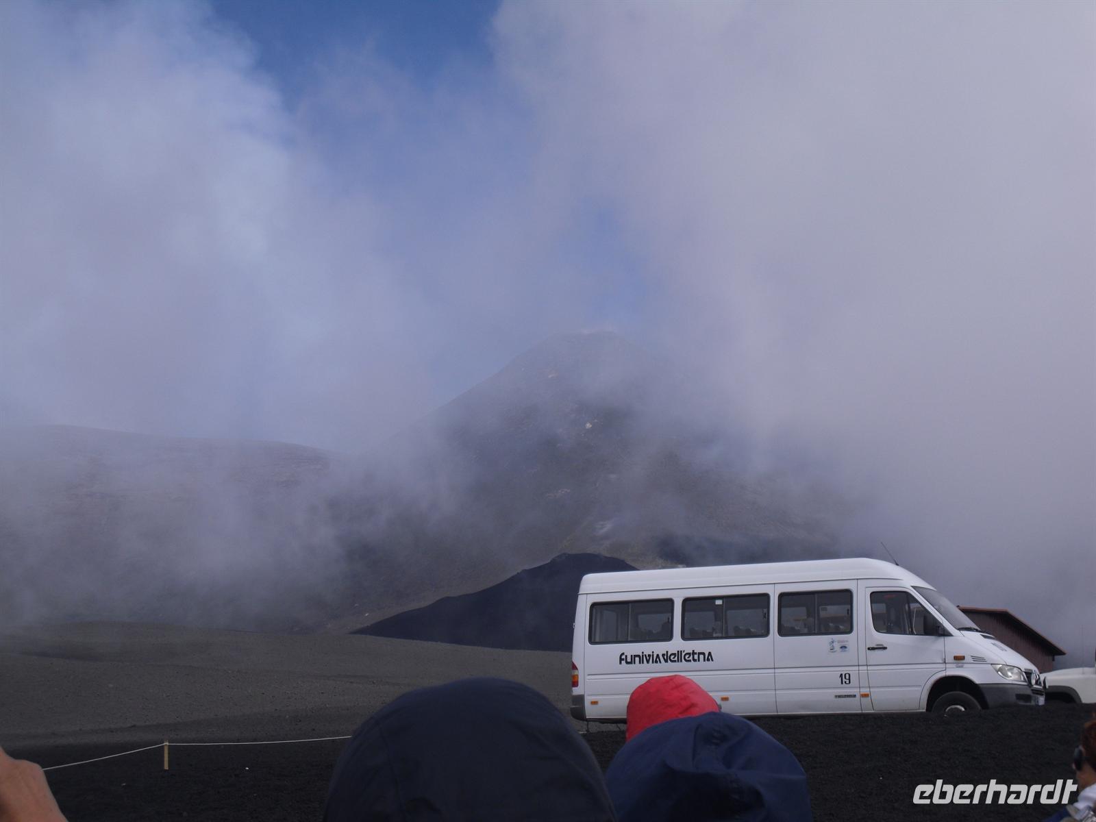 Für viele unserer Gäste sollte heute bereits der Höhepunkt unserer Reise auf dem Programm. Leider hatte der Wettergott kein richtiges Einsehen mit uns - der Ätna ist im Nebel abgetaucht! „Il monte“, den Berg, nennen die Catanier den Ätna einfach nur, ihren Berg der Superlative - Europas höchster und aktivster Vulkan, der seit 2.500 Jahren in einem regelmäßigen Rhythmus Dampfwolken ausstößt.
