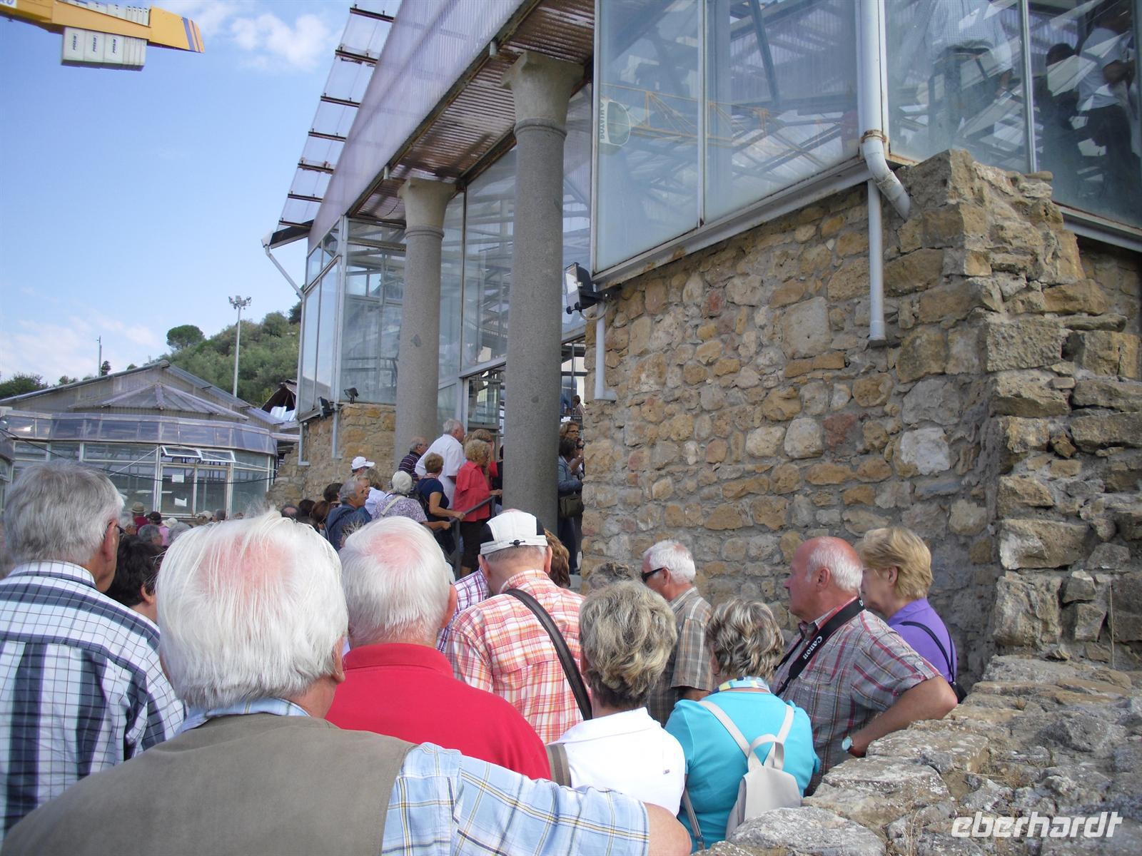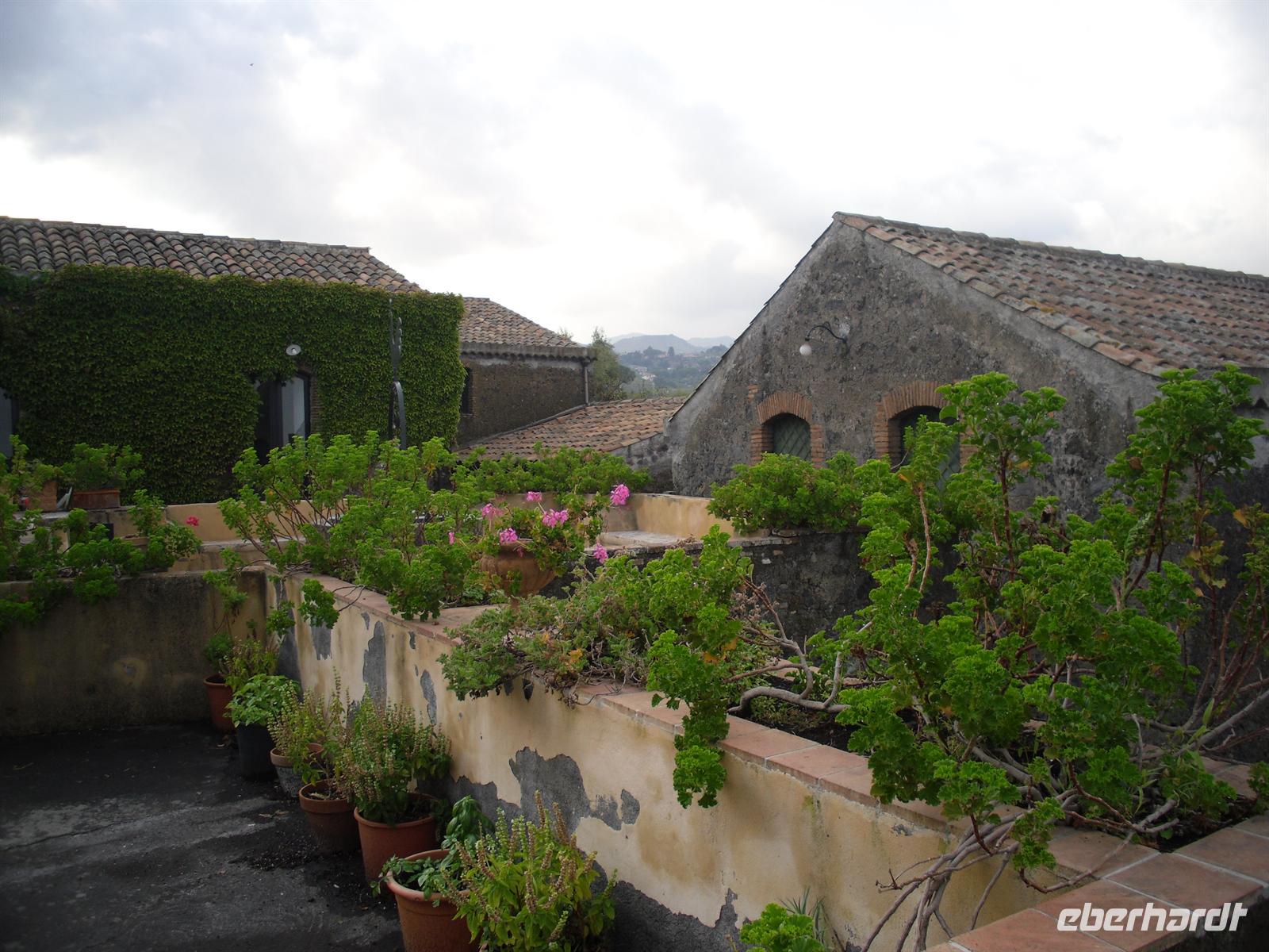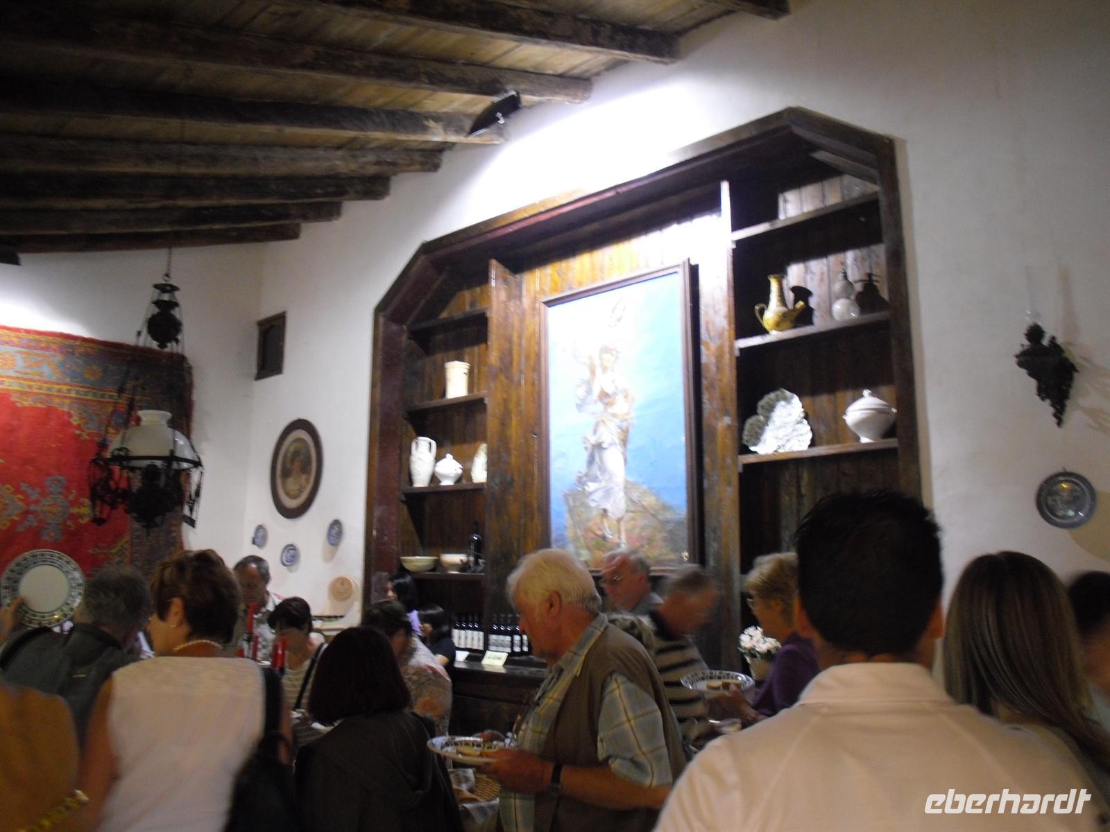 Gegen 8.30 Uhr morgens geht es nunmehr los, in Richtung Catania und dann von Süden über Nicolosi, danach immer wieder an erstarrten Lavaströmen vorbei und letztendlich bis auf knapp 2.000 Meter hinauf. Dort ist Endstation für den Bus und man kann nun mit der Seilbahn bzw. mit Geländebussen weiter hinauf bis auf etwa 3.000 Meter fahren. Die meisten unserer Gruppe fahren hinauf. Oben auf 3.000 Metern Höhe angekommen eröffnet sich uns teilweise ein gigantischer Blick auf den Gipfel - das sind allerdings nur Momentafnahmen, denn die Wolken ziehen sehr schnell und außerdem läßt sich die Sonne kaum blicken! Es ist ziemlich kalt hier oben! Manch einer nutzt nun die Gelegenheit, mit einem Bergführer das Gelände hier oben zu erkunden und bekommt so manch interessante Stelle der derzeitigen Aktivitäten des Ätnas gezeigt. Die Gäste, die nicht mit oben sind, probieren und kaufen derweil einige typische Ätna-Produkte, unter anderem Honig mit Pistazien, Mandeln und Haselnüssen, überhaupt Pistazien, die für die Gegend um den Ätna typisch sind, und natürlich Pesto und getrocknete Tomaten. Einige verkosten auch den berühmten Schnaps „Ätnafeuer“, mit 50 bzw. 70 Prozent Alkohol, aus Blutorangen und Erdbeeren hergestellt. Anschließend fahren wir auf der anderen Seite und damit über Zaferana Etnea hinunter nach Viagrande. In Zaferana Etnea ist heute ein Strassenfest und somit brauchen wir mit unserem Bus eine Menge Geduld, um auf die richtige Strasse zu gelangen, die uns nach Viagrande führt. Auf dem kleinen Weingut in Viagrande angekommen, nehmen wir zuerst an einer kleinen Weinverkostung teil. Wir verkosten typischen Rot- und Weißwein der Region, gewonnen aus der Insoglia-Traube. Danach wird uns ein schmackhaftes Mittagessen mit gutem Wein gereicht und bei bester Laune geht es zurück nach Giardini Naxos.