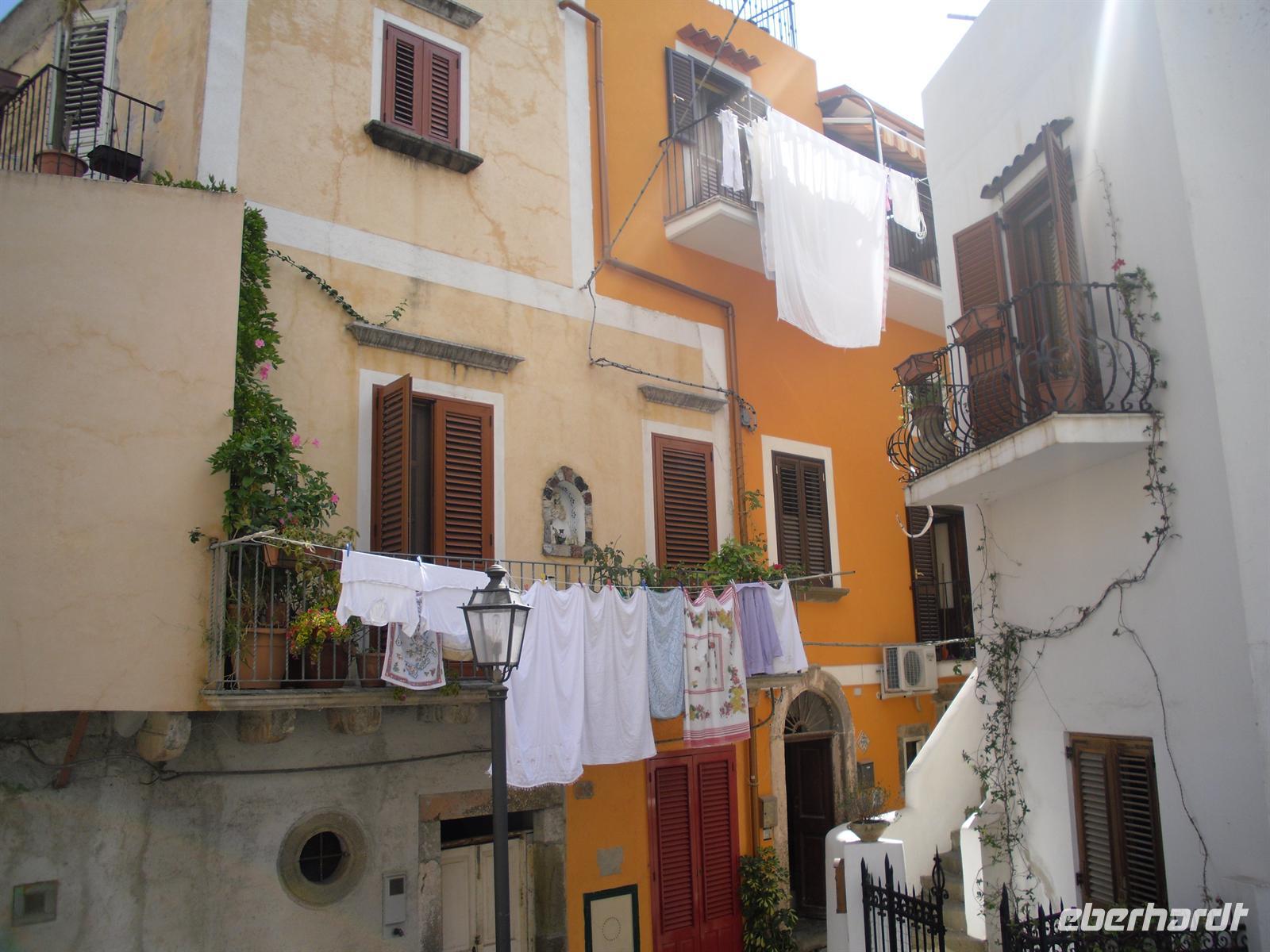 Von 1960 an wurde eine Saline nach der anderen geschlossen, und die Windmühlen zerfielen. Als 1984 die Salzgärten Erdölraffinerien weichen sollten, engagierten sich Naturschützer für den Erhalt dieser einzigartigen Landschaft und die Wiederinbetriebnahme eines Teils der Salinen mit ihren Windmühlen. Heute wird etwa die Hälfte der früheren Fläche wieder bewirtschaftet. Wir machen einen kurzen Halt und haben einen schönen Blick auf die Ägadischen Inseln. Wenig später erreichen wir Trapani und sehen schon von weitem den Berg von Erice, heute zum Glück mal nicht im Nebel! Fast über dem Meer, aber in 700 Metern Höhe schwebt das mittelalterliche Erice mit seinen grauen Steinhäusern. Wir unternehmen einen Spaziergang durch die Stadt und bemerken sehr schnell, dass sie zu einem großen Teil verlassen ist; trotz allem fehlen hier aber die sonst so augenfälligen Zeichen des Verfalls, denn sie ist Ziel vieler Sizilianer, die hier am Wochenende die kühlere Luft genießen. Nach einem kurzen Aufenthalt fahren wir weiter in Richtung Palermo und letztendlich erreichen wir am Abend unser Hotel „Dolcestate“ in Campofelice di Roccella an der Nordküste Siziliens.