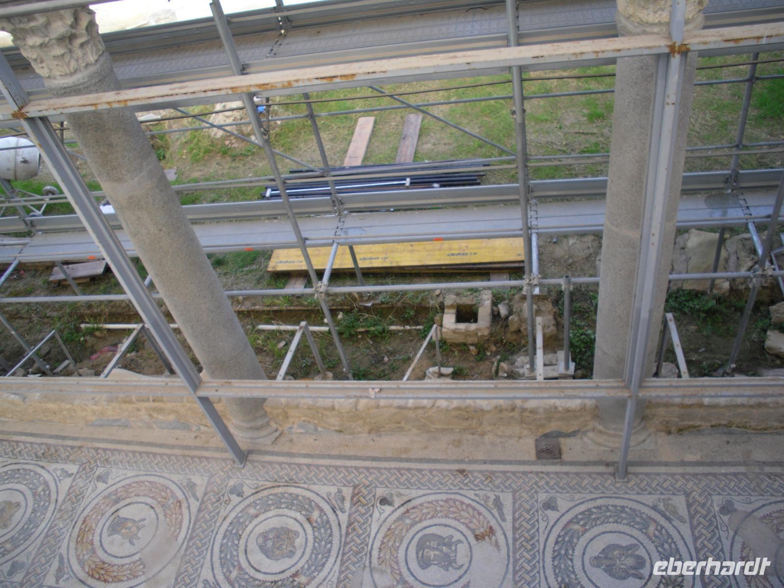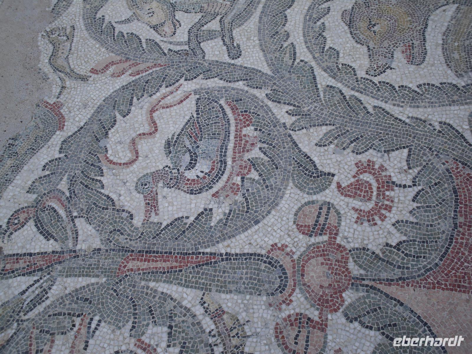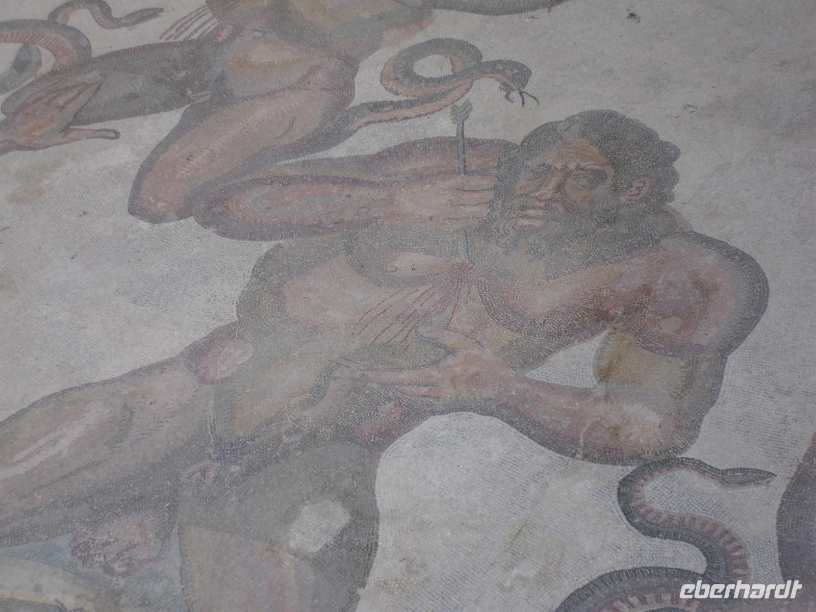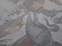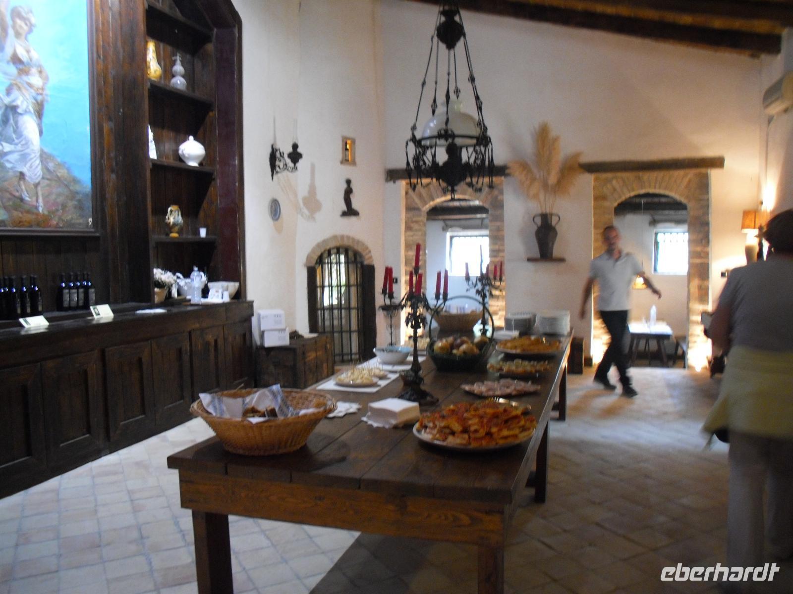 dem Ruhebedürfnis usw. Besonders interessant sind die Thermen, die mehrere Räume einnehmen und außer den Mosaiken Spuren des Wasserversorgungsystems der Villa aufweisen und die Herrschaftszimmer der Villa, in denen sich unter anderem eine Darstellung von Odysseus und Polyphem sowie die berühmte „erotische Szene“ befinden. Nach der Besichtigung eines Teils der Villa fahren wir direkt weiter an die Südküste Siziliens - über Gela erreichen wir gegen 15 Uhr das herrliche Weingut "Tenuta La Lumia" in der Nähe von Licata. Dort werden wir herzlich empfangen und machen erst einmal eine kleine Weinkellerbesichtigung - eigentlich haben wir langsam Hunger und jeder wartet auf den Mittagsimbiss, den wir dort einnehmen werden...! Für uns Deutsche ist es für ein Mittagessen schon wieder verdammt spät! Wir verkosten drei Weine zum Essen und gut gelaunt erreichen wir dann am späten Nachmittag unser Hotel „Baia di Ulisse“ in San Leone. Das Hotel liegt oberhalb der Küste und wir haben von hier einen herrlichen Blick auf das Meer.