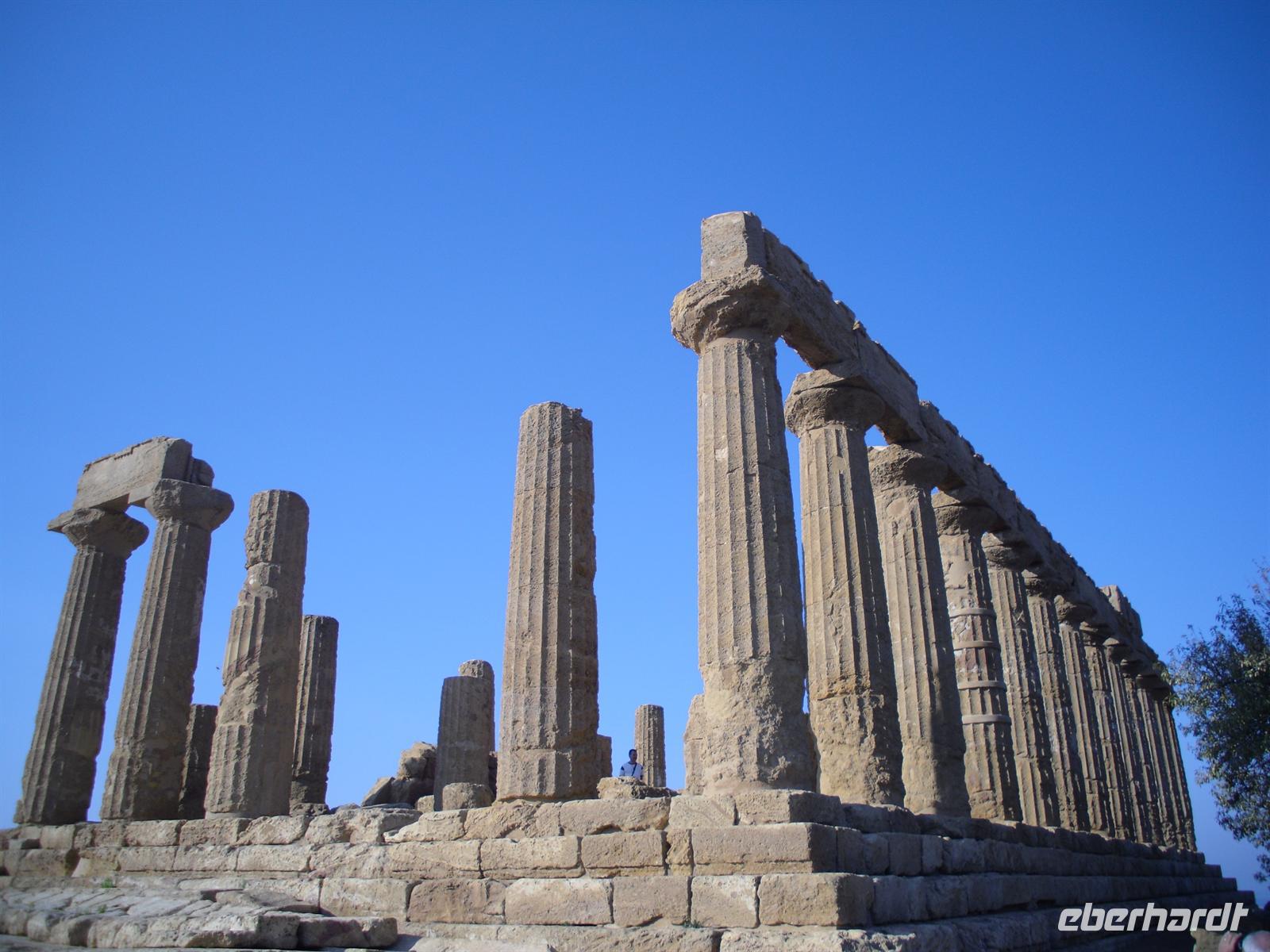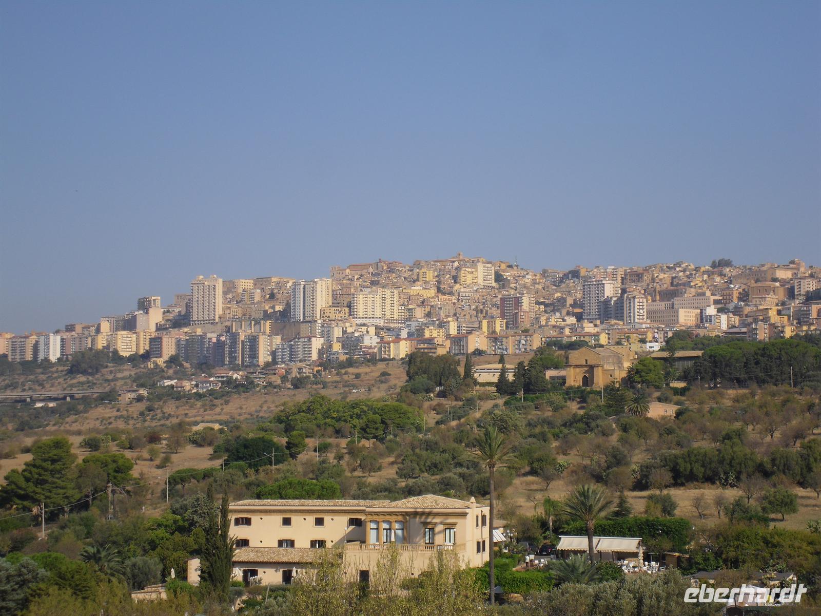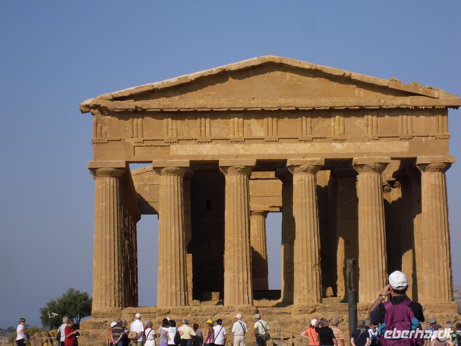 Noch heute hat sich fast nichts an der Landschaft, die Goethe im 18. Jahrhundert bestaunte, geändert und das Tal der Tempel ist der bekannteste und meist bewunderte Teil Agrigents. Die sich hier befindenden Monumente sind all das, was von der antiken Stadt Akragas übriggeblieben ist, welche im 6. Jahrhundert v. Chr. von Siedlern aus Gela gegründet wurde. Die heiligen Tempel und vor allem der des Zeus bezeugen den Glanz der Stadt zu jener Zeit. Die anderen Tempel wurden in Brand gesteckt oder zerstört, da die Stadt verschiedene Male erobert wurde. Der Zeustempel blieb ohne Dach, da der Bau durch einen Krieg unterbrochen wurde, und nachdem die Stadt arg gelitten hatte, waren die Agrigentiner nicht mehr imstande, den Bau fortzuführen. Wir sehen auch den berühmten Concordiatempel. Der Name des Tempels ist völlig zufällig, da er ihm verliehen wurde, als man eine römische Inschrift darin fand, die sich auf die Einweihung eines Heiligtums zu Ehren der Eintracht zwischen Agrigent und Lilibeo bezog, aber mit dem Tempel selbst in keiner Beziehung steht. Der hervorragende Erhaltungszustand ist einem glücklichen Zufall zu verdanken - im Gegensatz zu den anderen heidnischen Tempeln, die der Aberglaube und die Ignoranz der Christen zerstören wollten, wurde dieser im 15. Jahrhundert in eine dem heiligen Georg geweihte Kirche umgewandelt. Bei dieser Gelegenheit wurden die Bögen an den Mauern der Cella sowie andere Veränderungen angebracht, diese „Konversion“ ermöglichte immerhin seine Erhaltung.