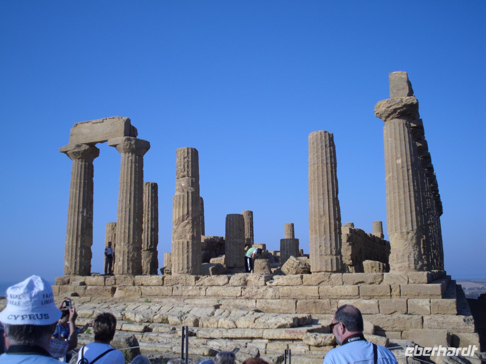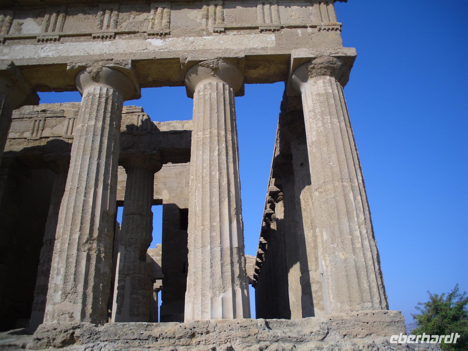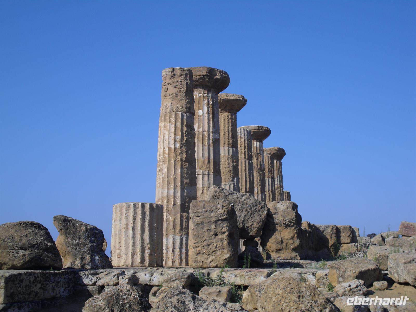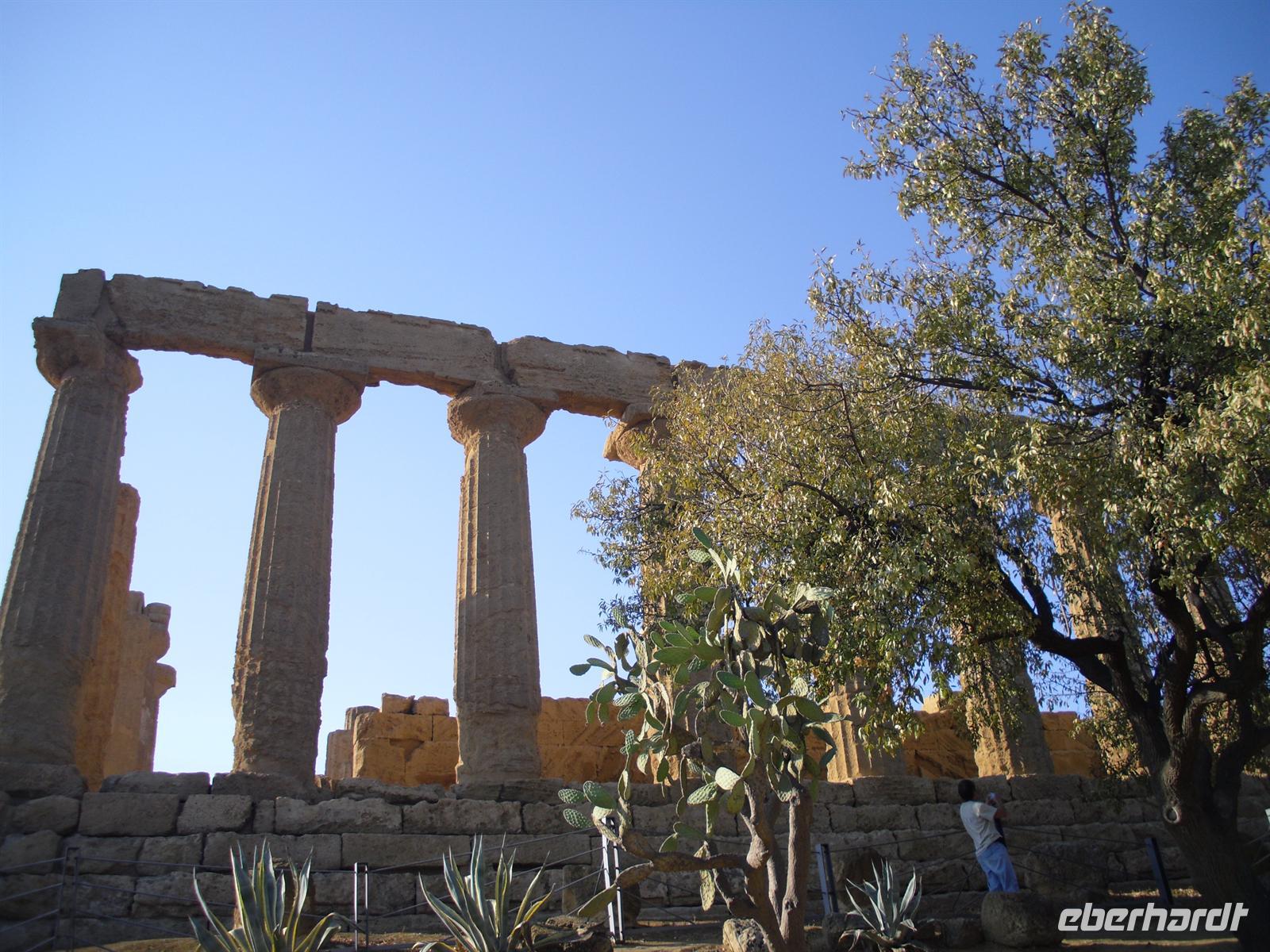 Noch heute hat sich fast nichts an der Landschaft, die Goethe im 18. Jahrhundert bestaunte, geändert und das Tal der Tempel ist der bekannteste und meist bewunderte Teil Agrigents. Die sich hier befindenden Monumente sind all das, was von der antiken Stadt Akragas übriggeblieben ist, welche im 6. Jahrhundert v. Chr. von Siedlern aus Gela gegründet wurde. Die heiligen Tempel und vor allem der des Zeus bezeugen den Glanz der Stadt zu jener Zeit. Die anderen Tempel wurden in Brand gesteckt oder zerstört, da die Stadt verschiedene Male erobert wurde. Der Zeustempel blieb ohne Dach, da der Bau durch einen Krieg unterbrochen wurde, und nachdem die Stadt arg gelitten hatte, waren die Agrigentiner nicht mehr imstande, den Bau fortzuführen. Wir sehen auch den berühmten Concordiatempel. Der Name des Tempels ist völlig zufällig, da er ihm verliehen wurde, als man eine römische Inschrift darin fand, die sich auf die Einweihung eines Heiligtums zu Ehren der Eintracht zwischen Agrigent und Lilibeo bezog, aber mit dem Tempel selbst in keiner Beziehung steht. Der hervorragende Erhaltungszustand ist einem glücklichen Zufall zu verdanken - im Gegensatz zu den anderen heidnischen Tempeln, die der Aberglaube und die Ignoranz der Christen zerstören wollten, wurde dieser im 15. Jahrhundert in eine dem heiligen Georg geweihte Kirche umgewandelt. Bei dieser Gelegenheit wurden die Bögen an den Mauern der Cella sowie andere Veränderungen angebracht, diese „Konversion“ ermöglichte immerhin seine Erhaltung.