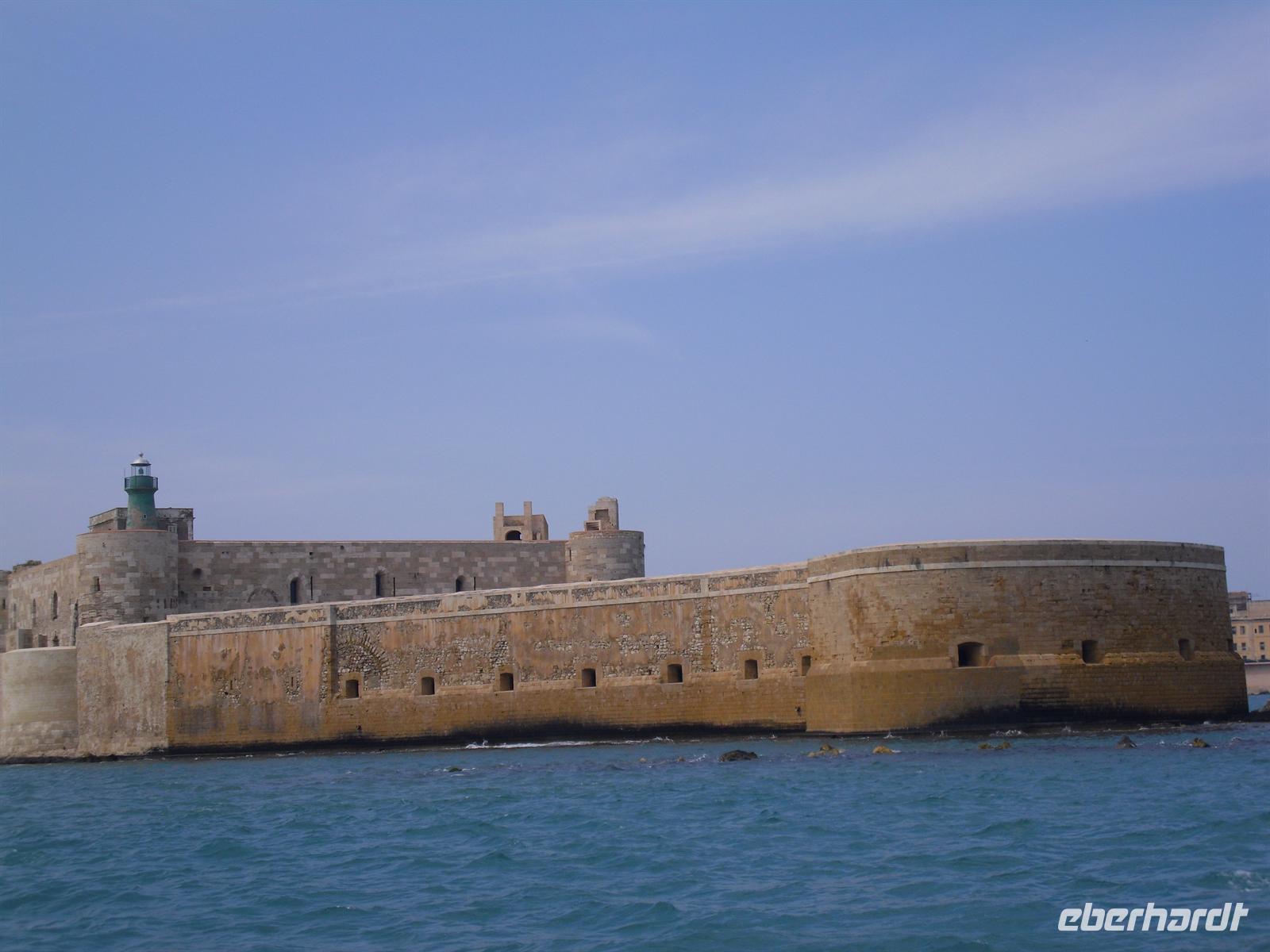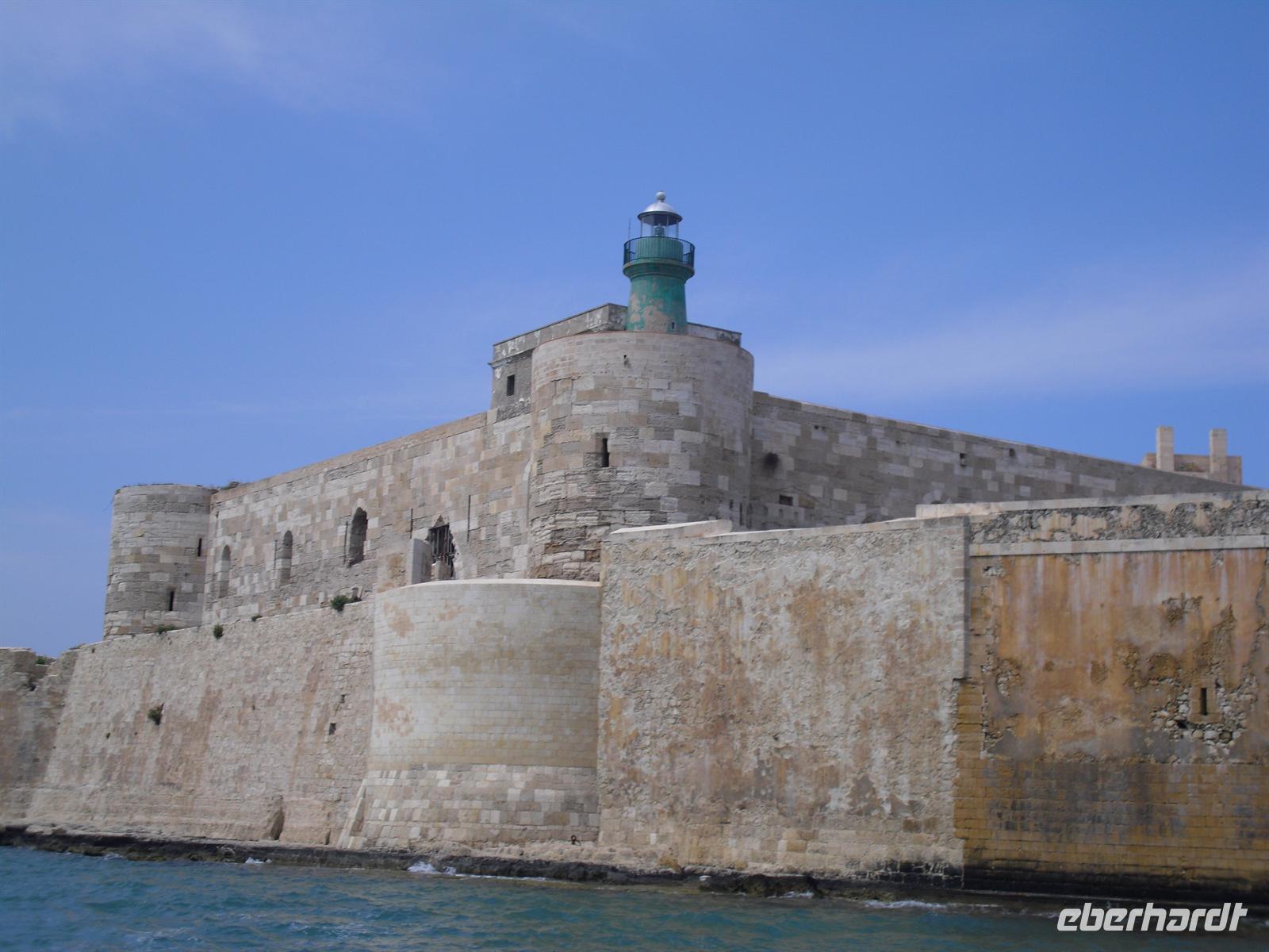 Die Sage berichtet, dass sich die Nymphe Arethusa ins Meer stürzte, um dem heftigen Liebeswerben des Alphios zu entgehen. Die Göttin Arthemis verwandelte sie daher aus Mitleid in eine Quelle, die in Griechenland im Erdboden verschwand und diesseits des Meeres in Ortigia wieder zum Vorschein kam. Alphios seinerseits wurde in einen Fluss verwandelt. Doch half dies nicht, ihn von der geliebten Nymphe fernzuhalten. So durchflossen auch seine Wasser das Meer, um nicht weit von der Arethusa entfernt in einem sprudelnden Quell dem Boden zu entspringen. Hier endet unsere Stadtführung und wir haben noch etwas Freizeit, bevor wir am frühen Nachmittag in See stechen. Während einer einstündigen Schiffsrundfahrt nehmen wir unser Mittagessen ein - für manch einen von uns eine totale Umstellung, Mittagessen um 14.15 Uhr?, für Sizilianer ist diese Zeit durchaus völlig normal - andere Länder, andere Sitten! Es gibt Antipasti, also eingelegte Kleinigkeiten in Olivenöl und Pizza, dazu natürlich auch Wein, einfach lecker! Das Wetter ist phantastisch und so genießen wir die Fahrt in vollen Zügen. Besonders sehenswert ist das imposante Castello Maniace, das auf Geheiß Friedrich II. im 13. Jahrhundert erbaut wurde. Am späten Nachmittag fahren wir mit vielen ersten Eindrücken von der Insel nach Giardini Naxos zurück.