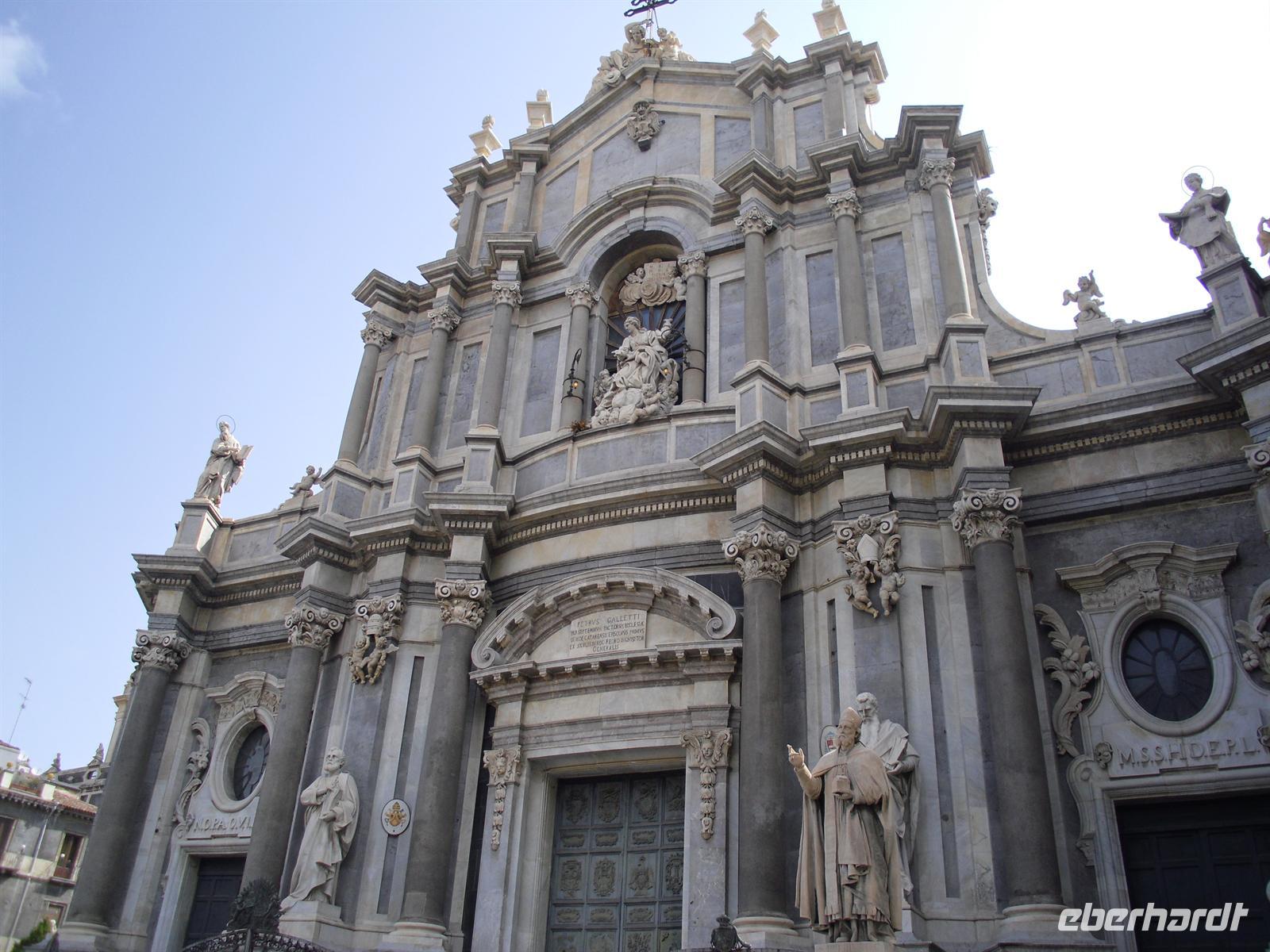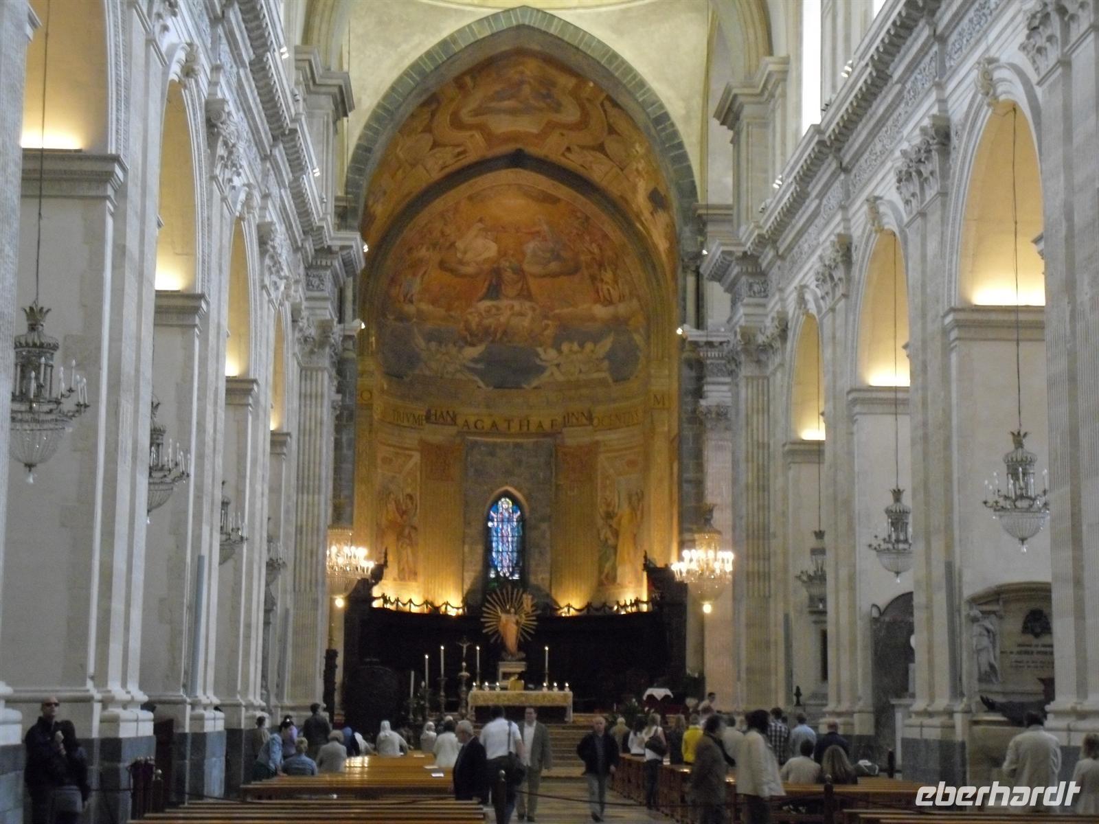 Man muss sich vorstellen, dass die gewaltigen Lavaströme beim Ausbruch des Ätna im Jahre 1669 das Antlitz der Küste verwandelte, und das im 13. Jahrhundert von Stauferkönig Friedrich II. erbaute Schloß Ursino, einstmals nahe der Küste mit wunderbarem Blick über das Meer gelegen, nach dem Ausbruch von Lava umgeben war. Heute befindet sich dieses Castel inmitten der Altstadt und auf der erstarrten Lava baute man Häuser. Aber was „il monte“ nahm, das gab er der Stadt auch - die prächtigsten Palazzi und Kirchen und selbst das Straßenpflaster ist aus schwarzem Lavastein. Wir haben nun etwas Freizeit und die meisten von uns besuchen den Fischmarkt! Das Angebot ist super - Artischocken, Fenchel, Fische und Meeresfrüchte aller Art, dazu typisches sizilianisches Markttreiben - das muss man unbedingt gesehen haben! Bevor wir Catania verlassen, besuchen wir noch den Dom. Dieser ist der heiligen Agata, der Schutpatronin der Stadt, geweiht - ihre Reliquien sind hier aufbewahrt. Er ist nach 1693 auf dem Grundriss einer normannischen Vorgängerkirche errichtet worden, von der nur Teile des Querhauses und die Chorapsiden stehen geblieben waren.