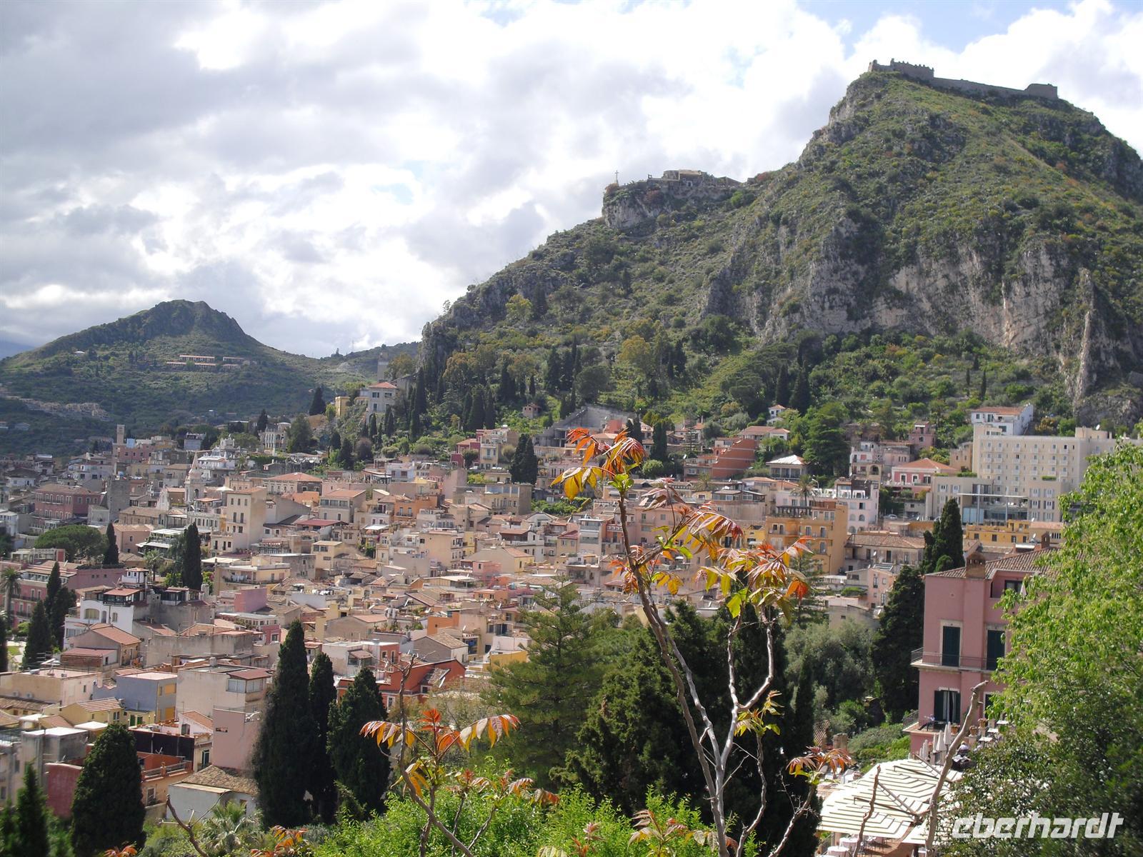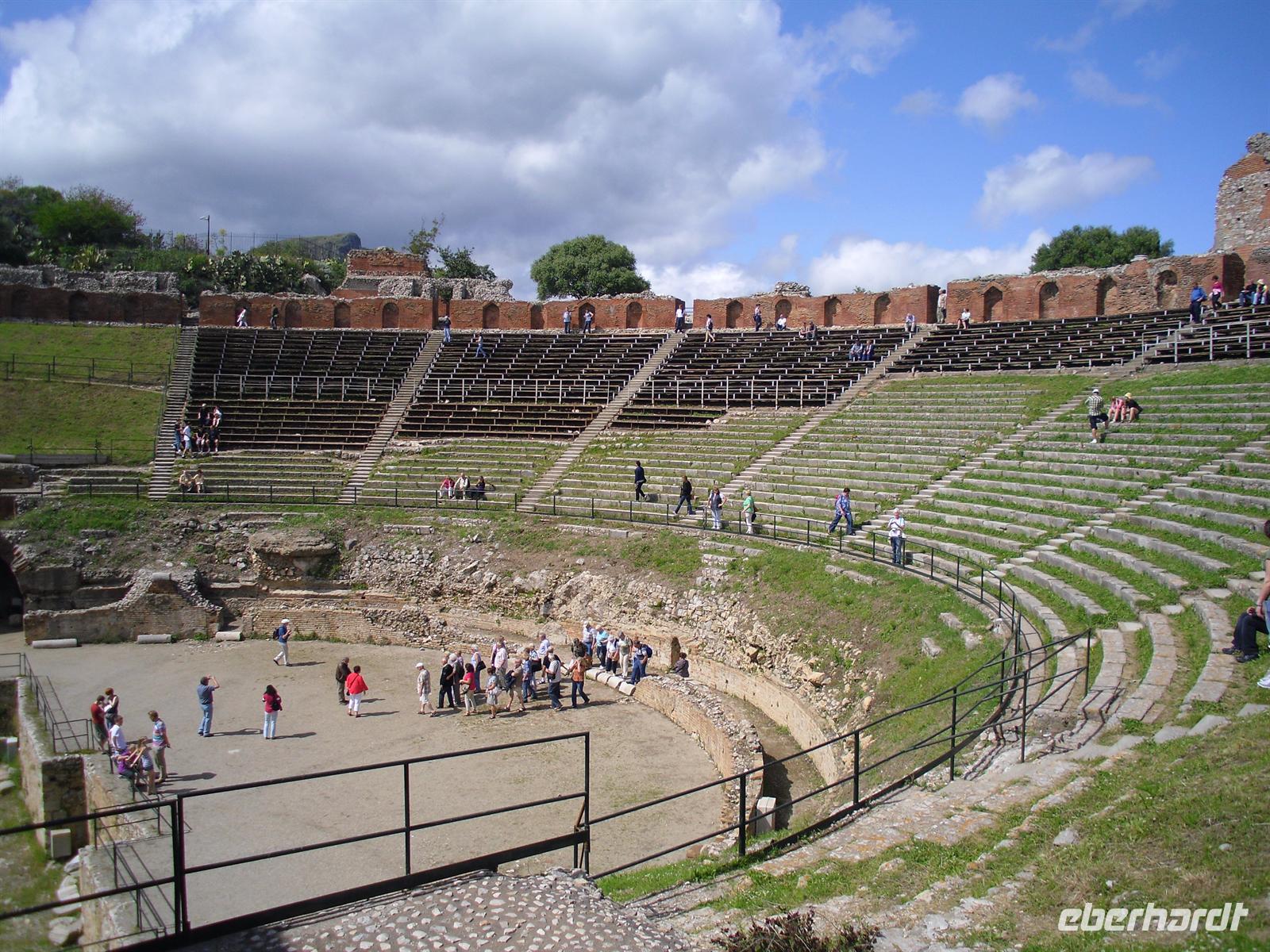 Am frühen Nachmittag erreichen wir dann Taormina. Taormina ist unumstritten Siziliens elegantester Ferienort, auch „Perle des Ionischen Meeres“ genannt. Enge mittelalterliche Gässchen, die sich an den Hang des Monte Tauro schmiegen, der Blick auf den oftmals schneebedeckten Ätna und elegante Luxushotels, von deren Terrassen man auf die wunderschöne Küste hinab schaut, sorgen für ein einzigartiges Flair. Wir besuchen natürlich Taorminas griechisches Theater mit dem herrlichen Panorama, unten Küste und tiefblaues Meer und in der Ferne der mächtige Gipfel des Ätna - einfach gigantisch! Das Theater ist nach dem in Syrakus das zweitgrößte Siziliens und wurde in griechischer Zeit errichtet, die Römer erweiterten es später und bauten es um.