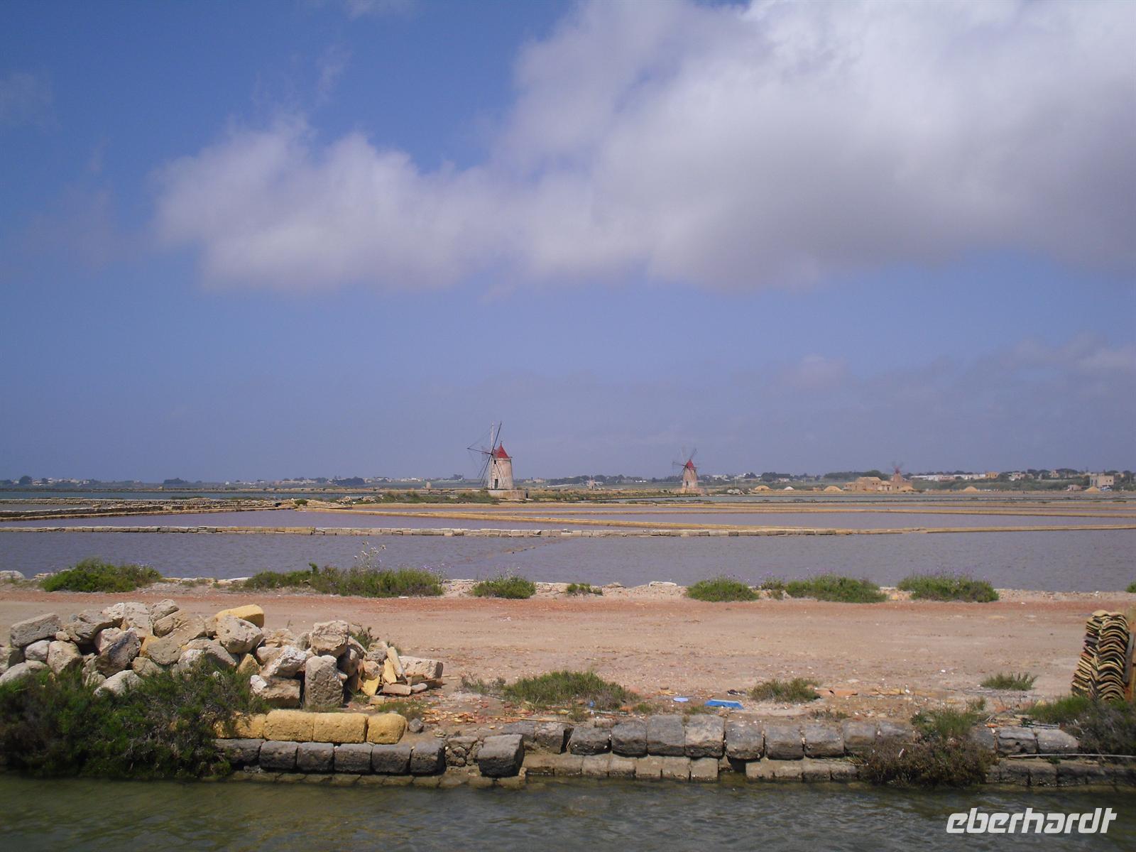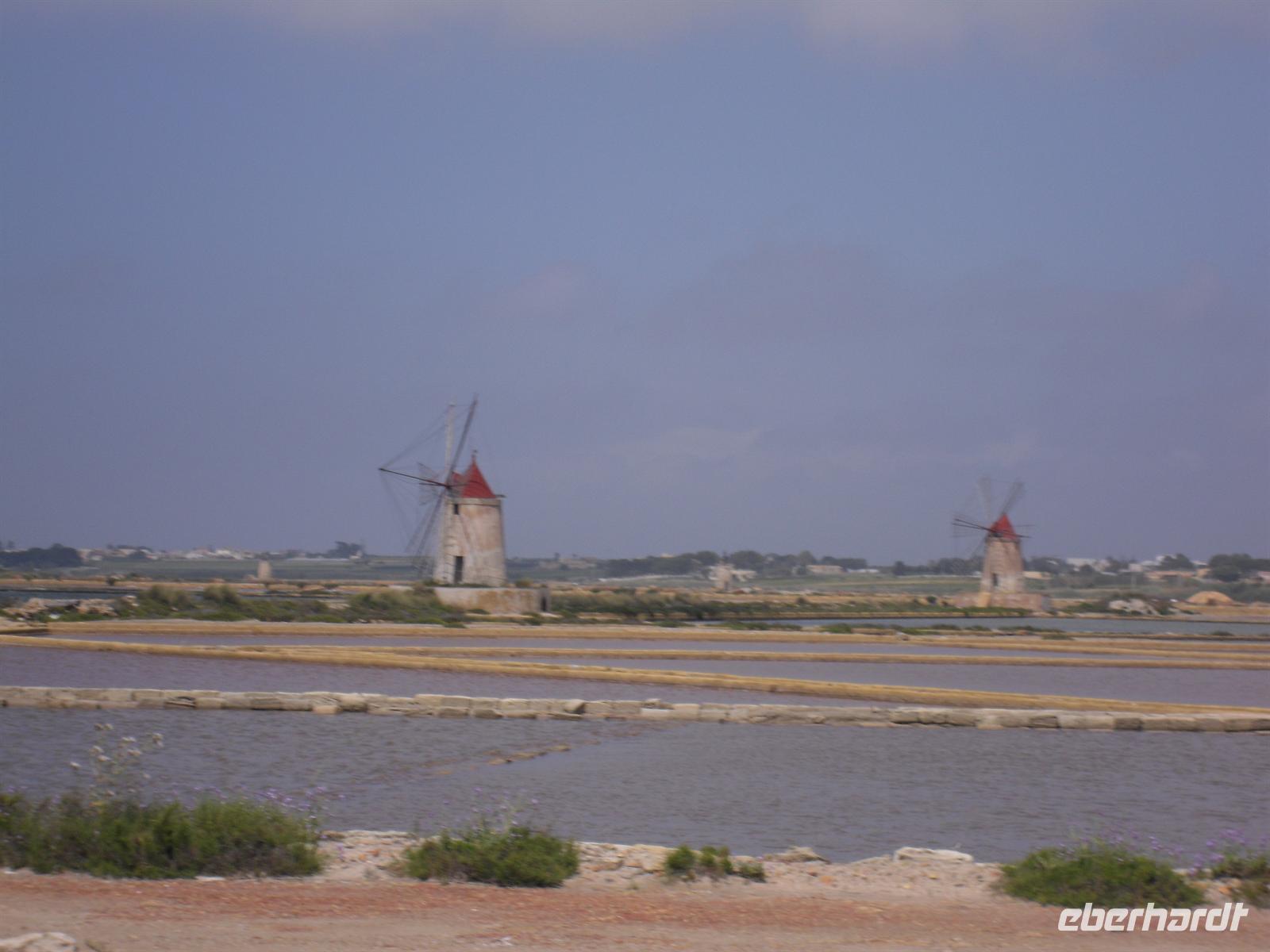 Erst Ende des 18. Jahrhunderts wurde dem Gebäude, abgesehen von den Bögen, seine antike und einzigartige Form zurückgegeben. Nach einer etwa 2-stündigen Führung im Tal der Tempel erwartet uns unser Bus und wir fahren weiter entlang der Südküste über Sciacca, Castelvetrano, Mazara del Vallo nach Marsala an der Westküste Siziliens. Nach Westen läuft Sizilien ganz flach ins Meer aus. Wir erreichen Cap Lilibeo, den westlichsten Punkt der Insel Sizilien, von hier aus sind es nur etwa 140 Kilometer bis nach Afrika und hier erinnert eine Gedenksäule an die Landung Giuseppe Garibaldis und seiner tausend Gefährten am 11. Mai 1860, die den Zusammenbruch des Bourbonen-Königreiches von Neapel und Sizilien und die Einigung Italiens einleitete. Hier in Marsala legen wir eine Mittagspause ein. Anschließend führt uns unser Weg entlang der Salzstraße; der lange, heiße Sommer und die fast immer vorhandene Brise begünstigen die Industrie, die hier seit Jahrhunderten im Einklang mit der Natur aus Wasser, Sonne, Wind und menschlicher Arbeit Salz gewinnt.