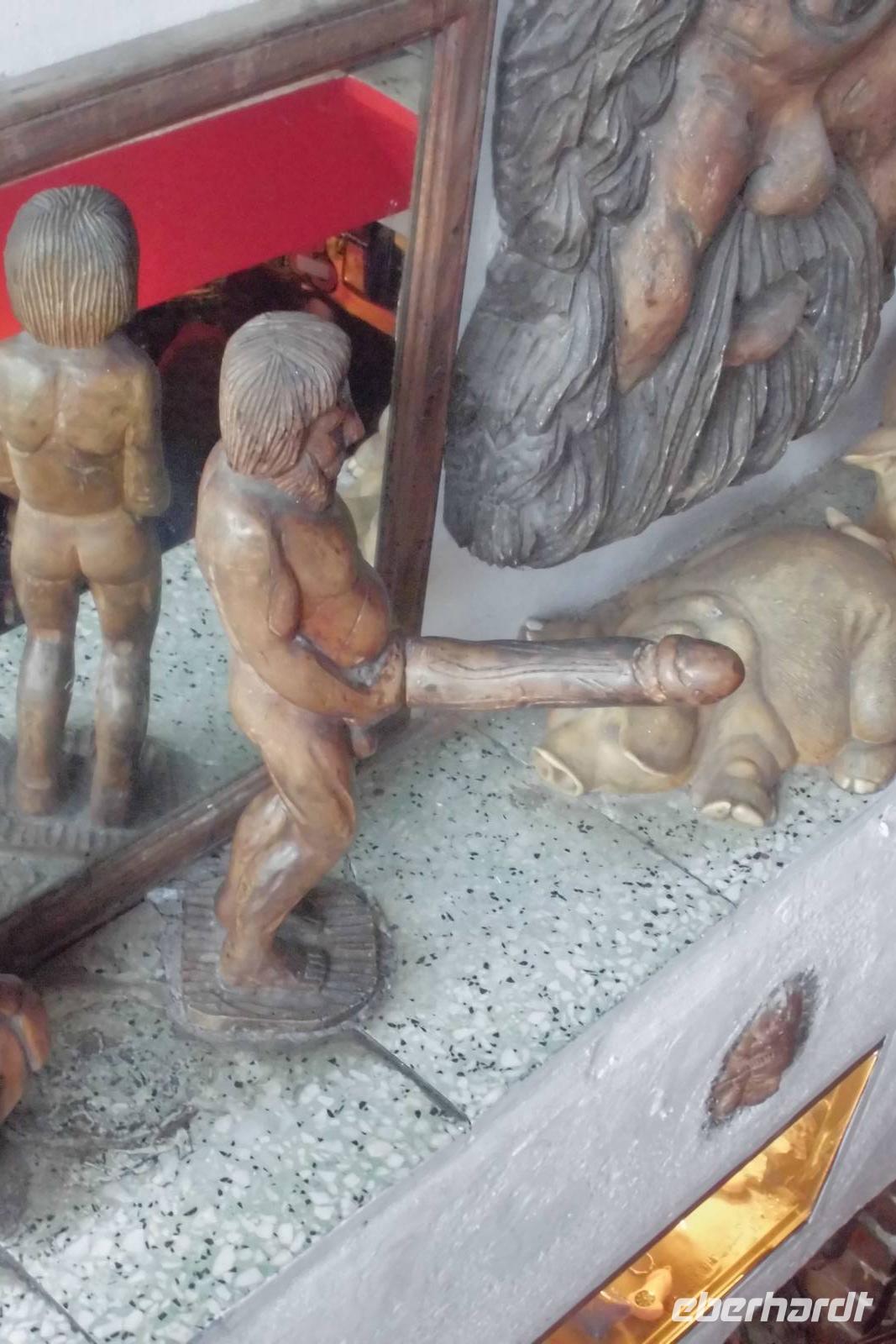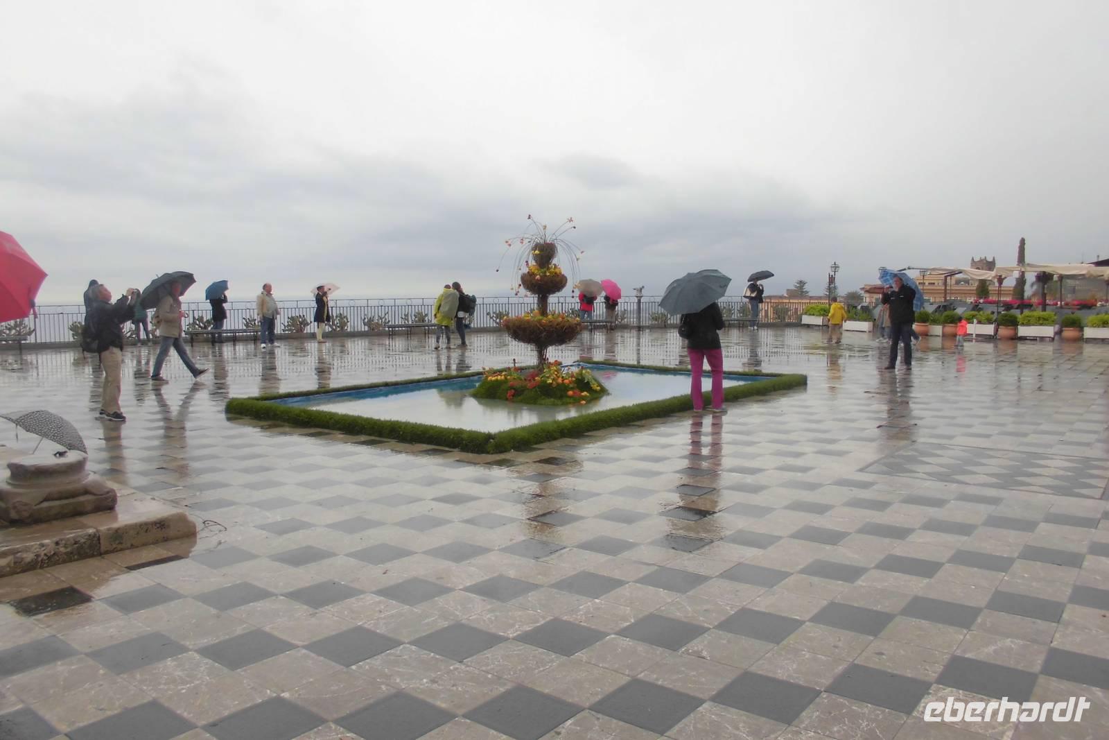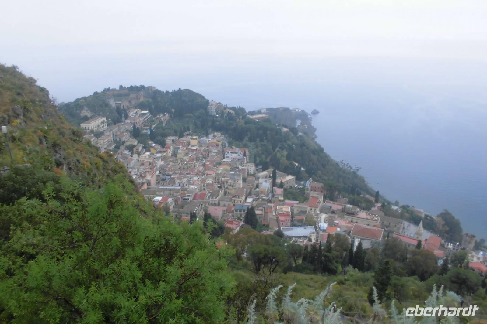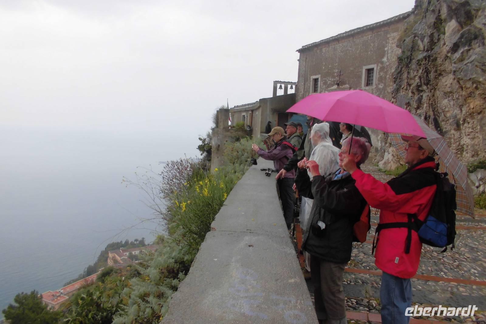 Nachdem wir uns bei einem ausgiebigen Frühstück gestärkt haben, steht die erste Wanderung auf dem Tagesplan. Etwas skeptisch stehen wir am Rand des offenen Innenhofes unseres Hotels und beobachten den anhaltenden Regen. Nach kurzer Überlegung beschließen wir jedoch einstimmig, die Wanderung anzugehen. Gemeinsam fahren wir in unserem Bus entlang der sogenannten Zyklopenküste, Hermann erzählt erst einmal viel aus der Sagenwelt des Odysseus und wir lassen unsere Gedanken schweifen. Knapp eine Stunde Fahrzeit benötigen wir, ehe sich das hochgelegene Taormina uns dann endlich präsentiert. Wir halten etwas unterhalb der Stadt uns beginnen die Wanderung am Stadtpark, welcher durch reichhaltige und uns teilweise unbekannte Flora beeindruckt. Hermann führt uns durch die kleinen Gassen hin zum Griechischen Theater, dem bekannten Wahrzeichen der Stadt. Auch während der kurzen Führung reißt das Regenband nicht ab. Die weltbekannte Kulisse mit dem Ätna im Hintergrund können wir nur erahnen. Nachdem jeder noch die Möglichkeit für eigene Erkundungen hat, starten wir hinauf nach Castelmola. Ein schier endloser Treppenweg liegt vor uns, doch weder davon noch vom Regen lassen wir uns abhalten. Nach 2 Stunden Aufstieg erreichen wir das kleine Bergdorf und flüchten in ein Café, jedoch nicht in ein Gewöhnliches ;-). Hermann zeigt uns ein Kleinod, welches durch seine extravagante Ausstattung auffällt - überall Phallussymbole, an den Wänden und auf den Tischen, sogar als Lampenschirmhalter. Spätestens hier hat jeder wieder gute Laune und das schlechte Wetter ist vergessen. Aufgrund des anhaltenden Regens entschließen wir uns hier jedoch, den Aufstieg auf den Veneretta ausfallen zu lassen und lieber noch etwas von dem sehr guten und typischen Mandellikör zu trinken. Das wärmt und die ersten von uns haben schon ein Souvenir. Auf dem Rückweg lassen wir uns auf halber Strecke vom Bus abholen und sind nachmittags froh, eine warme Dusche genießen zu können.
