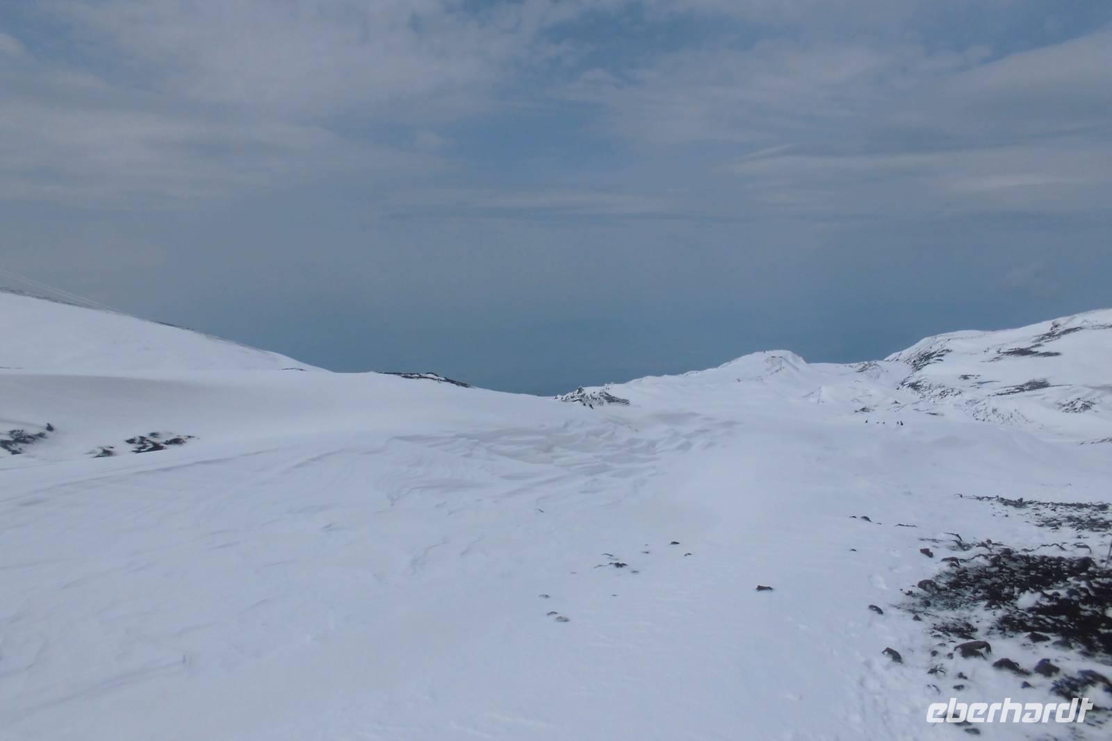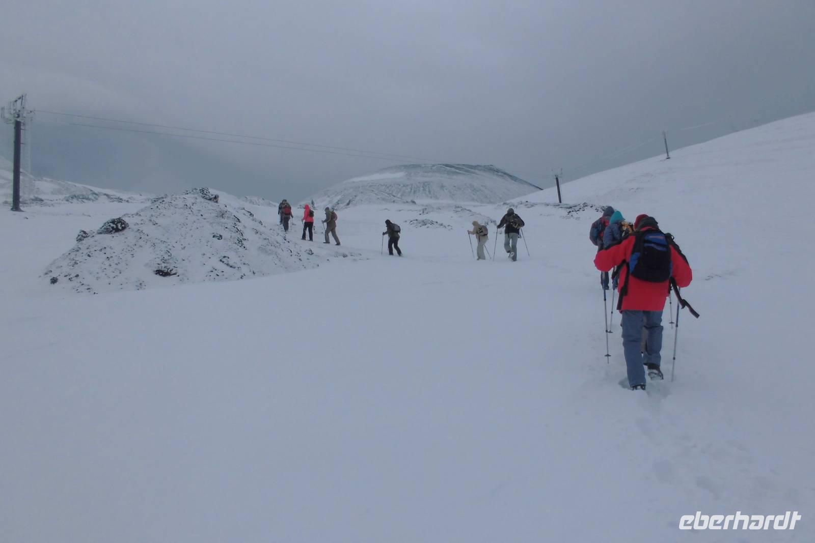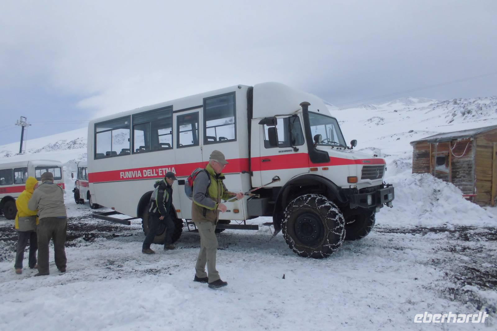 Das Highlight unserer Reise wartet heute auf uns und auch der Wettergott scheint es gut mit uns zu meinen. Es ist bewölkt, aber trocken. Wir starten zeitig, fahren mit dem Bus über Zaffarena hinauf zur Talstation. Zu unserem Entsetzen steht die Seilbahn still...und nun??? Plan B! Wir fahren mit Unimogs, riesigen Geländewagen hinauf, bis der Schnee jeglichen Weg versperrt. Die Wanderung beginnt an der Bergstation, wir stapfen durch Tiefschnee in 2600m Höhe. Der Wind pfeift und gibt einem das Gefühl von minus 20 Grad Lufttemperatur. Doch das Laufen macht warm und so machen wir Meter um Meter. Da eine Kraterbesteigung wetterbedingt nicht möglich ist, laufen wir quer zum Hang, bis wir irgendwann, begleitet von der Sonne einen atemberaubenden Blick auf Catania und die Insel genießen können. Zurück an der Bergstation begrüßt uns Hermann mit Ätnafeuer und uns wird sowohl von innen als auch von außen wieder warm. Wir stärken uns an der Hütte, wärmen uns auf, ehe wir mit der nun mittlerweile in Betrieb genommenen Seilbahn wieder zur Talstation fahren. Hermann schlägt eine Alternativwanderung zum Ochsental vor und wir folgen im bereitwillig. Der Weg ist hügelig, links und rechts zeigt sich die einzigartige Vegetation an den Flanken des Vulkans. Nach gut anderthalb Stunden Laufweg erreichen wir unser Ziel, einen riesigen Geländeabbruch, welcher mit Lavamassen von diversen Ausbrüchen gefüllt ist. Lange genießen wir den Ausblick und die Ruhe. Auf dem Rückweg zeigt sich die Sonne dann auch länger, sodass wir das erste Mal „südländisches" Wetter genießen dürfen.