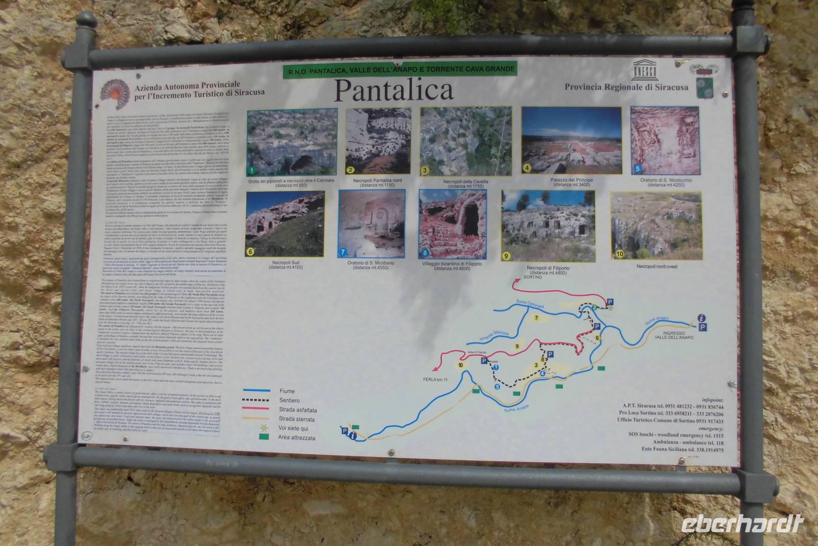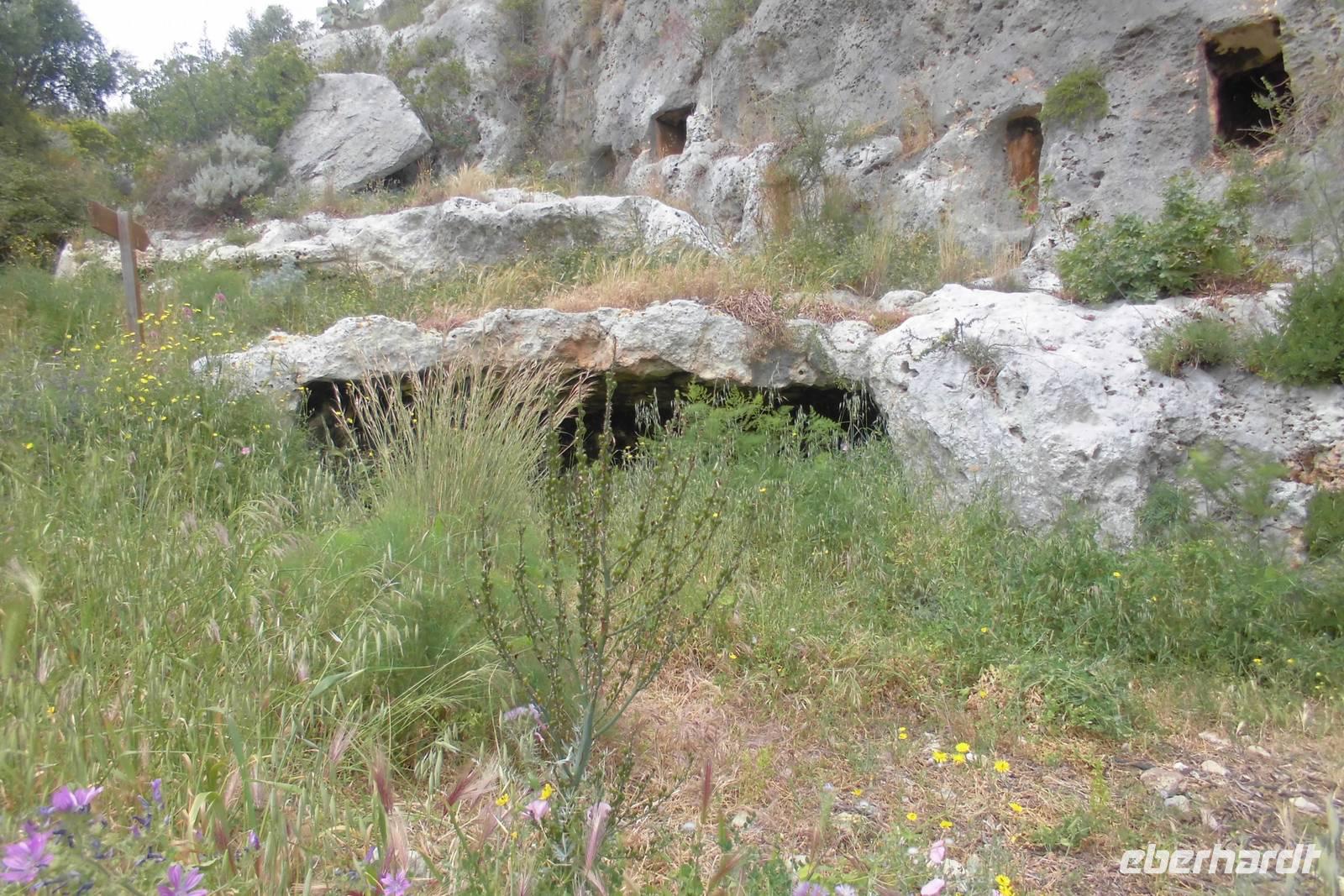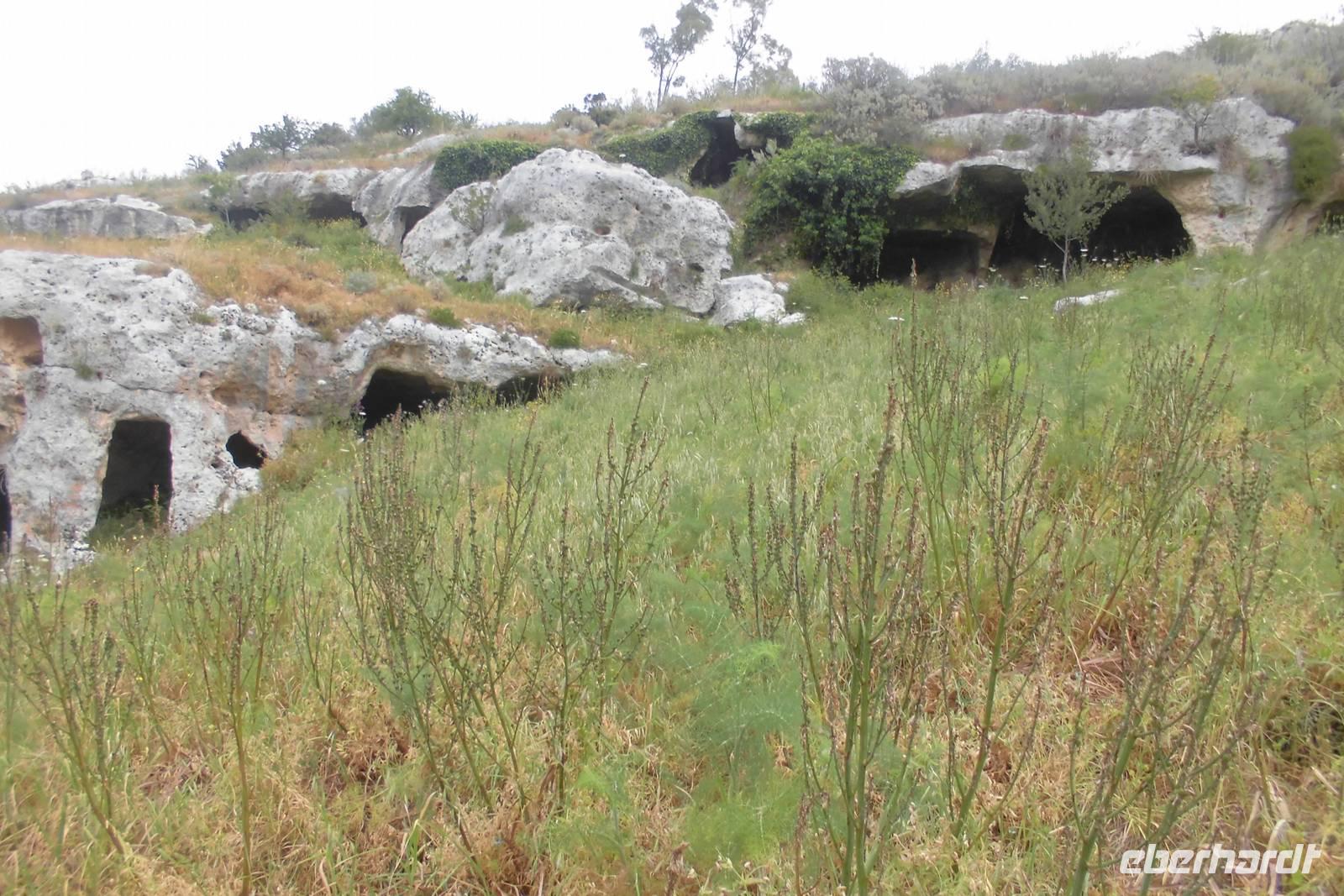 Der heutige Tag beginnt mit einer langen Busfahrt in das sizilianische Hinterland. Es zeigt sich, dass die kleine Gruppe und somit auch der kleine Bus hier ein großer Vorteil ist. Der Zugang zum Nationalpark ist nur über eine enge und staubige Straße, eher ein Feldweg, zu erreichen. Am Eingang zeigt Hermann uns kurz an einer Schautafel, welcher Weg vor uns liegt. Wir laufen oberhalb eines Canyon, ehe wir auf schmalen Wegen immer tiefer hinabsteigen. Um uns herum scheint die Vegetation zu explodieren. Trotz des eher trockenen Bodens, wachsen überall üppige Sträucher und Gräser, hier und da schimmert eine farbige Blumenblüte. In den Felsen sind hunderte Behausungen und alte Gräber zu erkennen. Wir folgen dem Flusslauf des Anapo, welcher sich durch das Tal schlängelt. Am Wegesrand können wir unseren Proviant sogar mit saftigen Orangen auffüllen. Der Rückweg nach Anaktoron verläuft dann anders als erwartet. An einer Flussquerung rutscht eine Wanderfreundin aus und verletzt sich. Nachdem Hermann erste Hilfe gerufen hat, bleibt nur noch der schwere Weg ins Krankenhaus - Beinbruch. Auf diesem Weg natürlich nochmals gute Besserung. Reiseleiter Hermann und Reisebegleitung Anne wechseln sich nun in den nächsten Tagen ab, sodass immer jemand im Krankenhaus von Syrakus ist, um sprachlich zu helfen.