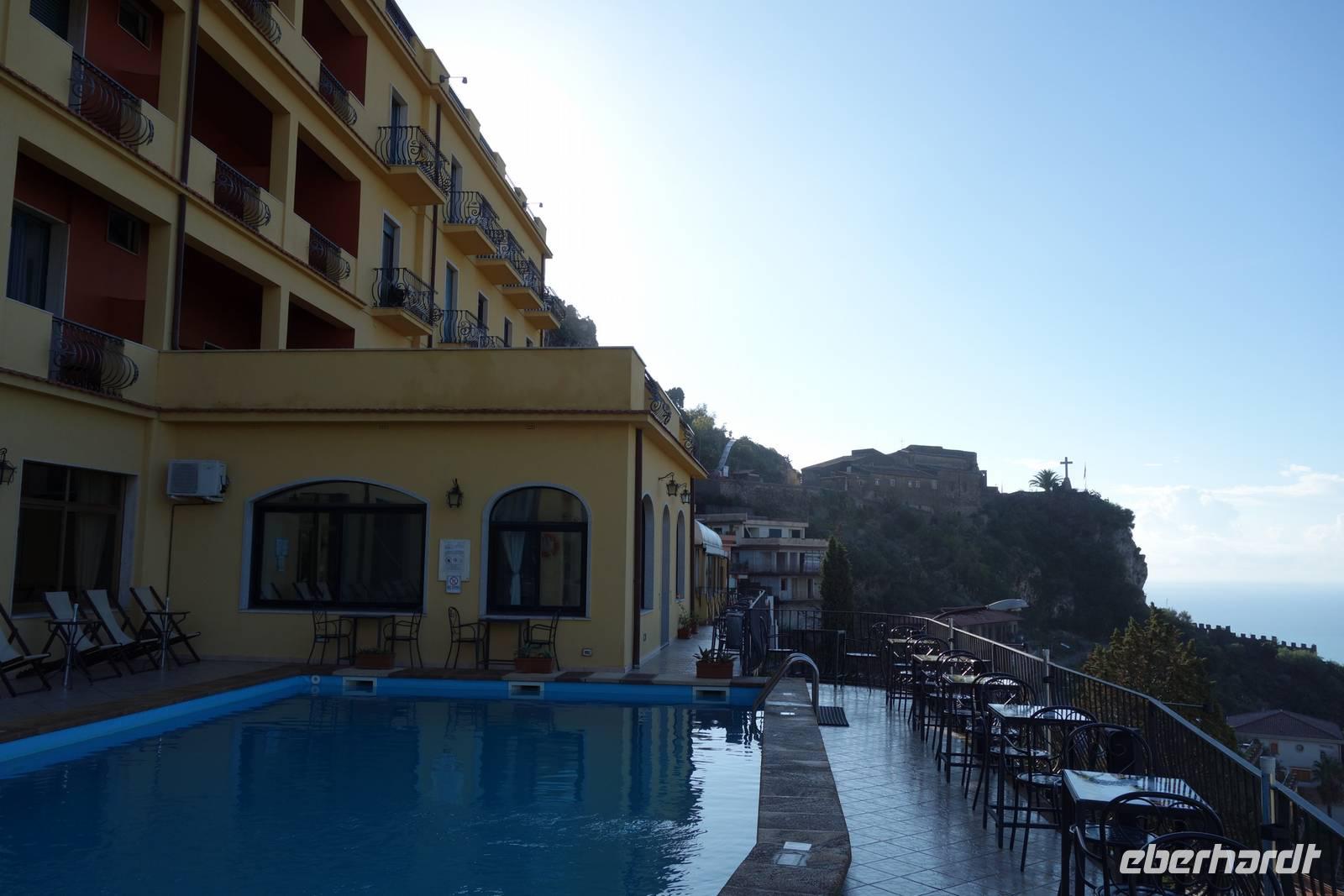 Pia, unsere Reiseleiterin, fand uns ohne Probleme am Flughafen und so fuhren wir etwa eine Stunde, vorbei an Eukalyptuspflanzen, Kaktusfeigen und Orangenplantagen, zum Hotel Sole Castelo, was wirklich wunderschön idyllisch auf einem Hügel in Taormina lag.