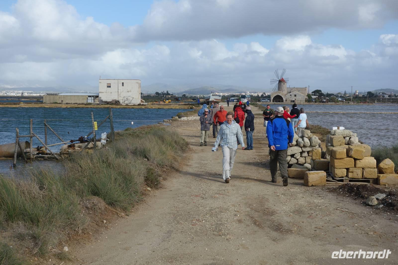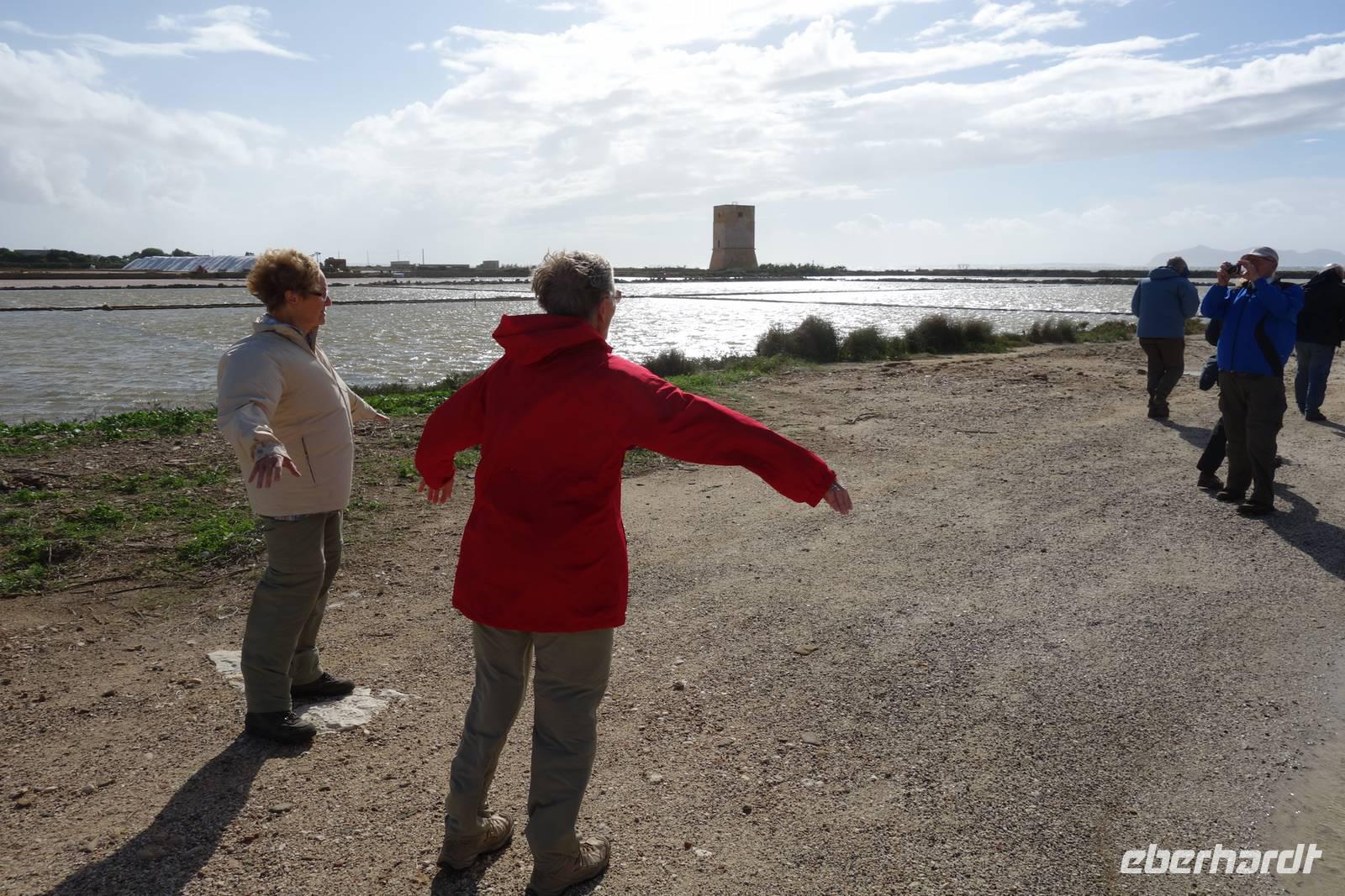 Da die geplante Wanderung danach buchstäblich ins Wasser fiel, beschlossen wir, einen kleinen Umweg über Trapani zu nehmen, um uns eine alte Saline anzusehen. Beim vorbeifahren auf der Hinfahrt, waren uns schon die riesigen weißen Salzberge aufgefallen, aber aus der Nähe, waren sie noch größer. Hier, in Trapani schien sogar die Sonne, und ließ die Salzkristalle strahlen. Dazu kam ein Sturm, der uns die letzten Locken aus den Haaren blies- aber dafür allen, ein Lachen ins Gesicht zauberte. Was für ein gelungenes Alternativprogramm!