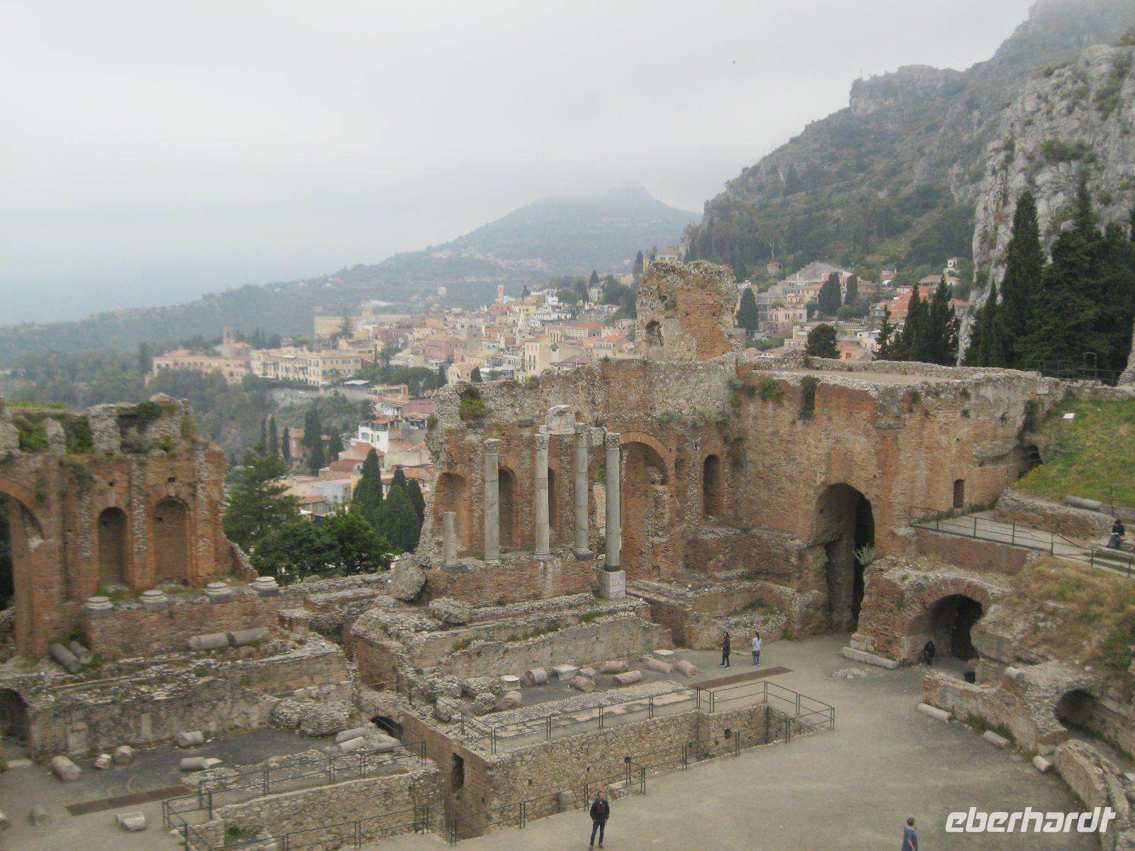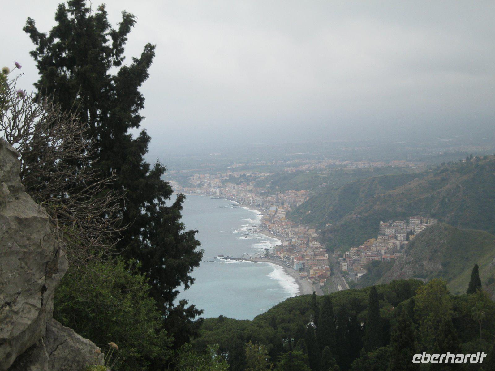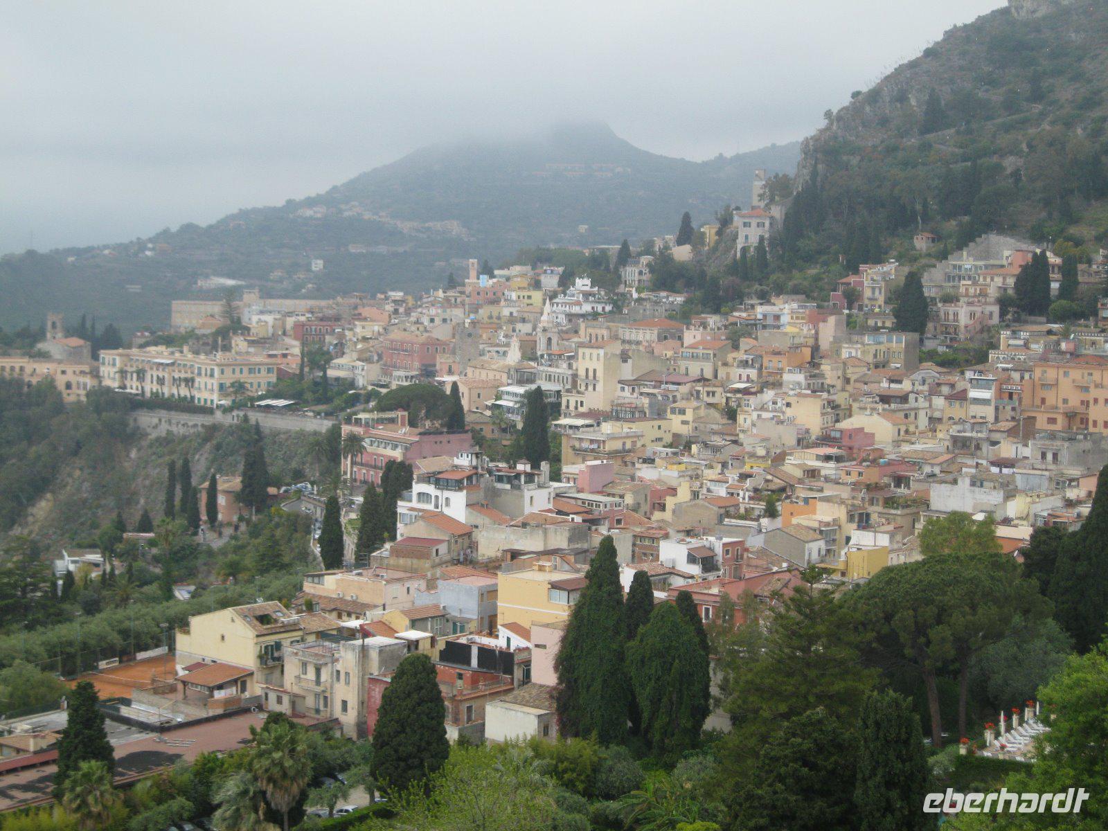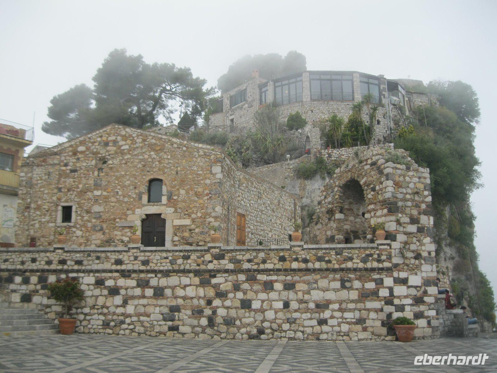 Abenteuerlich ging es mit unserem Bus hinauf nach Castelmola. Das fahrerrische Können unseres Marco war gefragt aber er meisterte es mit Ruhe und Bravour. Vom Parkplatz ging es über Geröll, steil hinauf zum Monte Venere (885 m). Leider war es mit der schönen Aussicht bald vorbei. Nebel hüllte uns in immer dichtere Schwaden ein. Es wurde unangenehm feucht und kalt. Wir beschlossen kurz vor dem Gipfel abzubrechen. Zurück in Castelmola spazierten wir durch die verwinkelten Gassen. Leider war die Zeit etwas kurz aber wir wollten ja noch in Taormina das griech.-röm. Theater (Teatro Greco) besuchen. Leider vermasselte uns auch hier wieder der Nebel das Postkartenmotiv zum Ätna. Nach dem Bummel durch den Botanischen Garten genossen wir das quirlige, touristiche Leben in dieser so historishen Stadt bei einem Espresso und Gelati.