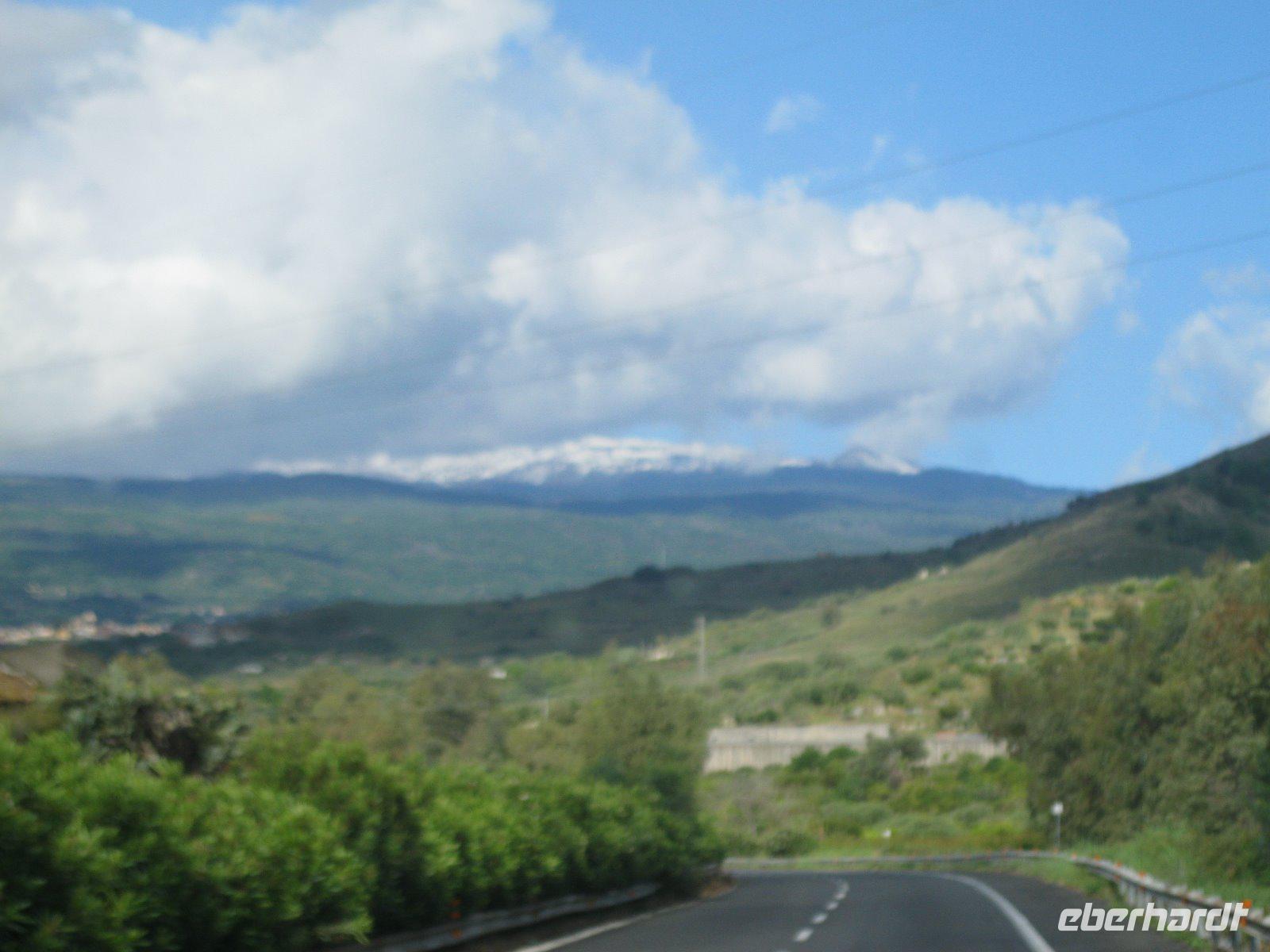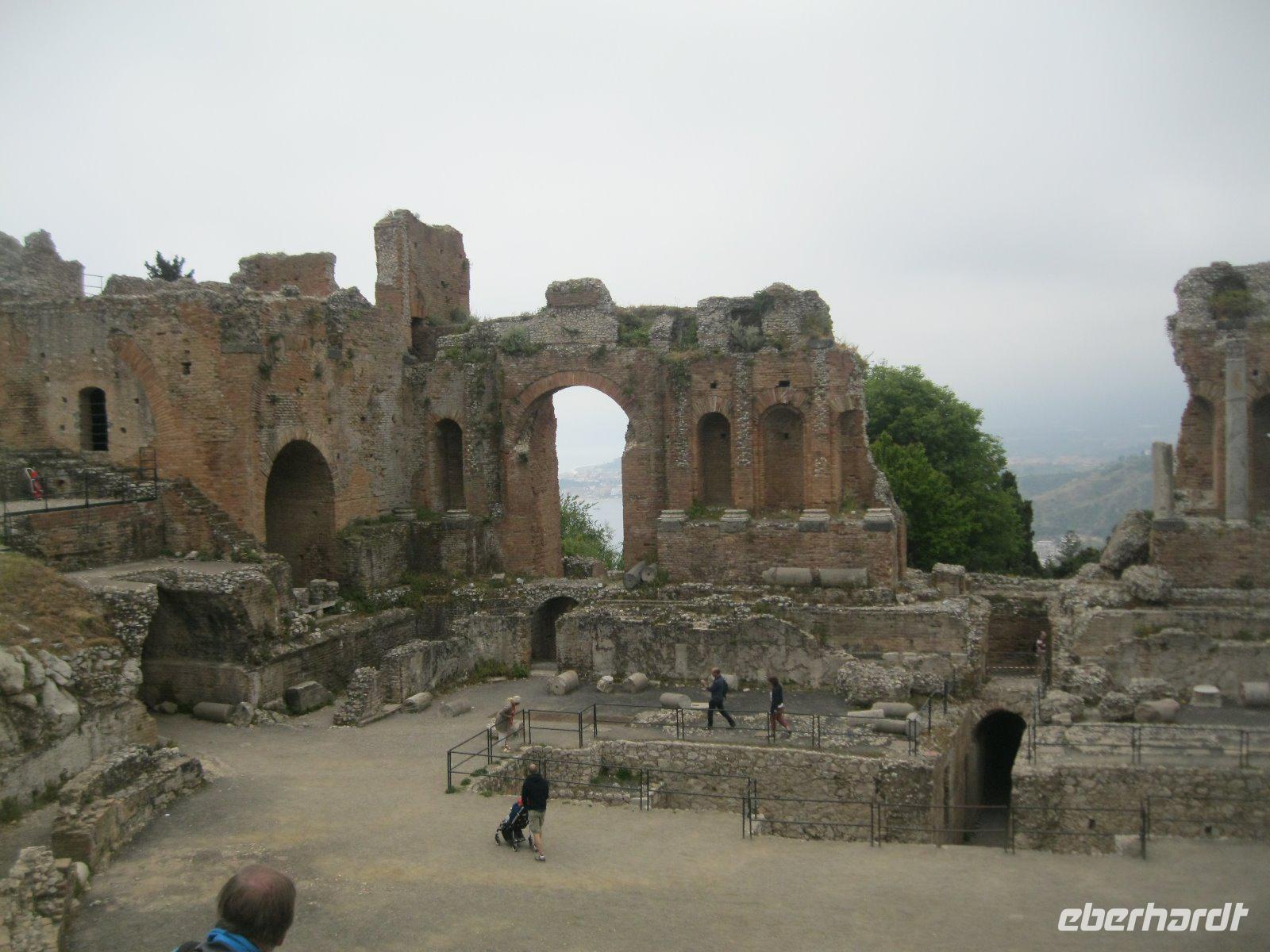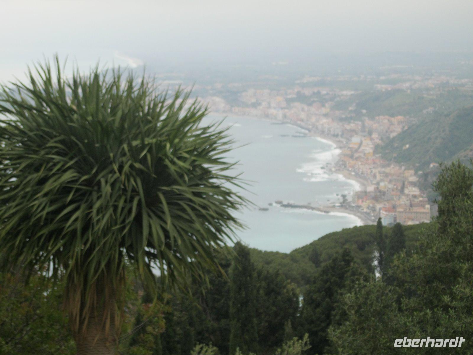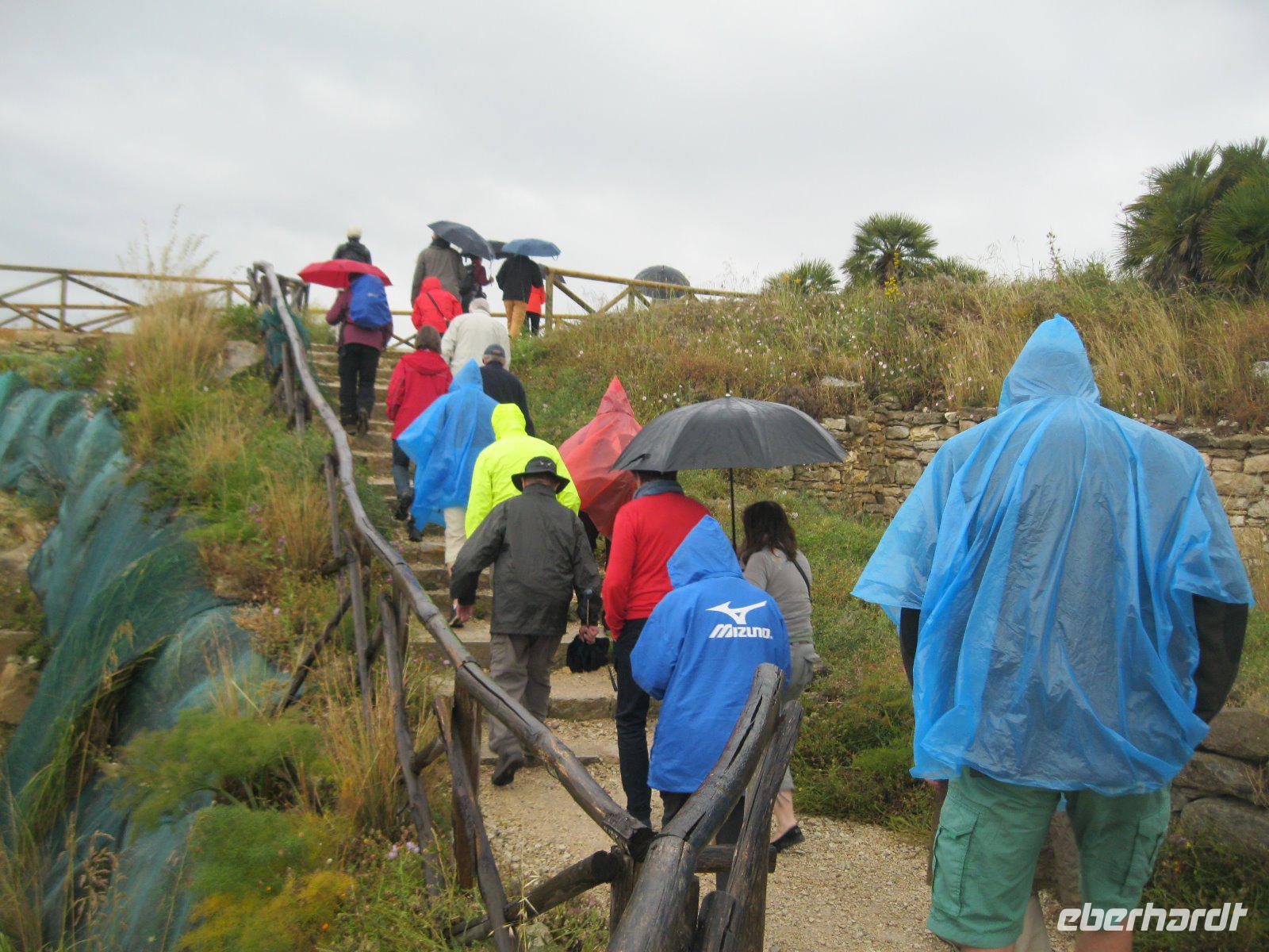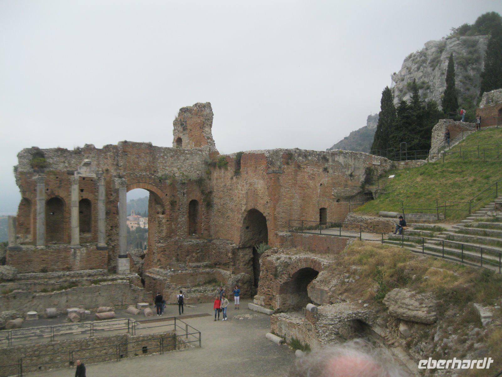 Abenteuerlich ging es mit unserem Bus hinauf nach Castelmola. Das fahrerrische Können unseres Marco war gefragt aber er meisterte es mit Ruhe und Bravour. Vom Parkplatz ging es über Geröll, steil hinauf zum Monte Venere (885 m). Leider war es mit der schönen Aussicht bald vorbei. Nebel hüllte uns in immer dichtere Schwaden ein. Es wurde unangenehm feucht und kalt. Wir beschlossen kurz vor dem Gipfel abzubrechen. Zurück in Castelmola spazierten wir durch die verwinkelten Gassen. Leider war die Zeit etwas kurz aber wir wollten ja noch in Taormina das griech.-röm. Theater (Teatro Greco) besuchen. Leider vermasselte uns auch hier wieder der Nebel das Postkartenmotiv zum Ätna. Nach dem Bummel durch den Botanischen Garten genossen wir das quirlige, touristiche Leben in dieser so historishen Stadt bei einem Espresso und Gelati.