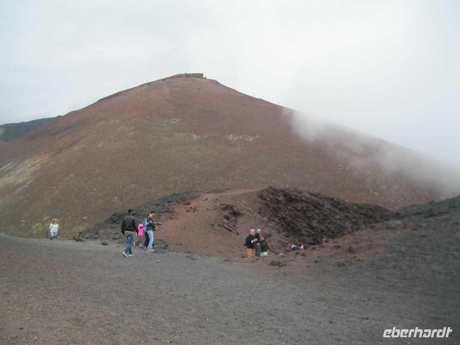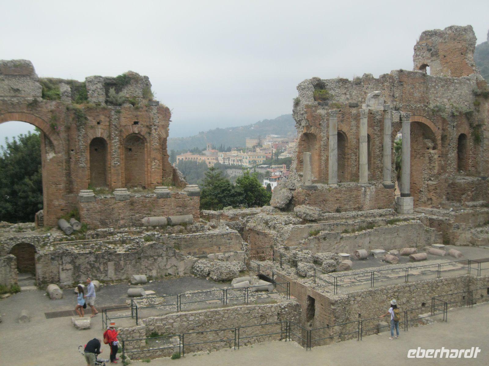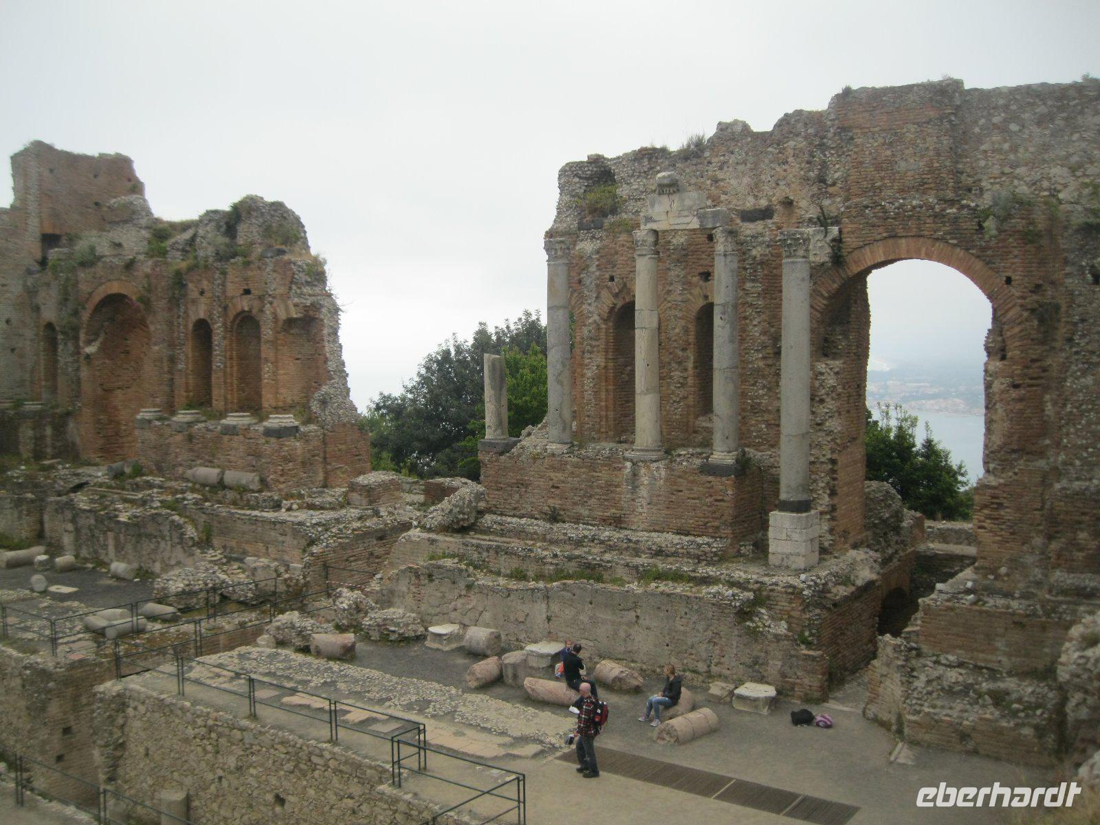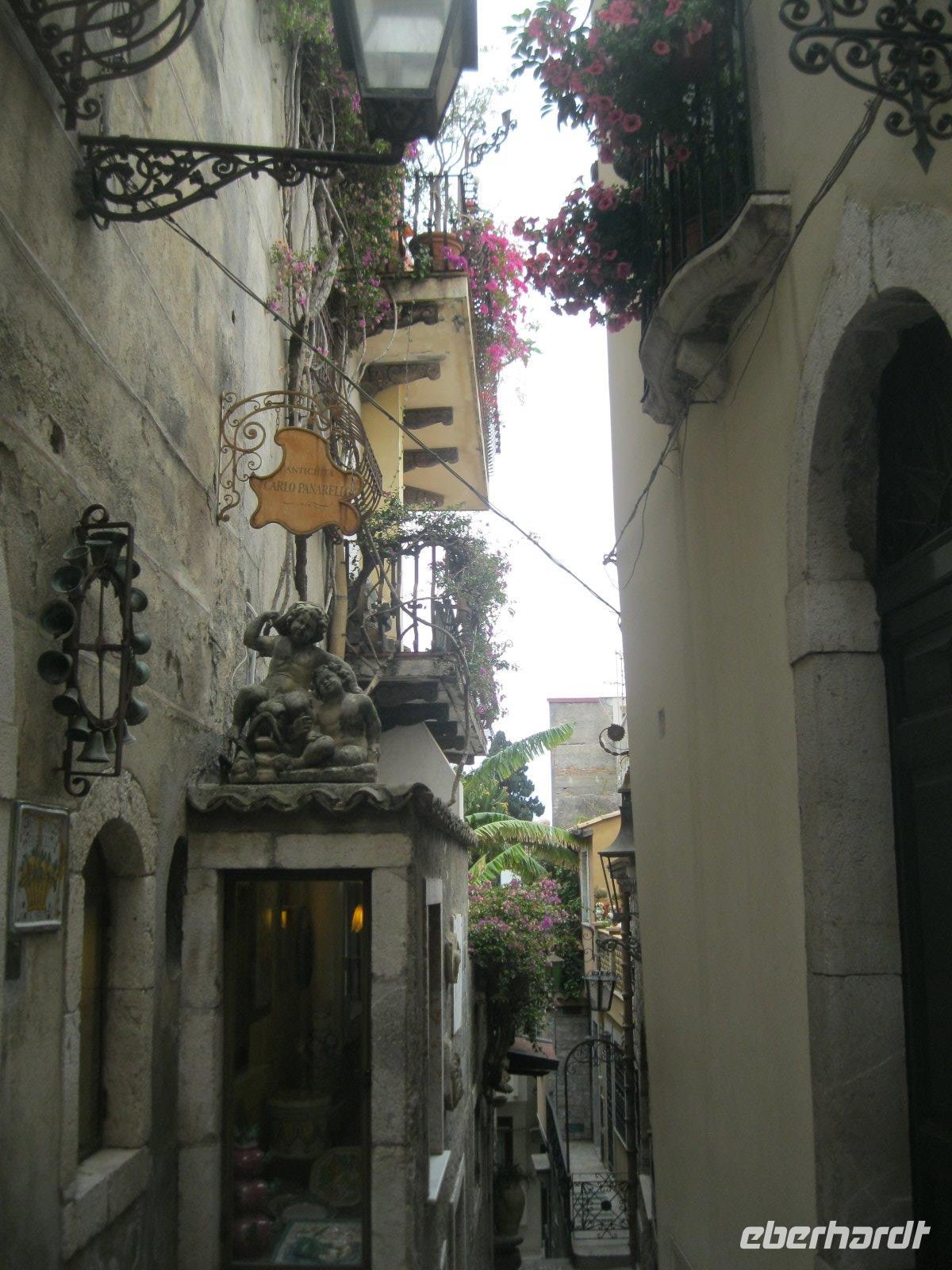 Abenteuerlich ging es mit unserem Bus hinauf nach Castelmola. Das fahrerrische Können unseres Marco war gefragt aber er meisterte es mit Ruhe und Bravour. Vom Parkplatz ging es über Geröll, steil hinauf zum Monte Venere (885 m). Leider war es mit der schönen Aussicht bald vorbei. Nebel hüllte uns in immer dichtere Schwaden ein. Es wurde unangenehm feucht und kalt. Wir beschlossen kurz vor dem Gipfel abzubrechen. Zurück in Castelmola spazierten wir durch die verwinkelten Gassen. Leider war die Zeit etwas kurz aber wir wollten ja noch in Taormina das griech.-röm. Theater (Teatro Greco) besuchen. Leider vermasselte uns auch hier wieder der Nebel das Postkartenmotiv zum Ätna. Nach dem Bummel durch den Botanischen Garten genossen wir das quirlige, touristiche Leben in dieser so historishen Stadt bei einem Espresso und Gelati.