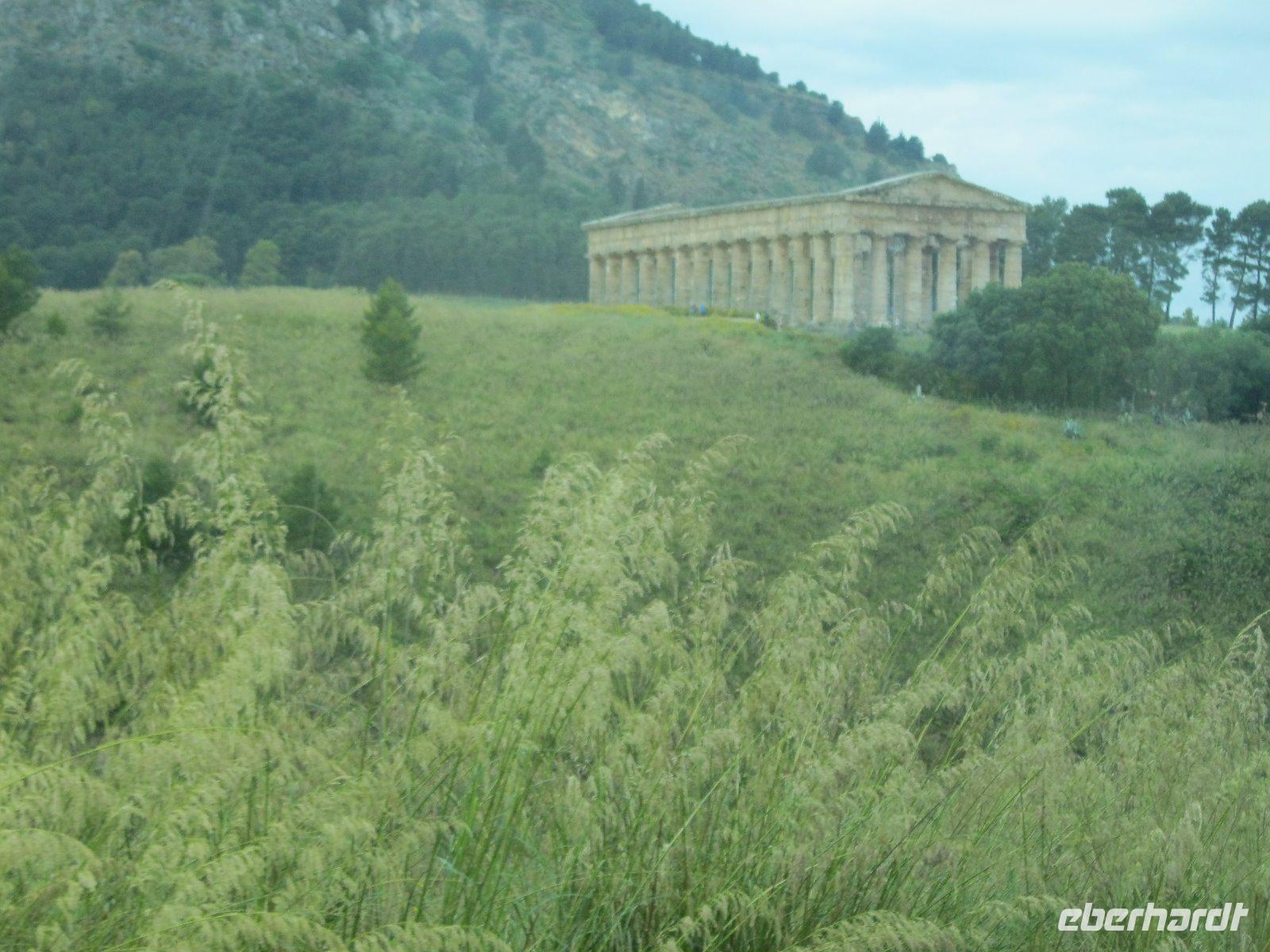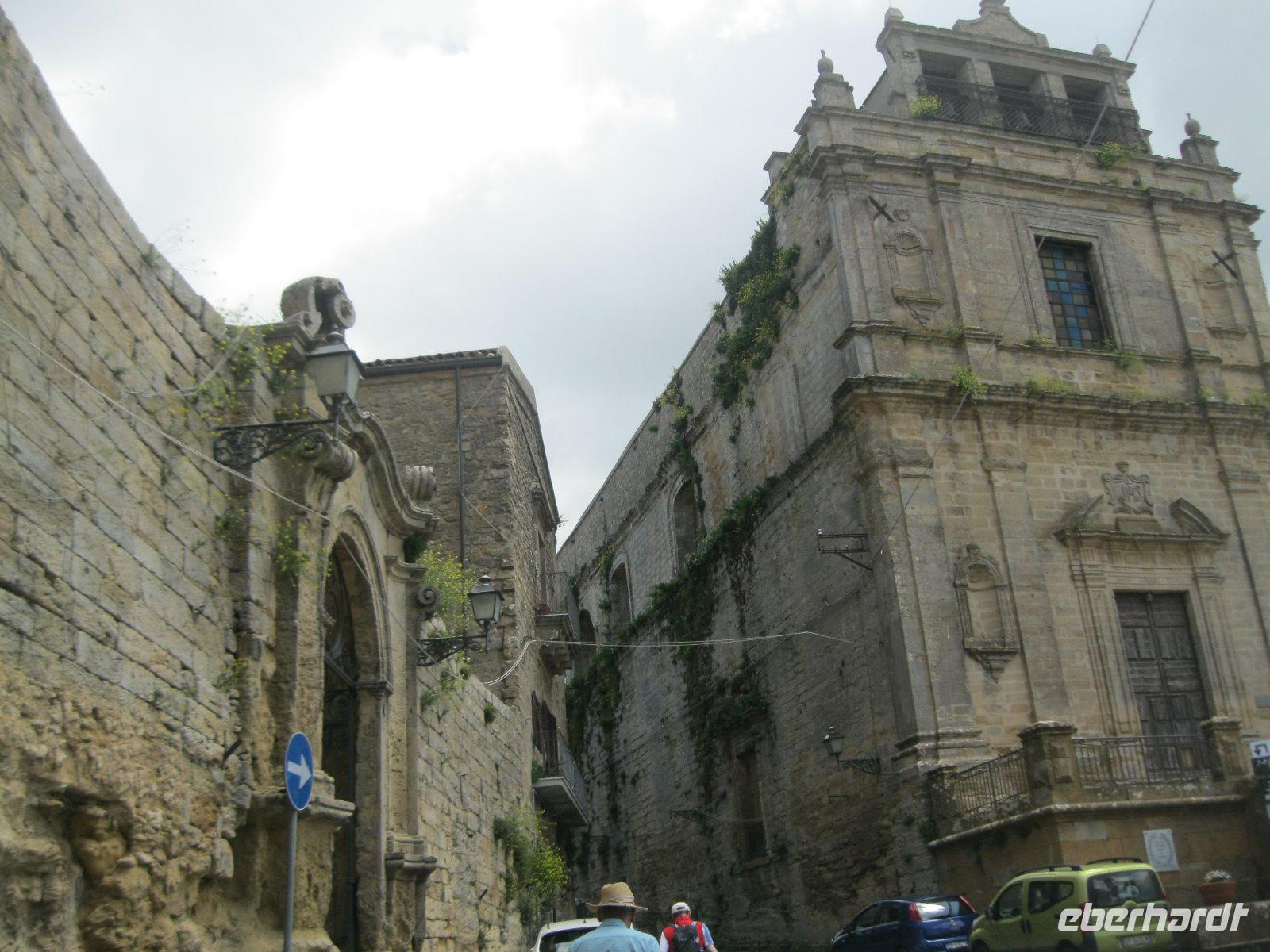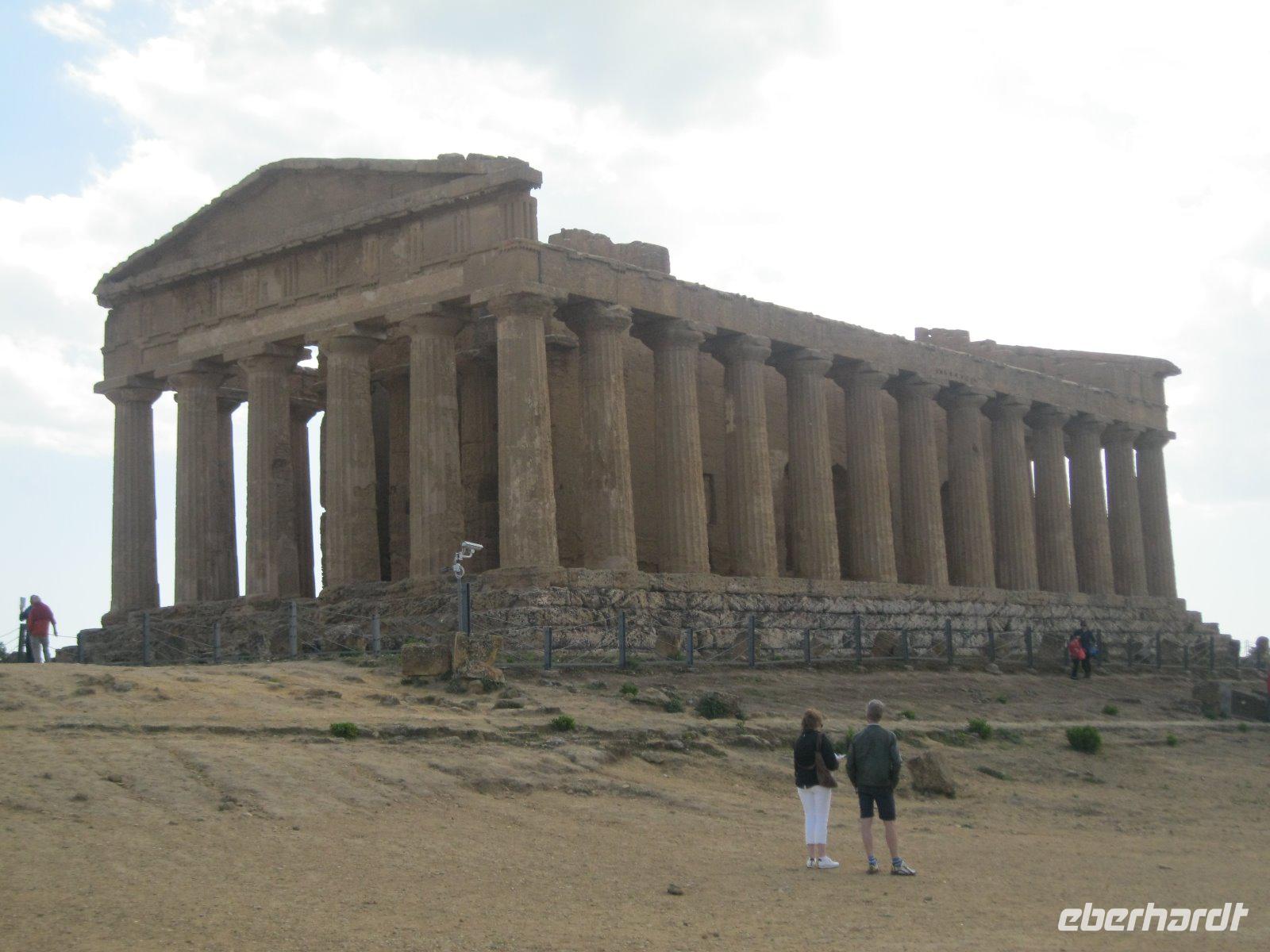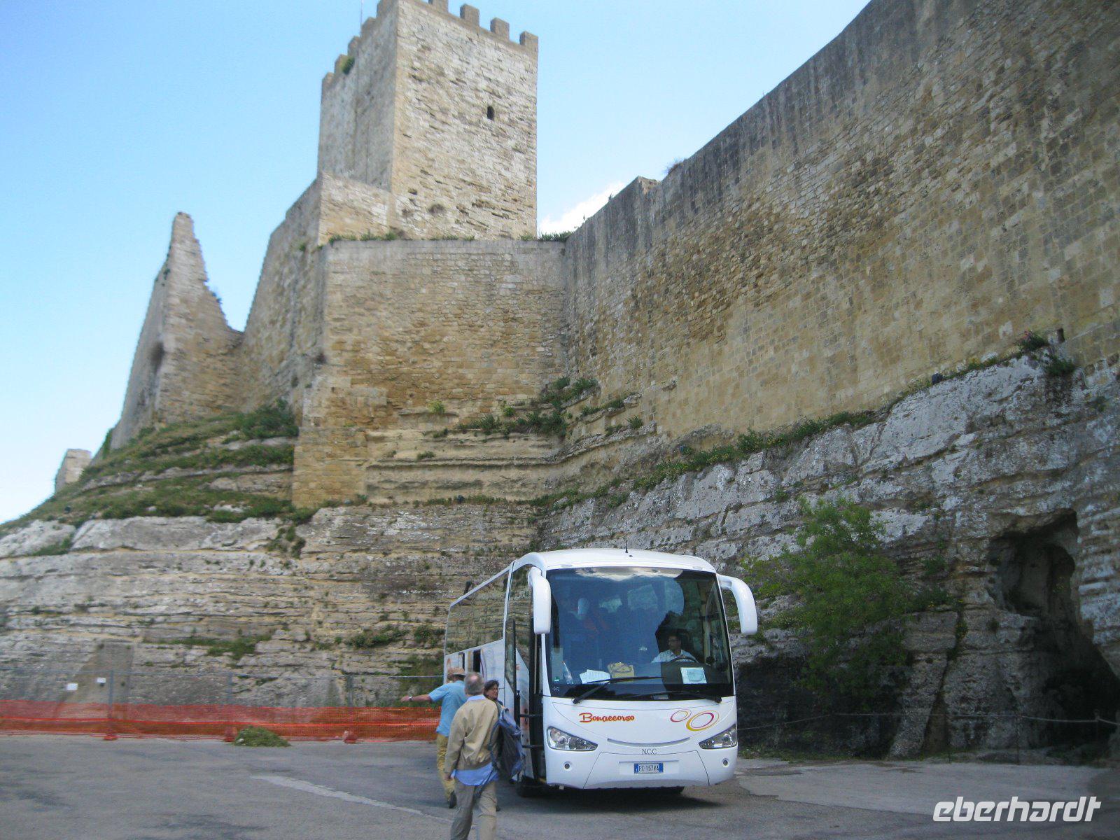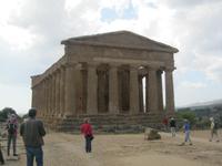Nach längerer Busfahrt erreichten wir die höchst gelegene Provinzstadt ganz Italiens, Enna. Schon von weitem zu sehen ist das, vom Staufer Friedrich II ausgebaute Castello di Lombardia. Wir liefen durch die alten Ruinen und erklommen den Verteitigungsturm "Torre Pisana" von wo wir einen traumhaften Blick bis zu dem, in den Wolken liegenden, Ätna hatten. Es zog uns in die Altstadt zum Dom, der mit Walnußschnitzereien und Keramikkacheln ausgestattet ist. Durch eine hügelige, zum Teil sehr karge Landschaft (dann später Weinanbau) fuhren wir vom Inselinneren nach Agrigent ins "Tal der Tempel". Diese riesige Tempelanlage entlang der antiken Stadtmauer, versetzte uns in eine längst vergangene Zeit. Danach fuhren wir in unser heutiges Hotel im Süden der Insel, direkt am Meer gelegen. Die Wellen waren so stürmisch, dass aus einem Bad in den Fluten lediglich ein Strandspaziergang wurde.