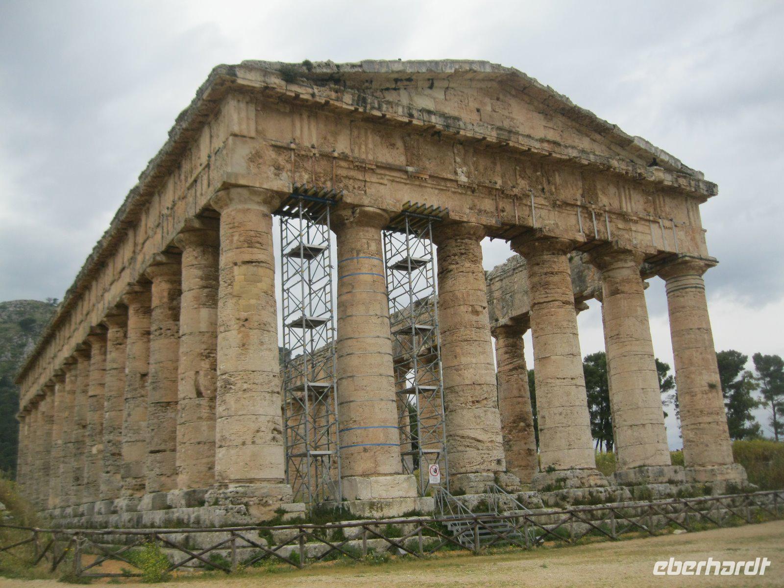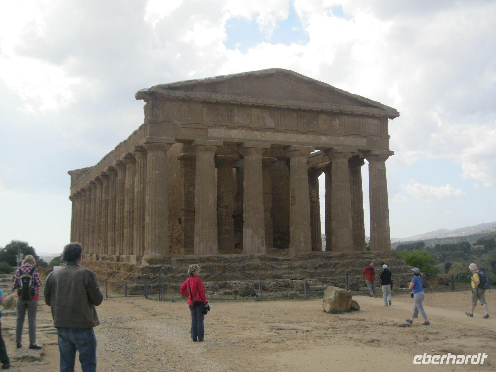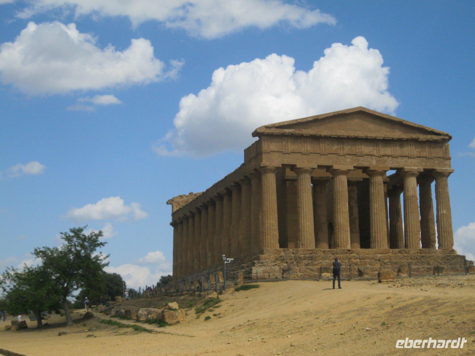 Nach längerer Busfahrt erreichten wir die höchst gelegene Provinzstadt ganz Italiens, Enna. Schon von weitem zu sehen ist das, vom Staufer Friedrich II ausgebaute Castello di Lombardia. Wir liefen durch die alten Ruinen und erklommen den Verteitigungsturm "Torre Pisana" von wo wir einen traumhaften Blick bis zu dem, in den Wolken liegenden, Ätna hatten. Es zog uns in die Altstadt zum Dom, der mit Walnußschnitzereien und Keramikkacheln ausgestattet ist. Durch eine hügelige, zum Teil sehr karge Landschaft (dann später Weinanbau) fuhren wir vom Inselinneren nach Agrigent ins "Tal der Tempel". Diese riesige Tempelanlage entlang der antiken Stadtmauer, versetzte uns in eine längst vergangene Zeit. Danach fuhren wir in unser heutiges Hotel im Süden der Insel, direkt am Meer gelegen. Die Wellen waren so stürmisch, dass aus einem Bad in den Fluten lediglich ein Strandspaziergang wurde.