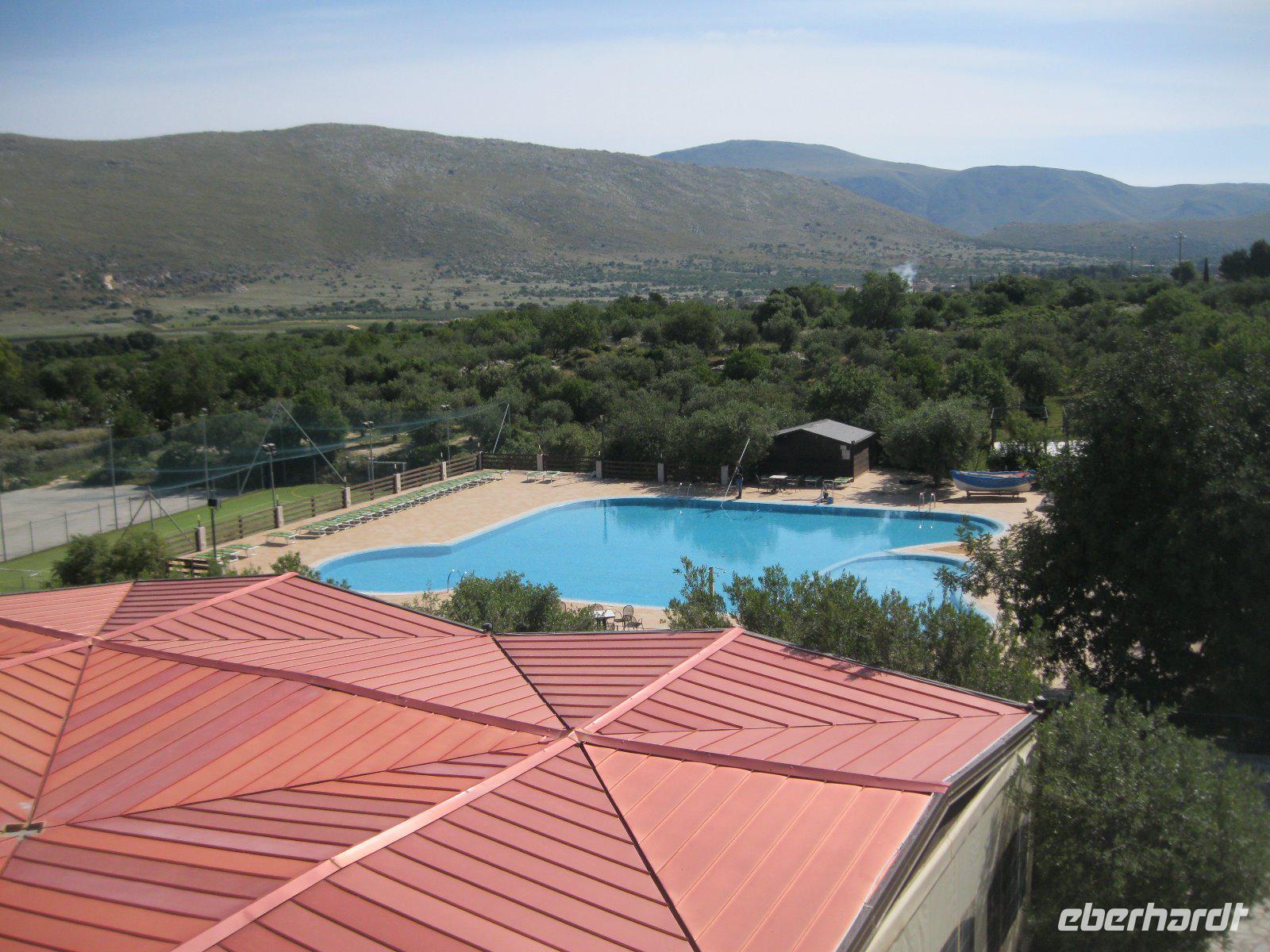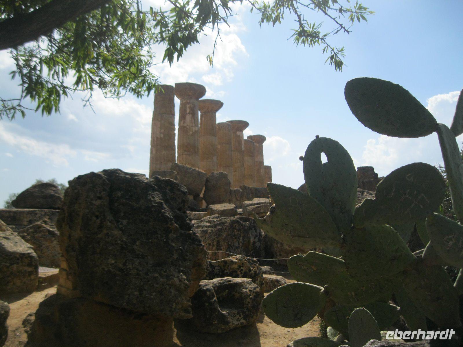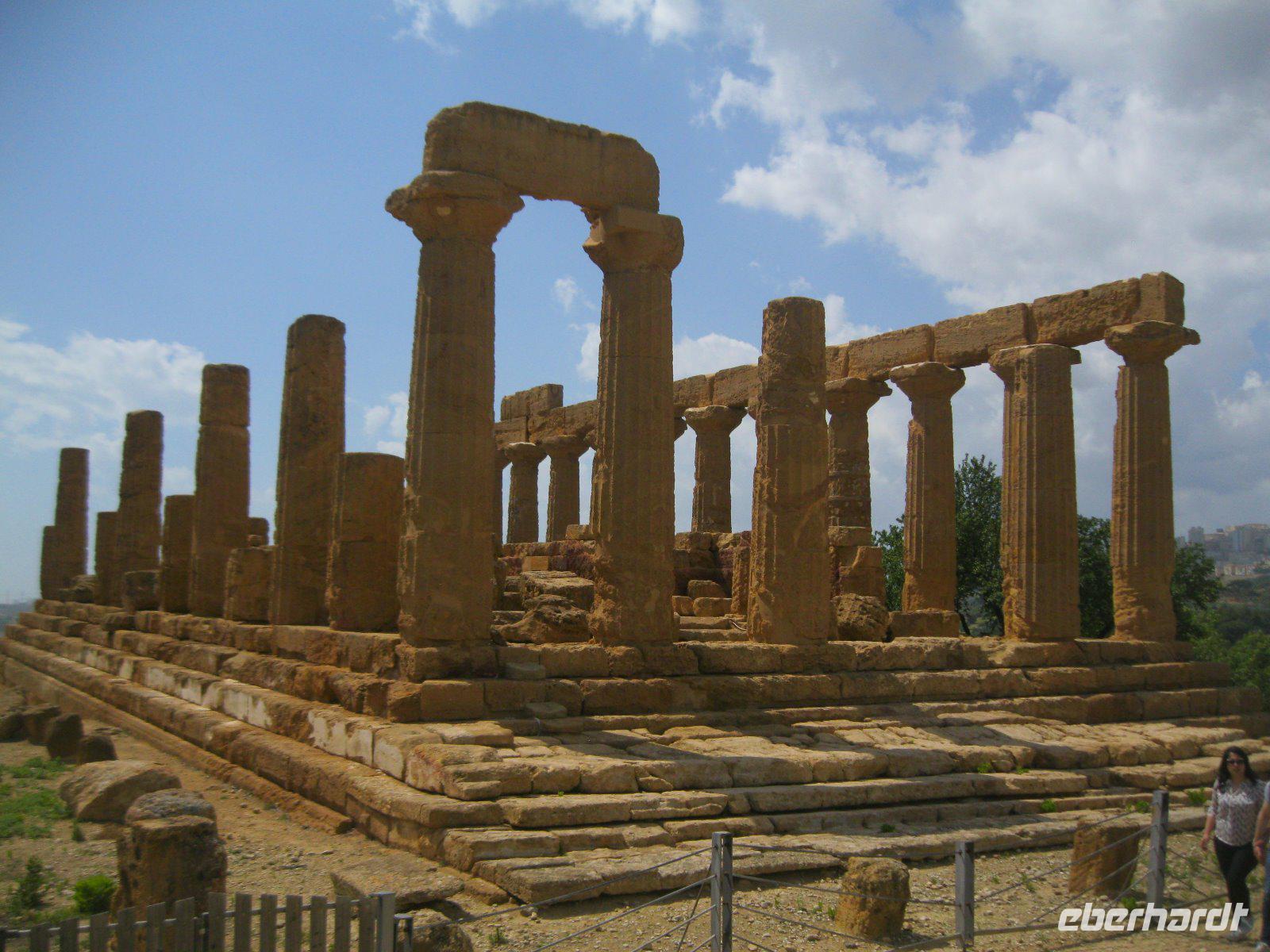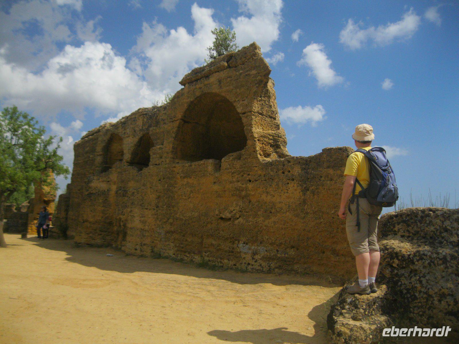 Nach längerer Busfahrt erreichten wir die höchst gelegene Provinzstadt ganz Italiens, Enna. Schon von weitem zu sehen ist das, vom Staufer Friedrich II ausgebaute Castello di Lombardia. Wir liefen durch die alten Ruinen und erklommen den Verteitigungsturm "Torre Pisana" von wo wir einen traumhaften Blick bis zu dem, in den Wolken liegenden, Ätna hatten. Es zog uns in die Altstadt zum Dom, der mit Walnußschnitzereien und Keramikkacheln ausgestattet ist. Durch eine hügelige, zum Teil sehr karge Landschaft (dann später Weinanbau) fuhren wir vom Inselinneren nach Agrigent ins "Tal der Tempel". Diese riesige Tempelanlage entlang der antiken Stadtmauer, versetzte uns in eine längst vergangene Zeit. Danach fuhren wir in unser heutiges Hotel im Süden der Insel, direkt am Meer gelegen. Die Wellen waren so stürmisch, dass aus einem Bad in den Fluten lediglich ein Strandspaziergang wurde.
