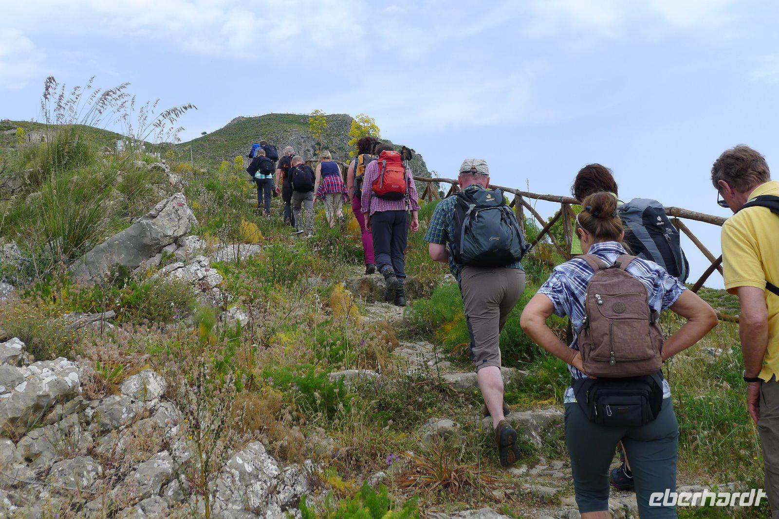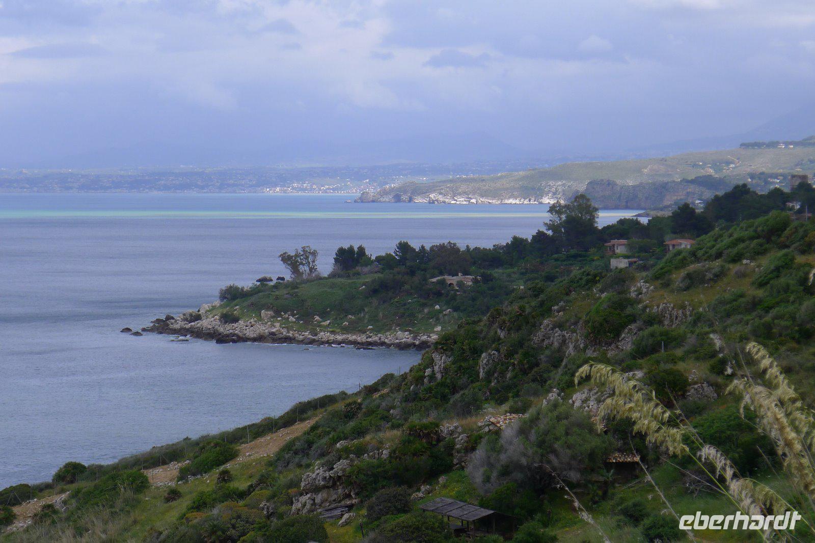 Danach ging es nach Trapani, wo es im Zentrum die Gelegenheit zum Mittagessen gab. Inzwischen hatte der Regen aufgehört und so ging die Fahrt mit unserem Bus zum Naturreservat Zingaro. Wir freuten uns sehr auf die bevorstehenden Stunden in der Natur, die vom Regen wie reingewaschen war. Marcello mussten wir erst dazu überreden, mit uns zu wandern. Er hatte nicht mit unserer Hartnäckigkeit gerechnet und war davon überzeugt, dass uns das morgendliche bedrohliche Wetter von dem dringenden Wunsch zu wandern abhalten würde. Der Himmel war wieder blau, die Sonne schien, man wollte uns den Abschied jetzt offensichtlich doch sehr schwer machen. Hoch über dem Meer verlaufen die romantischen Wege im Zingaro. Man kann die gesamte Küste überblicken und gleichzeitig tief hinunter in die Buchten schauen. Mit uns war eine Schulklasse voller Jugendlicher unterwegs, die voller Übermut die Wege entlang sprangen und uns immer wieder überholten bevor sie erneut von ihren Lehrern zurückgepfiffen wurden.