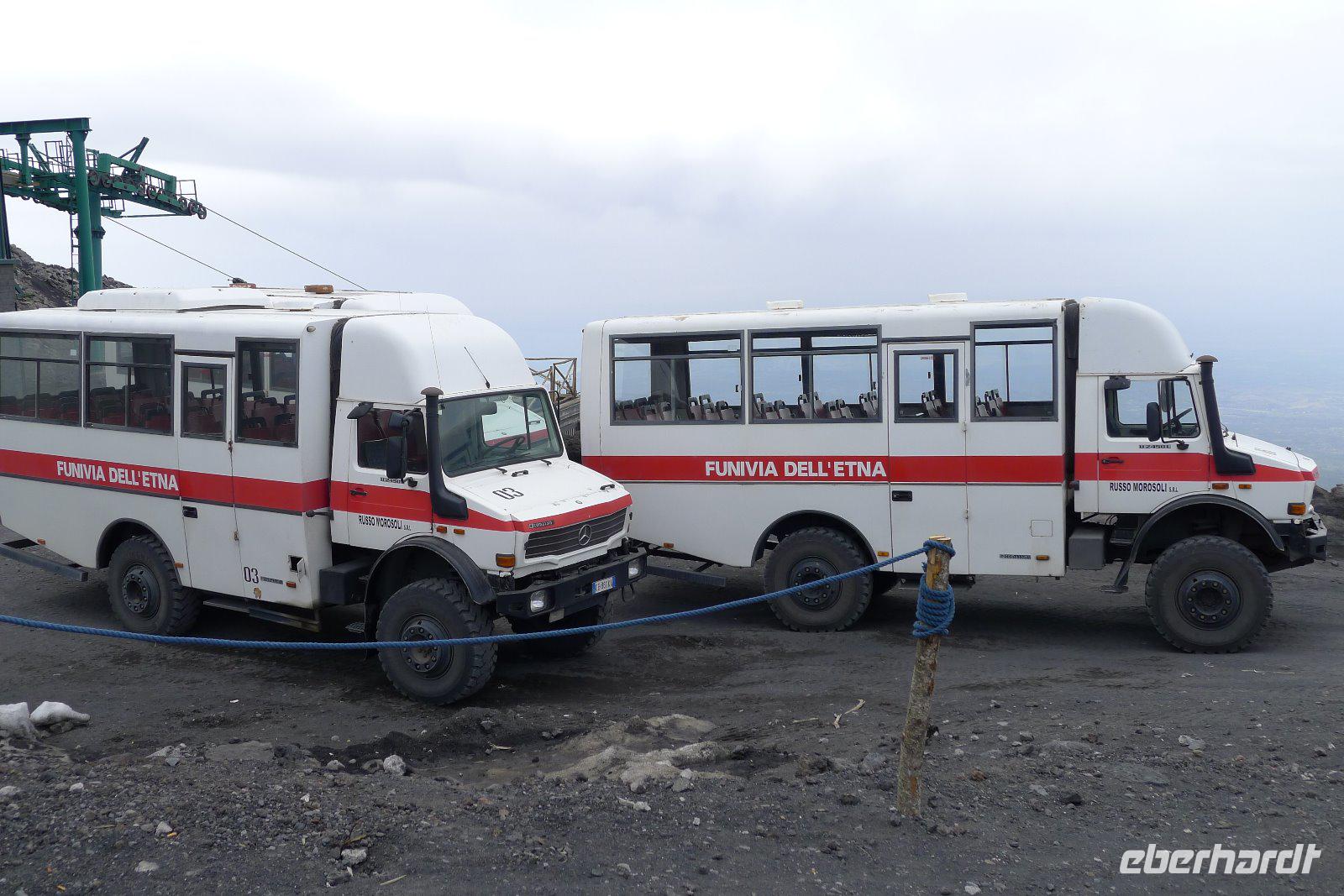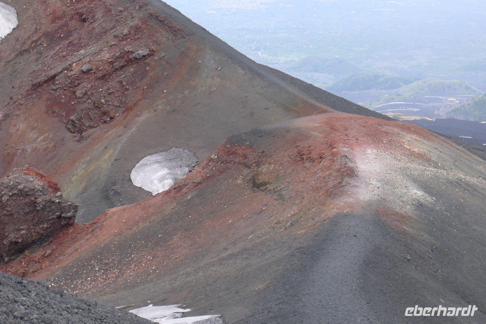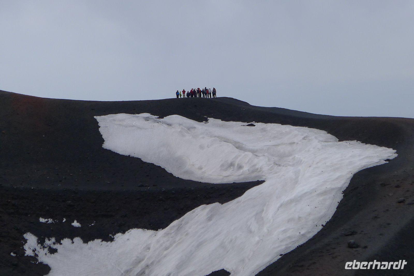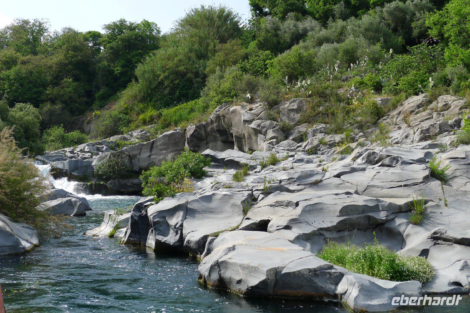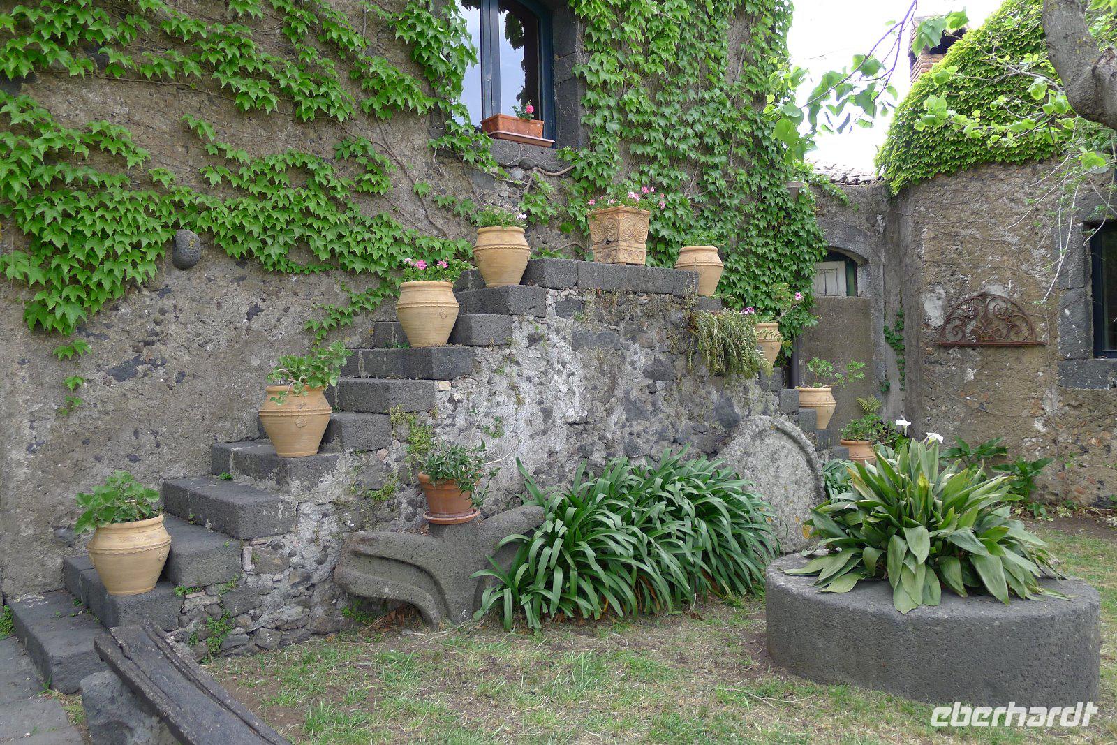 Welch ein Glück! Das Wetter sah prima aus, blauer Himmel und viel Sonne, also sollte unserem Ausflug auf den Ätna hinauf nichts im Wege stehen. Und so hatten sich auch alle dazu entschlossen, bis zum bitteren Ende, sprich bis ganz hinauf auf den Gipfel mitzukommen. Man kommt ja schließlich nicht alle Tage zum Ätna! Man konnte sich nur schwer vorstellen, dass es dort oben tatsächlich so kalt sein sollte, waren doch die Temperaturen unten am Meer richtig sommerlich. Was sollte man da denn anziehen bzw. sich noch im Rucksack zum Überziehen mitnehmen? Keine einfache Sache und wir gaben uns gegenseitig viele gute Ratschläge. Tatsächlich war es dann oben auf fast 3000 m bitterkalt und wir waren für alles froh, was wir anhatten. Auch die Mütze und die Handschuhe kamen zum Einsatz. Nach der Auffahrt mit der Seilbahn ging es weiter mit Kleinbussen und es erwartete uns eine richtige Mondlandschaft mit verschiedenen Kratern und schneebedeckten Feldern. Es pfiff ein eisiger Wind! Unsere kleine Wanderung dort oben in der beeindruckenden Landschaft war ein tolles Erlebnis! Überall dampfte es und es stiegen kleine Rauchwolken auf. Das dunkle erloschene Vulkangestein verlieh der Landschaft etwas Bedrohliches. Zurück mit den Kleinbussen an der Bergstation der Seilbahn wurden wir mit ‚Ätna-Feuer' begrüßt, von dem es aber nur ein wirklich winziges Schlückchen gab. Gerade genug, um die Zunge zu benetzen. Und ein ‚Nachschlag' war leider leider nicht vorgesehen. Also blieb nichts Anderes übrig als die Rückfahrt mit der Seilbahn anzutreten, die uns wieder hinunter ins Tal bringen sollte. Ein Teil der Gruppe wollte noch etwas bleiben und die nächste Bahn nehmen. Die Bahn fuhr langsamer und langsamer und die Fahrt nahm kein Ende. Schließlich kam der erste Teil der Gruppe unten an und staunte nicht schlecht. Waren das nicht unsere Mitreisenden, die eigentlich nach uns oben abfahren wollten und uns jetzt hier unten schon von Weitem winkten? Wie konnte das denn sein? So wie bei Hase und Igel? Ja, tatsächlich musste die Seilbahn aufgrund des heftigen Windes den Betrieb einstellen, so dass der zweite Teil der Gruppe mit Kleinbussen hinuntergebracht worden war und das ging natürlich schneller als mit der Seilbahn. So - dann wäre also auch das geklärt!!! Nach dem Ätna-Erlebnis freuten wir uns jetzt auf die bevorstehende Weinprobe. Ein Weingut mitten in einem grünen Garten gelegen, mit den wunderbarsten Blumen und Pflanzen wohin man auch schaute, ein wirkliches Juwel. Empfangen wurden wir von der Chefin des Hauses, die uns ihre Weine vorstellte. Salute oder cin cin wie der Italiener zu sagen pflegt, zum Wohl! Dazu gab's kleine sizilianische Häppchen, Salami, köstliche Pizza, Oliven und selbstgemachte Marmeladen, die wir zu den würzigen Käsen probieren sollten. Ein interessanter Kontrast! So ließ es sich doch aushalten oder etwa nicht? Eine schöne Atmosphäre und dazu lernten wir noch etwas darüber wie man hier früher gearbeitet hat, denn wir standen inmitten von alten Pressen und Handwerksinstrumenten, mit dem man in grauer Vorzeit Wein produziert hat. Nach einem Dessertwein zum Abschluss, serviert mit den typischen Mandelkeksen, den Cantucci, mussten wir uns dann aber doch wieder auf den Weg machen, denn unser Tag war noch nicht zu Ende. Nein, jetzt wollten wir uns wieder der Natur widmen. Die Alcantara-Schlucht bestaunten wir von oben und schlossen nach kurzer Fahrt noch eine idyllische Wanderung an, die uns an einem Fluss entlang führte, über Stock und Stein und schwere Felsbrocken. Das Wasser war glasklar und schimmerte türkisfarben. Nach kleiner Rast am Ufer ging es zurück zum Bus und Francesco lenkte nun in Richtung Hotel, wo wir zufrieden, aber auch müde ankamen.