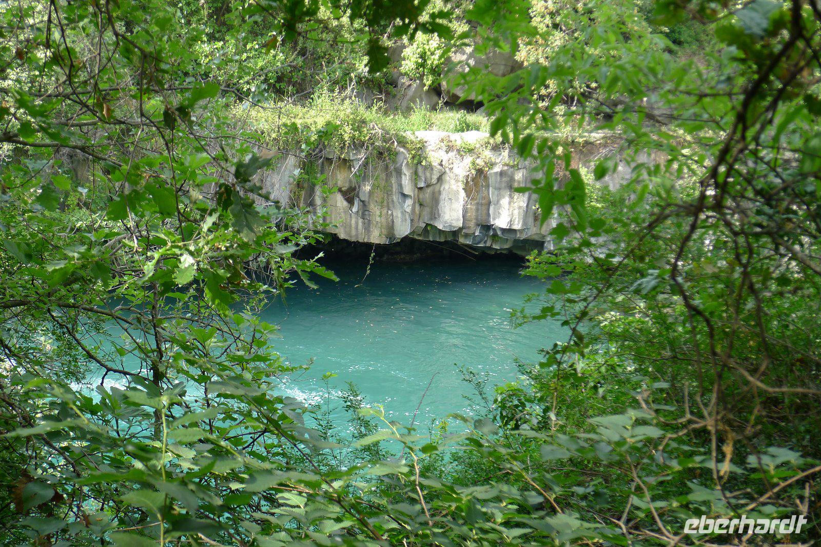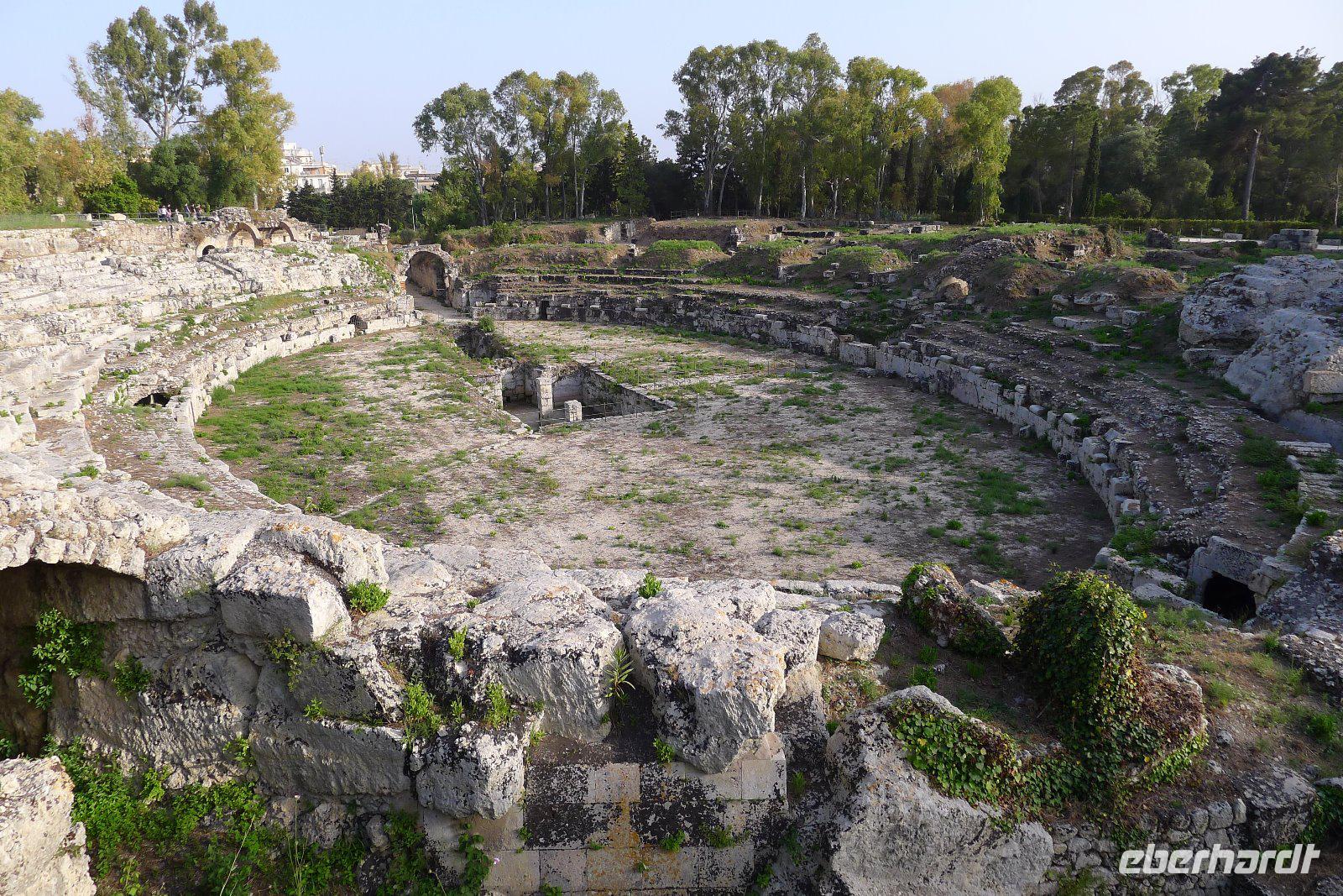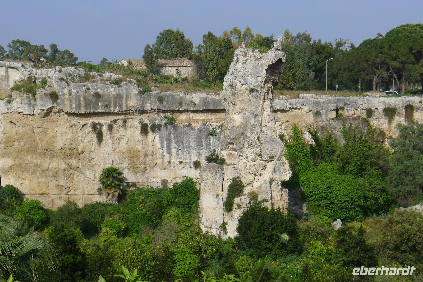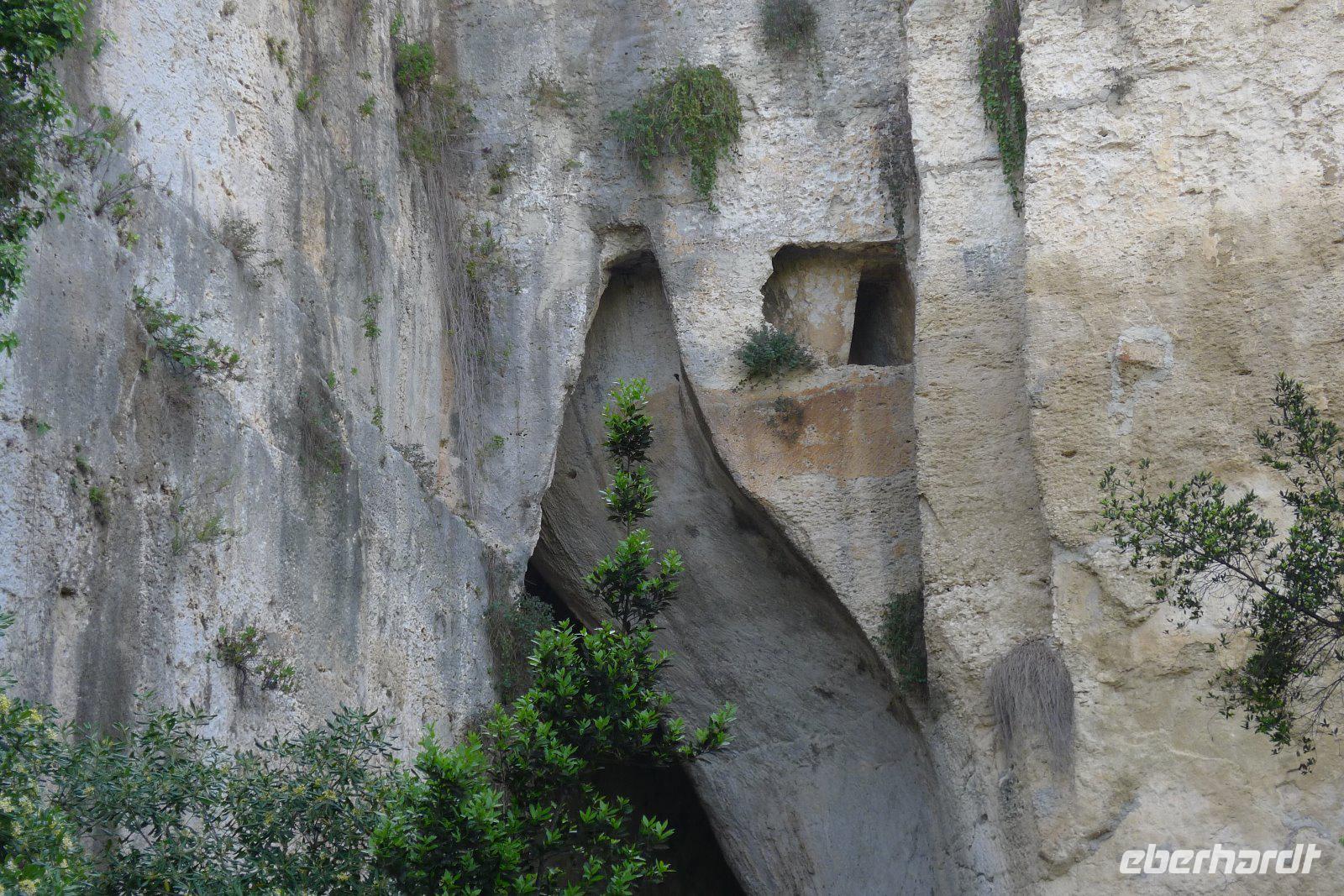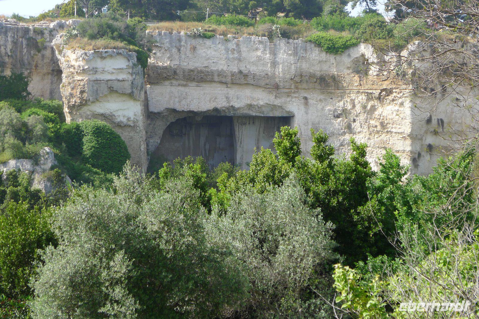 Wir hatten heute viel vor und machten uns deshalb schon früh auf den Weg in Richtung Süden. Arrivederci Giardini Naxos, Taormina, Castelmola und Ätna. Heute schwebten dicke Wolken über dem Ätna, so dass uns nochmals bewusst geworden ist, was für ein Glück wir am Vortag bei unserem Ausflug zum ‚Mongibello' gehabt hatten. So wird der Berg liebevoll von den Einheimischen genannt. ‚Mongibello' ist aus lateinisch ‚mons' bzw. italienisch ‚monte' und aus arabisch ‚djebel' abgeleitet. Beides bedeutet ‚Berg'. Die Landschaft änderte sich schon bald. Wir ließen die Berge hinter uns und es wurde flacher. Olivenbäume und Zitrusplantagen prägten die Landschaft auf unserem Weg in die Totenstadt Pantálica, die zum Weltkulturerbe gehört. Auch Pappeln, Johannisbrotbäume und die so typische südländische Macchia begleiteten uns auf unserem Weg. Langsam näherten wir uns der wilden Landschaft, die die Totenstadt Pantálica umgibt. Das Hochplateau am Rande eines gewaltigen Canyons war schon in der Bronzezeit besiedelt. Es war das Volk der Sikuler, die hier gelebt haben. Von ihren Siedlungen gibt es keine Spuren mehr, aber dafür existiert ihre Totenstadt mit über 5000 früheren Grabhöhlen bis heute. Das interessante Ziel ist als Riserva Naturale Orientata unter einen besonderen Schutz gestellt. Der Fluss Anapo hat sich im Laufe von Jahrmillionen durch die Kalkfesen der Monti Iblei gegraben. Unsere Wanderung führte uns auf einsamen Pfaden inmitten einer verwunschenen Landschaft zu den alten Grabhöhlen. Wir genossen die Bewegung und die schöne Natur! Am Ende unserer Wanderung ließen wir uns am Fluss nieder und ließen uns unser Mittags-Picknick schmecken. Das kühle Wasser tat den müden Füßen gut! Zurück bei Francesco am Bus ging es auch sogleich weiter in Richtung Syrakus. Marcello teilte sonnengereifte Orangen aus, die er unterwegs aufgesammelt hatte. Er erkärte uns, warum diese Orangen häufig gar nicht erst abgeerntet werden. Aber das würde hier jetzt zu weit führen. Wir jedenfalls ließen uns die süßen Früchte schmecken! In Syrakus erwartete uns bereits unser Führer, der uns die antiken Stätten inklusive des Ohrs von Dionysus näherbringen wollte. Er hatte Zeit und man merkte ihm an, dass er Spaß an der Sache hatte und sich auch über unser Interesse und unsere Fragen freute. Schließlich mussten wir ihn aber doch ganz zaghaft daran erinnern, dass wir irgendwann einmal noch ins Hotel mussten. Auf jeden Fall hatten wir viel über Griechen und Römer und deren Bauten erfahren und traten sehr bereichert das letzte Stück Weg in unser neues Quartier an.