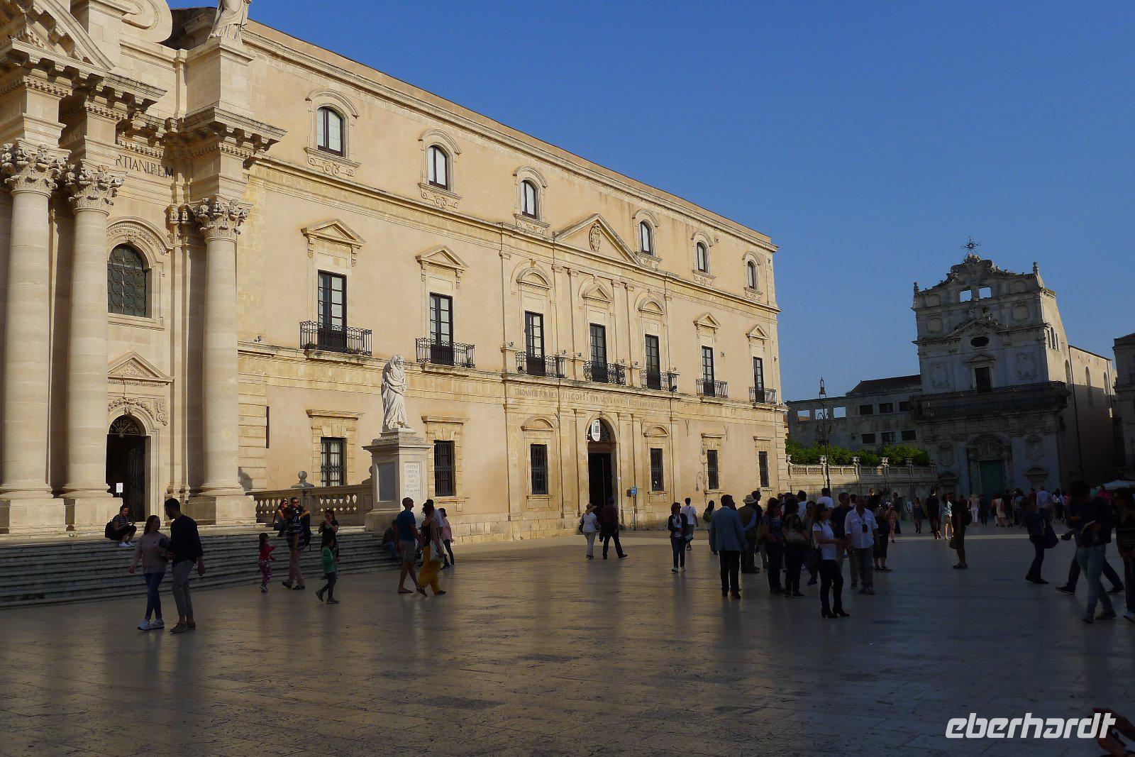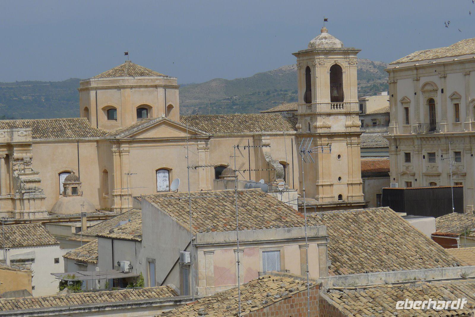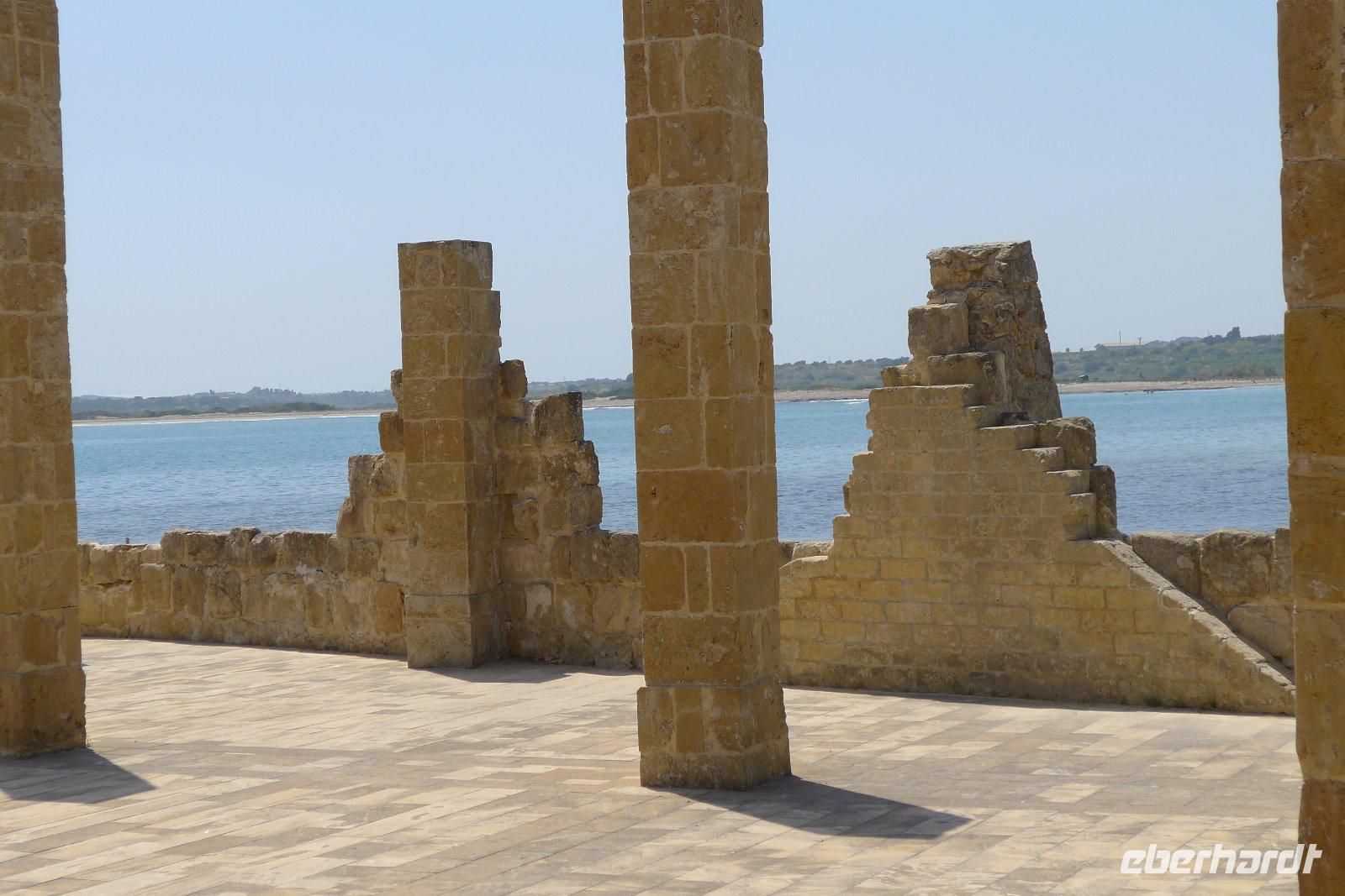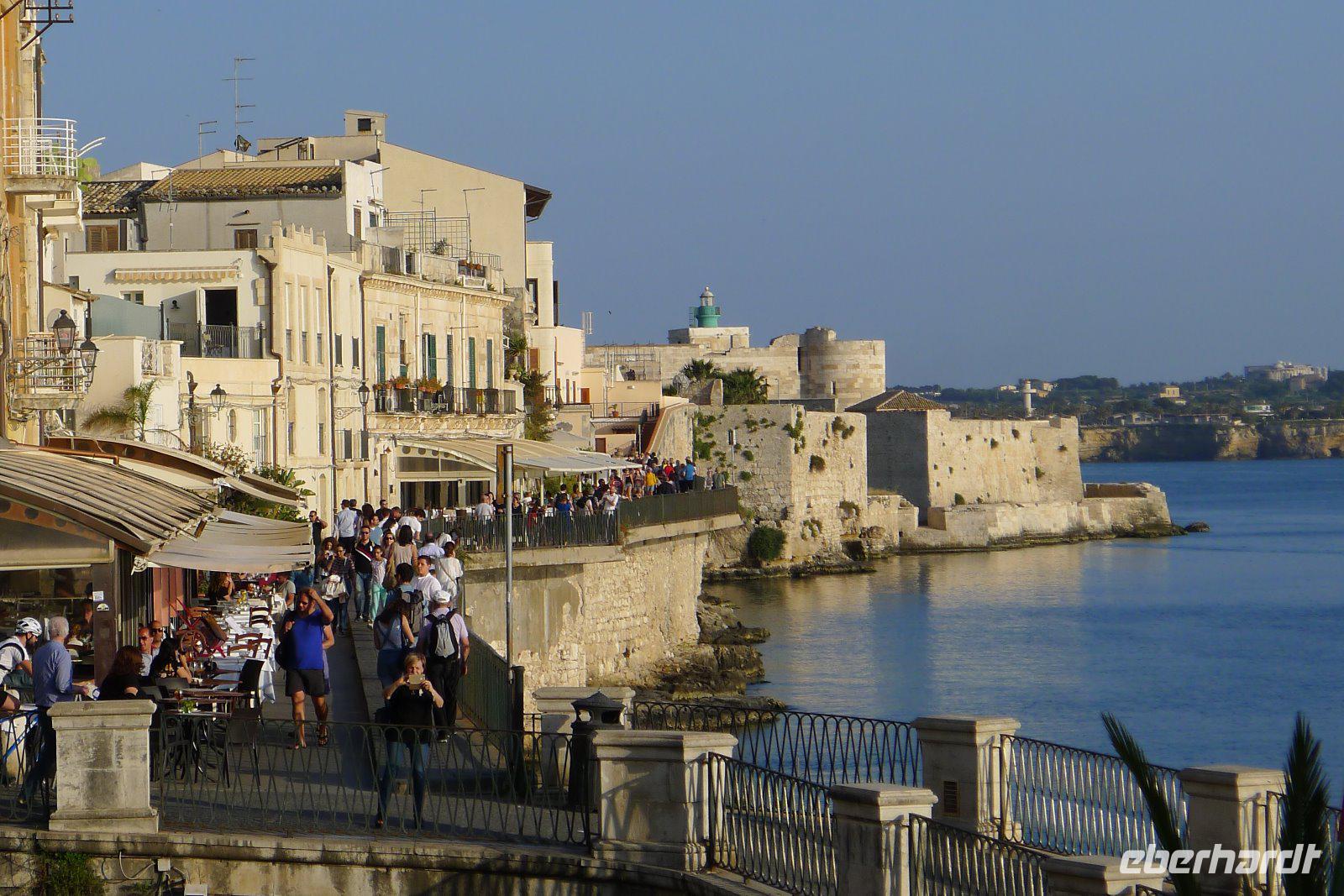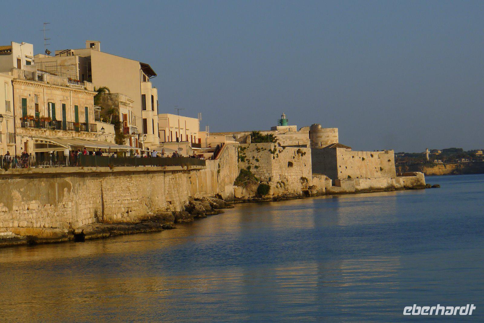 Unseren Tag beginnen wir heute mit einer Fahrt nach Noto. In 2002 wurde die Stadt als Weltkulturerbe durch die UNESCO anerkannt. Ein Spaziergang mit Marcello durch die ‚Hauptstraße', den Corso Vittorio Emanuele, steht am Anfang unseres Aufenthaltes. Hier reiht sich eine Sehenswürdigkeit an die andere. Große und mächtige Kirchen, hübsche Gassen und beeindruckende Plätze, man spricht auch von der schönsten Barockstadt Siziliens. Es machte uns allen Spaß, durch das Städtchen zu streifen. Nur der von Marcello versprochene Supermarkt war nicht leicht bzw. gar nicht zu finden. Aber irgendetwas Essbares für unser geplantes Picknick hat dann am Ende doch jeder gefunden! Und die Reiseleitung steuerte noch die typische Focaccia bei, leckere Teigtaschen mit unterschiedlichster Füllung. So musste keiner Hunger leiden. Für unser Picknick fanden wir einen klitzekleinen Schattenplatz in der Riserva Naturale Orientata Vendicari, wo wir nach dem Besuch in Noto unsere Wanderung machten. Ein noch ziemlich unberührter Küstenstreifen mit Dünen, Waldgebieten und Lagunenseen, den so genannten ‚patani'. In diesen Lagunen finden viele Vogelarten Zuflucht. Selten gewordene Wat- und Stelzvögel, aber auch Reiher und Kraniche und viele andere. Vendicari wurde schon 1974 unter Landschaftsschutz gestellt. Im Jahre 1989 hat man den Schutzstatus noch erhöht und seitdem ist Vendicari ein Naturreservat. Wir genossen unsere Wanderung, die uns vorbei an einer ehemaligen Thunfischfabrik führte. Mal über Pfade, mal im Sand über den verlockenden Strand, eine Oase. Obwohl wir schon gleich zu Beginn unserer Wanderung einen Strand erreichten, an dem wir gerne Halt gemacht hätten, vertröstete Marcello uns auf später. Der ‚schönste Strand Siziliens' sollte doch erst noch kommen. Na, da konnte man ja gespannt sein! Leider war der schönste aller Strände dann mit einer dicken Schicht Algen bedeckt. Das konnte uns aber nicht davon abhalten, uns ins Wasser zu begeben. Aber in der so harmlos aussehenden Bucht war das Meer an diesem Tag aufgewühlt und so war das Unterfangen nur etwas für Mutige. Zu Fuß erreichten wir den Bus und Francesco chauffierte uns nach Syrakus. Heute waren wir so frühzeitig dort angekommen, dass noch genügend Zeit blieb, die attraktive Altstadt Ortigia zu besuchen. Im warmen Licht eines sommerlichen Nachmittags streiften wir durch die Stadt und einige beschlossen, das Abendessen im Hotel ausfallen zu lassen und anstatt dessen in der Stadt zu bleiben und sich dort auf einem der romantischen Plätze zum Abendessen niederzulassen.