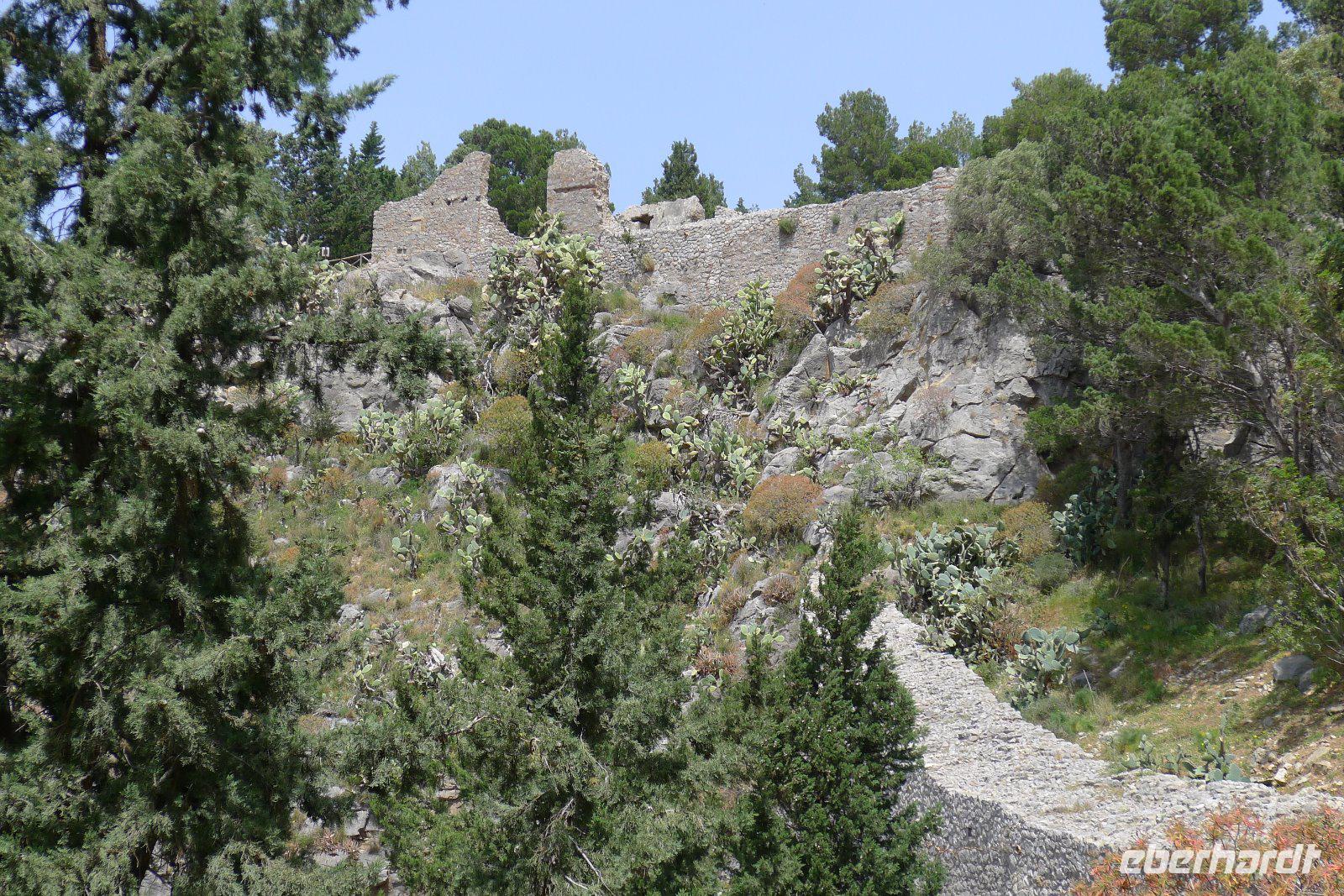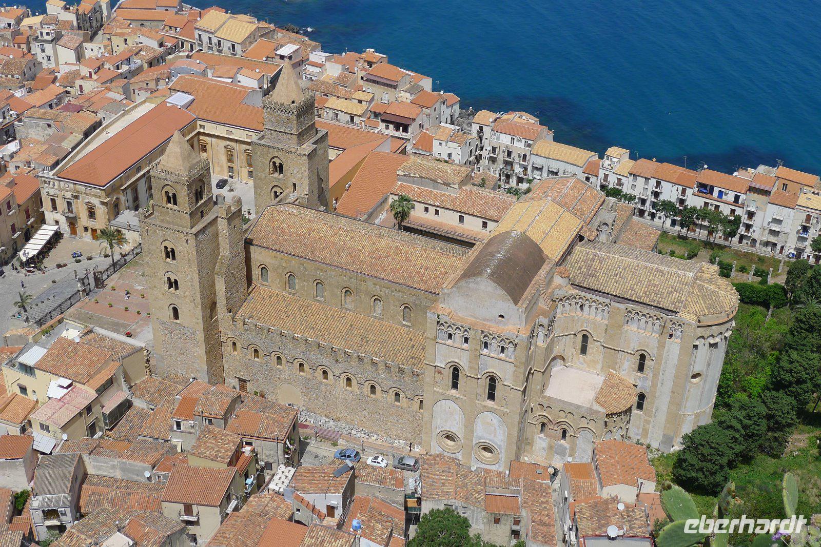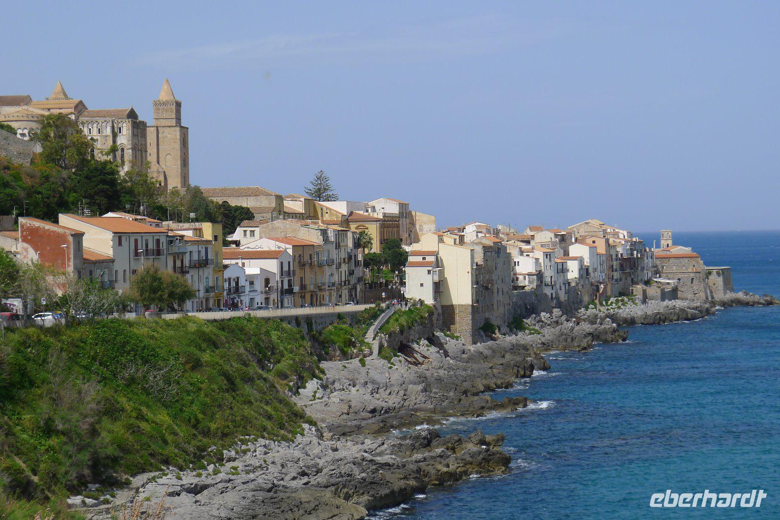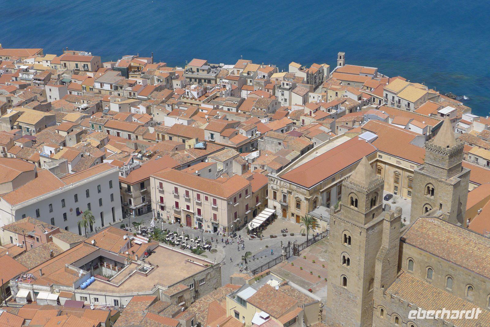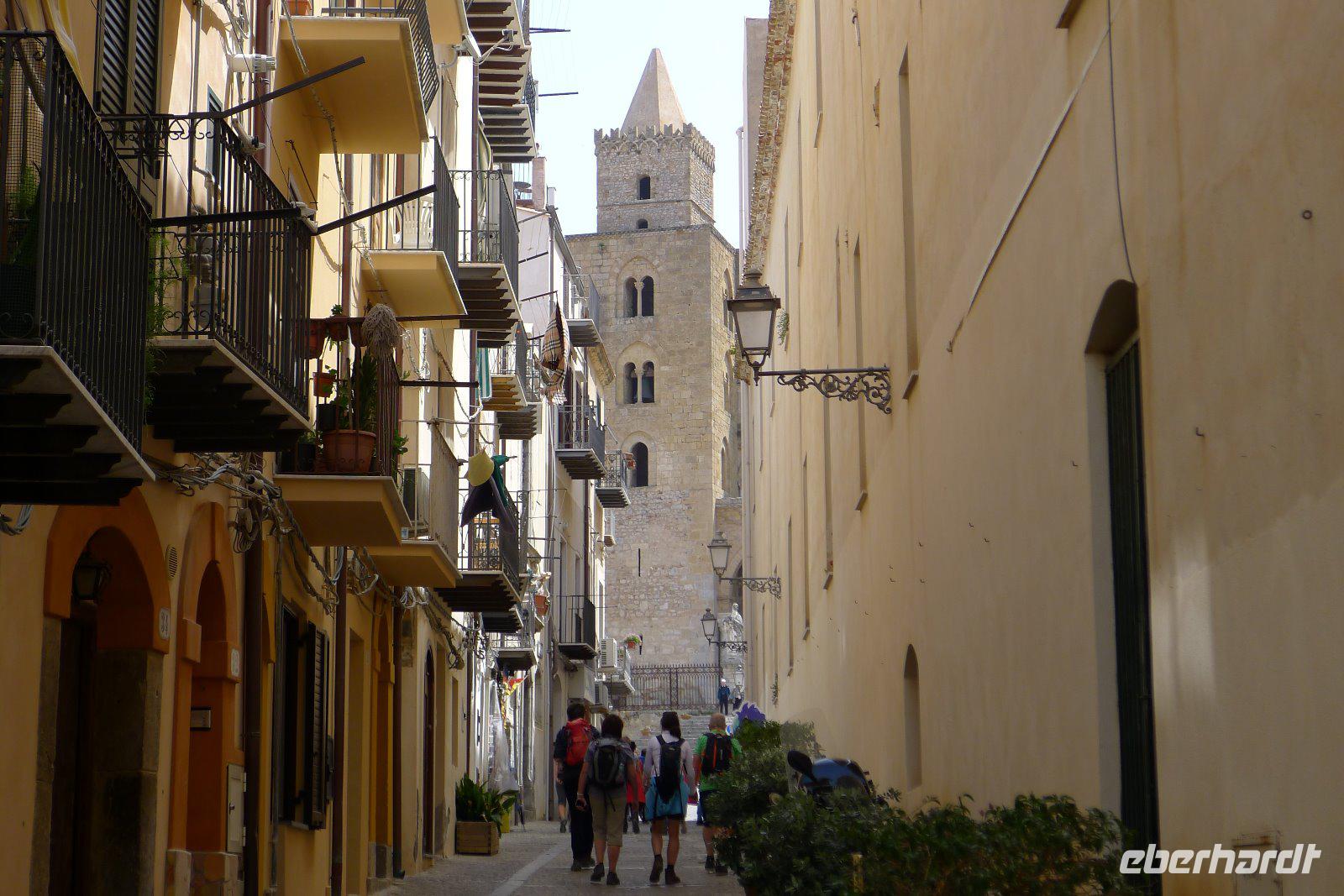 Heute verließen wir nach nur einer Nacht Agrigento im Süden, um die ganze Insel einmal komplett zu durchqueren. Trotz diverser Baustellen erreichten wir Cefalù an der Nordküste problemlos am späten Vormittag und konnten uns in aller Ruhe der Besichtigung dieses Städtchens widmen. Obwohl man in Cefalù nie alleine ist und die Stadt immer mit anderen Besuchern teilen muss, spürt man doch auf Schritt und Tritt den Charme, den die engen Altstadtgassen verströmen. Marcello führte uns über verschlungene Wege entlang der zerklüfteten Küste. Immer wieder genossen wir den Blick über das tiefblaue Meer mit seinen vielen weißen Schaumkronen. Wir waren begeistert vom Zusammenspiel von Meer, dem alles überragenden Burgberg und dem Städtchen zu seinen Füßen. Es war gar nicht so einfach, die ganze Gruppe ‚in Schach' zu halten, zu viele verlockende Geschäftchen gab es links und rechts des Weges. Nachdem wir einiges über die Geschichte gehört hatten, besuchten wir den Dom von Cefalù. Er verweist auf verschiedene Zeitepochen. Welch ein Kontrast zwischen der Fassade und dem Inneren des Baus. Nachdem wir die byzantinischen Mosaiken bewundert hatten, was Freizeit angesagt. Die Qual der Wahl - welche von den verschiedenen Möglichkeiten wählen? Ein Bummel durch den Ort und ein gemütliches Mittagessen auf einer der Restaurantterrassen, die direkt über dem Wasser zu schweben schienen? Oder doch lieber ein erfrischendes Bad in der leicht geschwungenen Bucht mit ihrem Strand aus feinem Sand? Oder etwa doch etwas Bewegung gefällig nach der längeren Busfahrt? Ein dicht bewachsener romantischer Pfad führt hinauf auf den Burgberg, vorbei an den Resten des Dianatempels bis zur Rocca, der Festung.