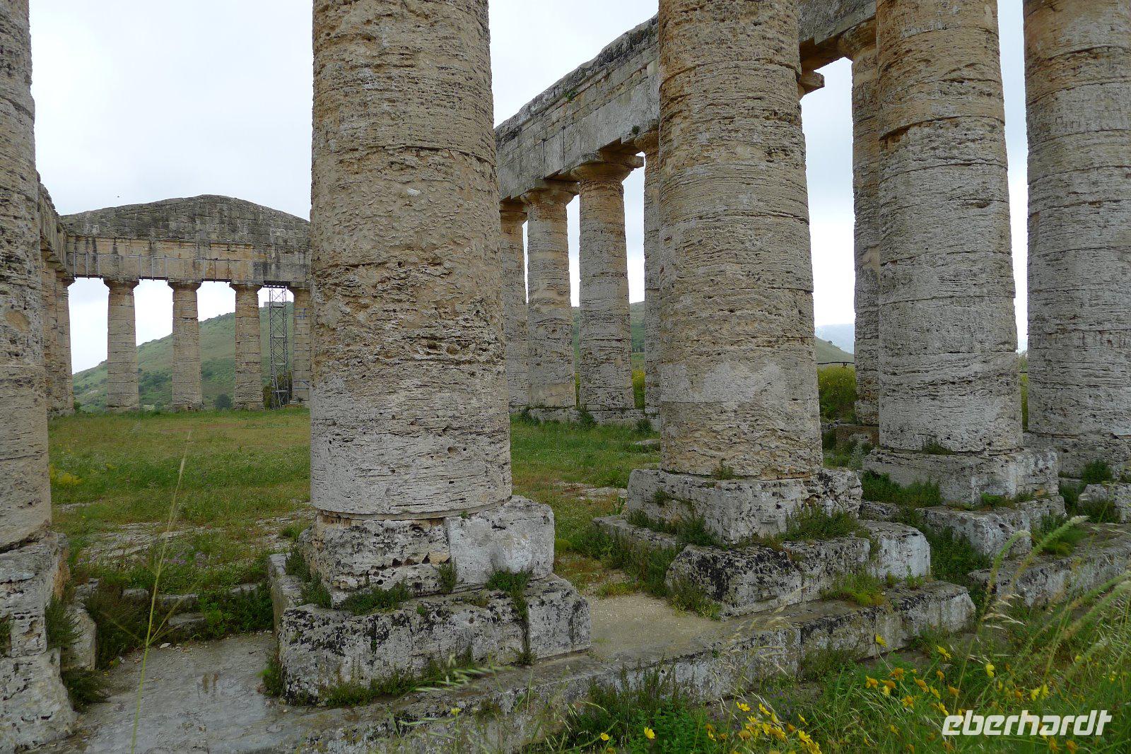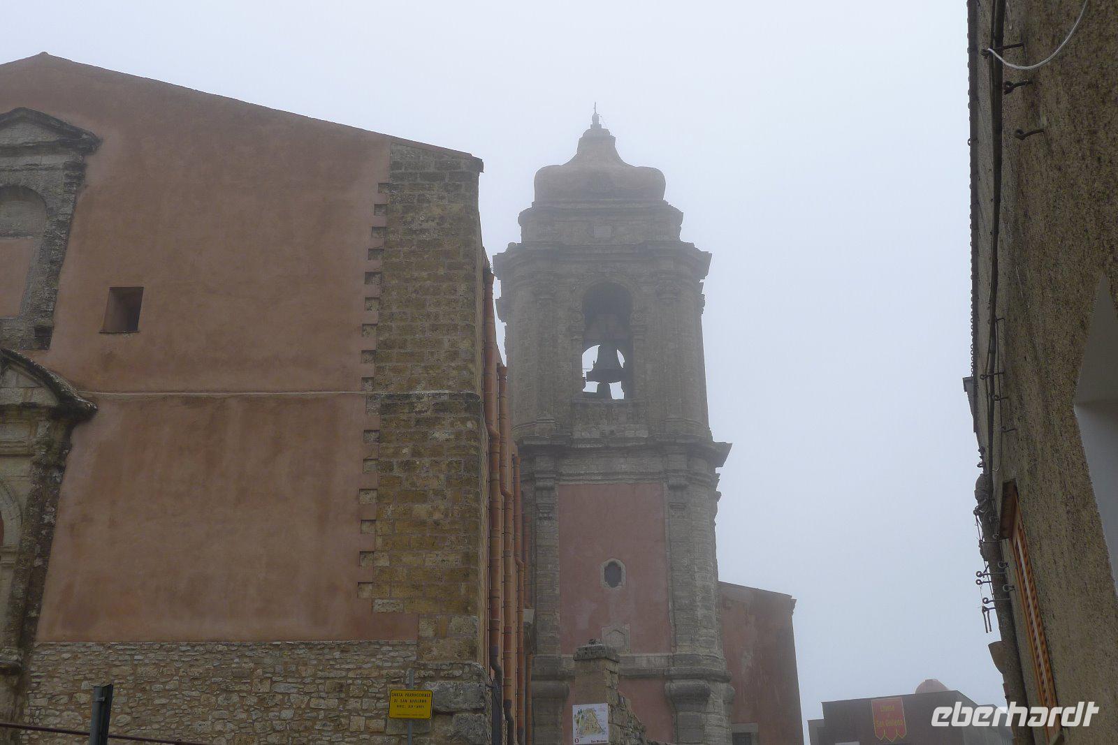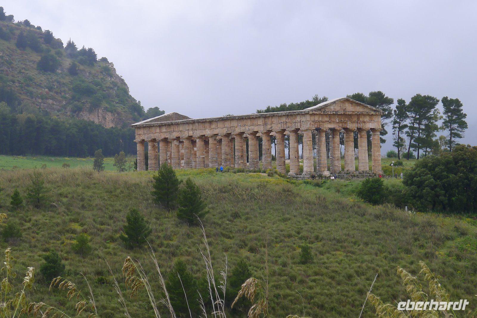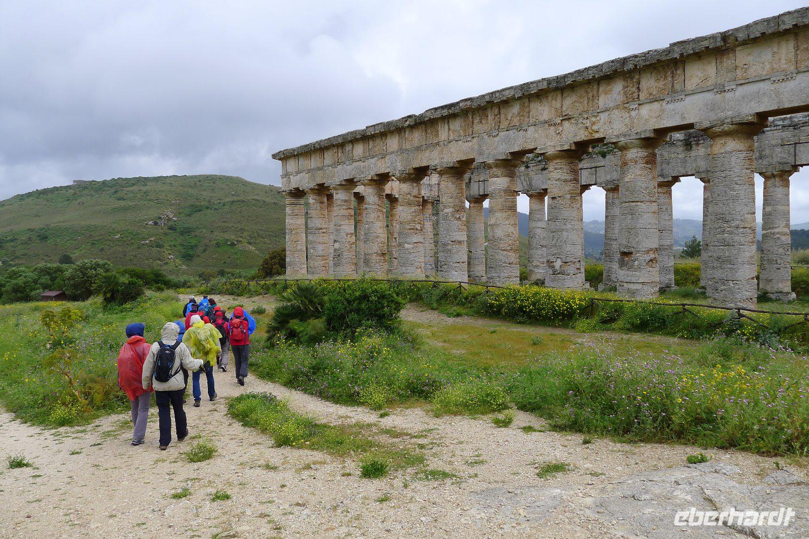 Heute morgen bewahrheitete sich leider doch die Wettervorhersage und dicke und graue Wolken hüllten uns ein. Wir fuhren erst einmal ganz hoch hinauf nach Erice, wo dicker Nebel dem Ort etwa Gespenstisches verlieh. Es blieb grau, von Zeit zu Zeit nieselte es etwas, aber unser Streifzug im menschenleeren Erice hatte fast etwas Mystisches. Die Zeit schien hier wirklich stehen geblieben zu sein. Und dann ging doch noch ein heftiger Regenguss nieder und wir flüchteten uns in ein Café, das neben den typischen Keksen aus Marzipan auch schmackhafte kleine Gerichte anbot. Da uns das Wetter keine Eile auferlegte, ließen wir es uns schmecken und hofften darauf, dass der Himmel ein Einsehen mit uns haben möge. Von unserem geplanten Besuch in Segesta ließen wir uns nicht abhalten. Der Regen hatte nach der Mittagspause nachgelassen und hörte schließlich ganz auf und wir genossen den Besuch bei dem beeindruckenden Tempel von Segesta, den wir nach kurzer Fahrt erreichten. Dann unternahmen wir noch eine kleine Wanderung zum Amphitheater. Schon auf dem Weg dorthin hatten wir immer wieder schöne Ausblicke über die grüne Landschaft. Auch der so harmonisch wirkende Tempel erschien uns immer wieder aus neuen Perspektiven. Den Rückweg vom Amphitheater legten wir im Eilschritt zurück, da uns unterwegs doch nochmals ein Regenguss überrascht hatte. Aber nun ging es ‚nach Hause', es war also halb so schlimm. Und außerdem war es ja nicht kalt. Im Hotel angekommen mussten wir erst einmal unsere nassen Schuhe ‚versorgen', die wir ja am Folgetag noch brauchen sollten. Abends erwartete uns die Köchin wieder mit einem äußerst kreativen Abendessen, einer richtigen italienischen cena, bestehend aus mehreren Gängen. Ihre hausgemachte Torte erinnerte an ein Tiramisù und war so lecker, dass wir doch tatsächlich nach einer zweiten Portion fragten. Nicht alle natürlich, nur diejenigen, die sich nicht beherrschen konnten und zu denen gehörte auch die Reiseleiterin J!
