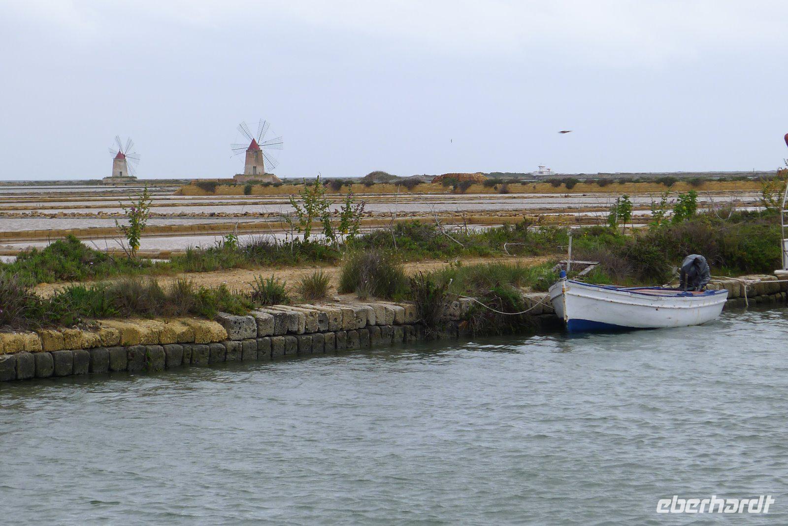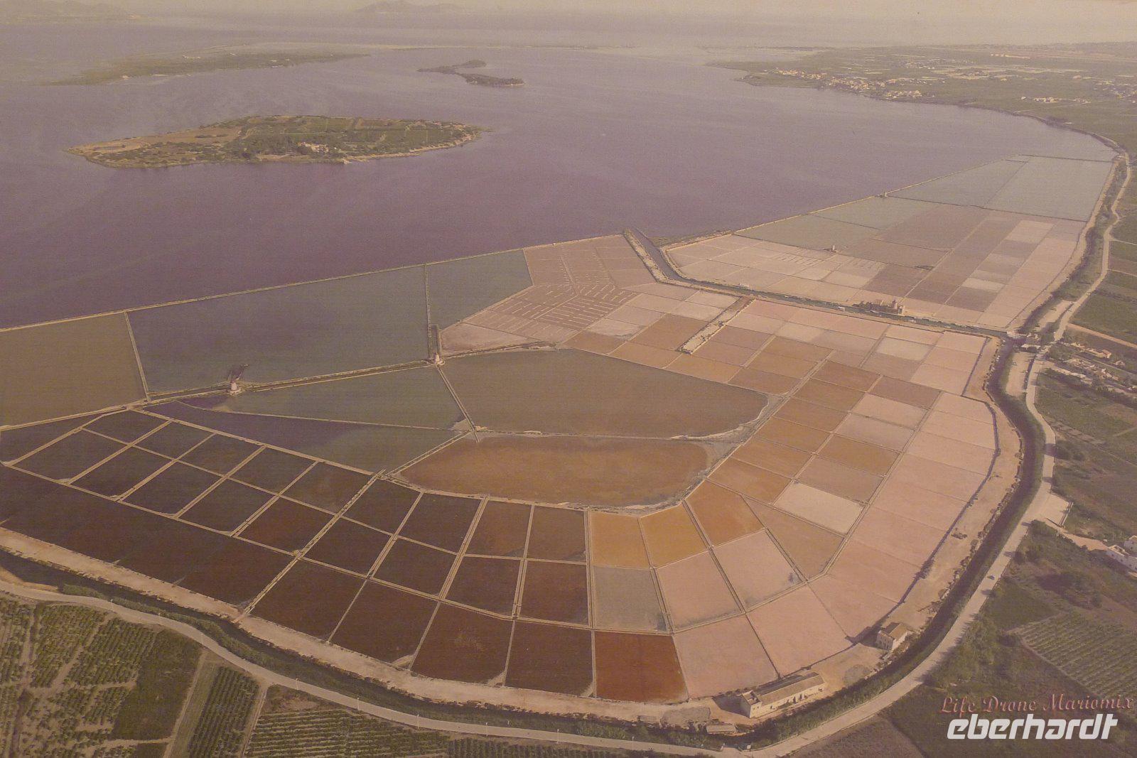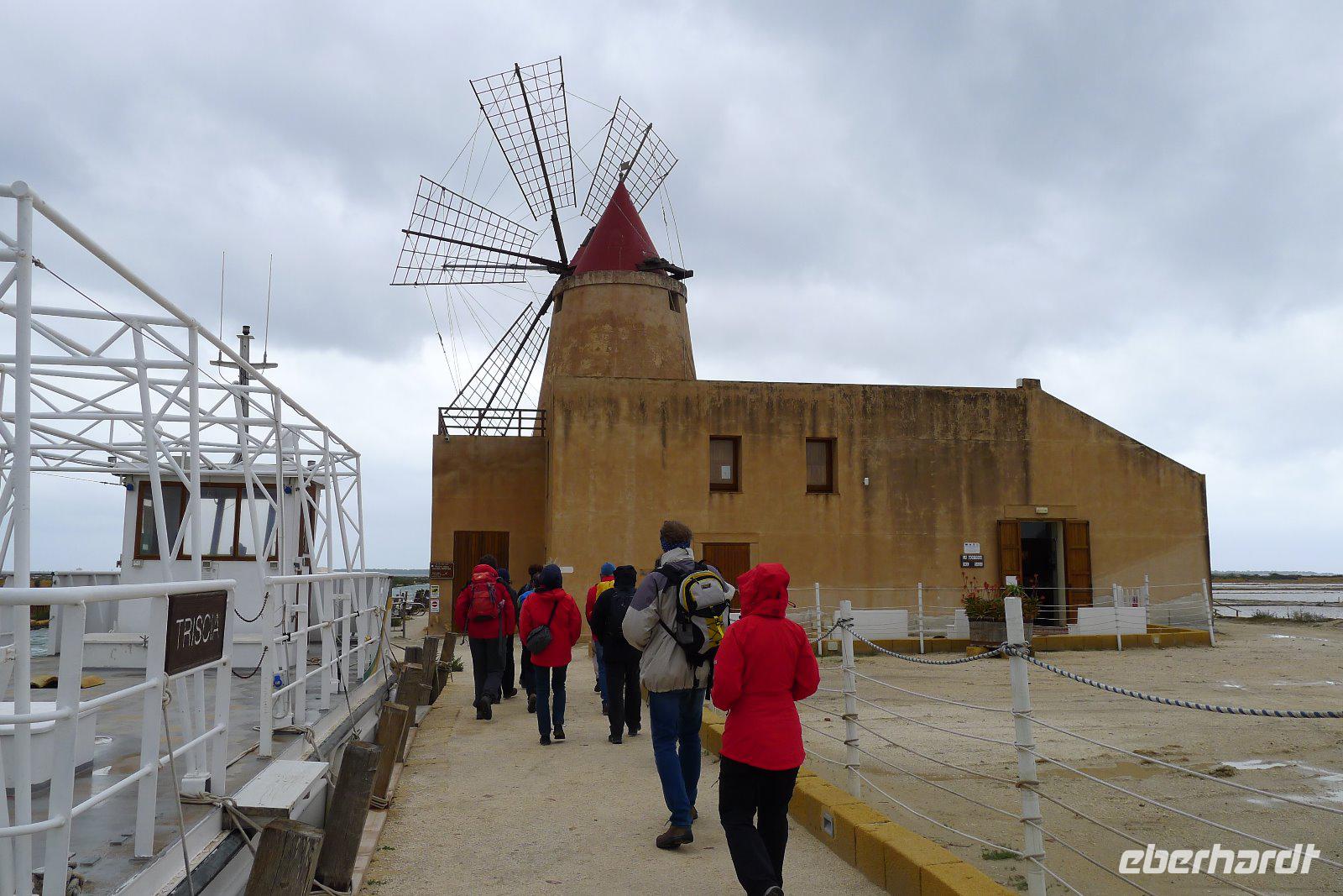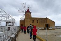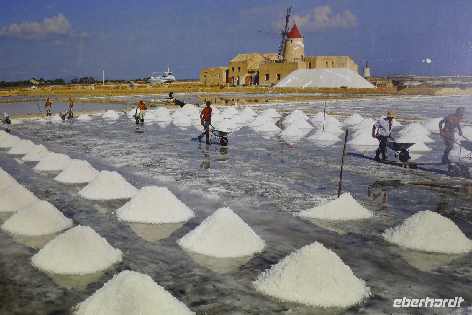 Heute war schon unser letzter Tag und ein klein wenig Wehmut breitete sich aus. Aber auch ein klein wenig Enttäuschung machte sich breit, denn wir glaubten, heute nochmals Sonne verdient zu haben. Aber nichts da - ganz im Gegenteil! Grau und nass war es. Dies zwang uns erst einmal zu einem Alternativprogramm, denn für das Naturreservat Zingaro brauchten wir wirklich schönes Wetter. Also ging es zu den Salinen in der Nähe von Trapani. Die schneeweißen Salzberge sieht man schon vom Weitem. Wir besuchten ein interessantes Museum und ließen uns die Geschichte der Salzproduktion erzählen. Unsere Mitreisende Marina wollte uns leider nicht in ihr Restaurant ‚Vecchia Marina' einladen. Und warum? Ist doch klar! Weil sie keine ‚vecchia' (alte), sondern ein ‚giovane' (junge) Marina war. So einfach ist das! Aber deshalb konnten wir trotzdem nicht kurzerhand das Restaurant bei den Salinen umbenennen! Zu schade aber auch!