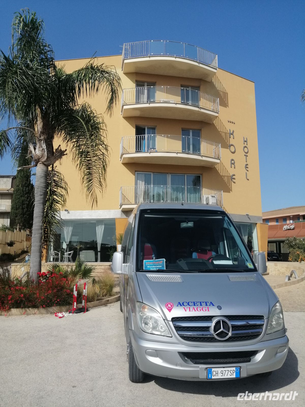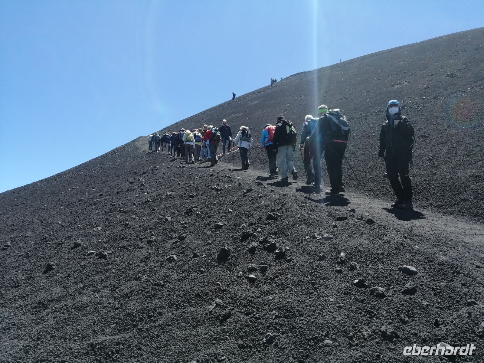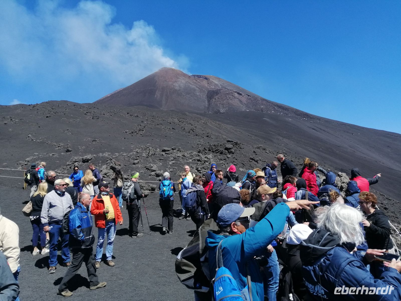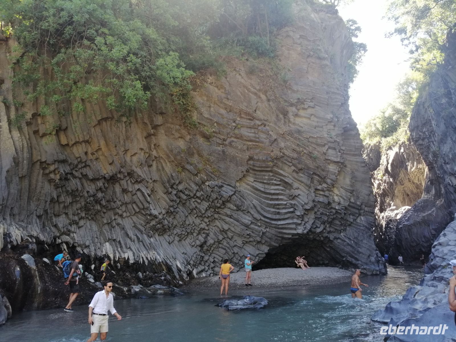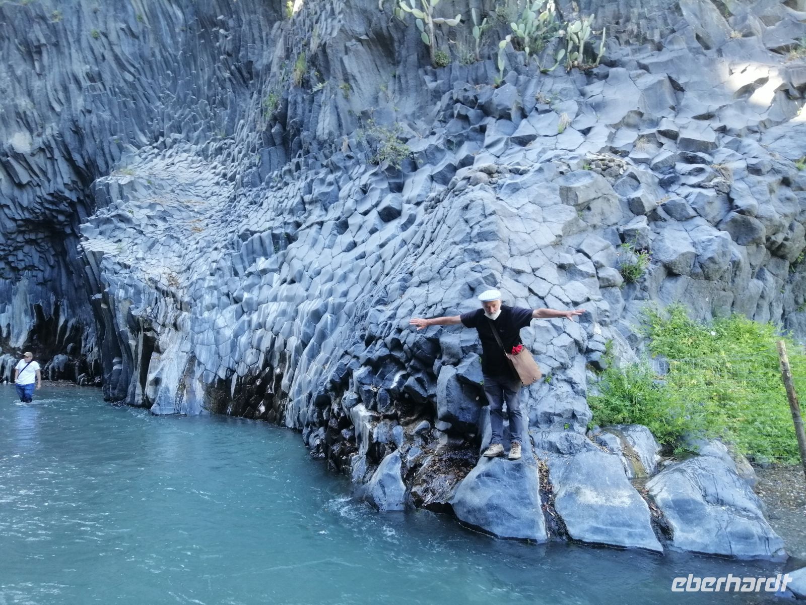 Heute erwartete uns ein sehr spannendes und intensives Programm, deshalb starteten wir eine halbe Stunde eher los als gestern! Zuerst fuhren wir mit unserem neuen Busfahrer Ignazio zum Vulkan Ätna! Auf der Serpentinstrasse zu Ätna machten wir einen kurzen Stopp und bewunderten den Eingang in einen alten Lava-Tunnel von Ätna! Unterwegs, erzählte uns Vincenzo über den großen Vulkanausbruch von 1669, der damals sehr viel Zertörung einrichtete. An der Seilbahnstation angekommen, fuhren wir damit auf die Höhe von 2.504 m hoch. Hier stiegen wir in einen Geländebus um und fuhren bis ca. 2.900 m hoch, um Ätna noch näher zu sein. Der ganze Hang war inzwischen sehr gut von Touristen besucht, die entweder mit den Geländebussen oder zu Fuß unterwegs waren, was bei dem fantastischen Wetter keine Überraschung war. Lokale Guides erklärten den Touristen an bestimmten Sammelstellen Geologie und Geschichte von Ätna. Da Ätna vor wenigen Tagen wieder etwas aktiver geworden ist, hörten wir immer wieder Eruptionen: gewaltiges Naturschauspiel. Als wir zum Nebenkrater aufgestiegen sind, konnten wir richtig in die "Chemie" eines Vulkans eintauchen: es brodelte ringsrum aus Fumarolen und roch nach Schwefel! Mit vielen Eindrücken und inzwischen ein bisschen Hunger, sind wir mit der Seilbahn zum Parkplatz abgestiegen. Als nächster Programmpunkt für heute stand die Weinverkostung. In einer gemütlichen kleinen Weinwirtschaft in Viagrande wurden wir schon erwartet. Die sehr nette Hausherrin begeisterte uns mit drei verschiedenen Weinsorten (Etna Rosato, Palmento Carricante, Etna Roso) aus der eigenen Produktion. Außerdem wurden wir mit verschiedenen hausgemachten kulinarischen Spezialitäten verwöhnt: Pizza, Käse und Salami, Oliven mit getrockneten Tomaten, Olivenbrot und dazu leckere Aufstriche und Marmelade! Selbstverständlich kauften einige Reisegäste Wein als Geschenck mit nach Hause. Nach der Weinverkostung fuhren wir dann zur Alcantara-Schlucht weiter. Der Abstieg in die Schlucht ging zwar über viele Stufen, daurte aber nicht lange. Der Wasserstand war nicht hoch, deshalb konnten wir mit den Füßes in den Fluß steigen und einen kleinen "Spaziergang" durch die Schlucht machen. Auch hier, in der Alcantara-Schlucht, spürten wir die Kraft und die Fanzination der Natur ähnlich wie auf Ätna ganz deutlich! Im Hotel angekommen, konnten wir uns entwerder an der Bar oder im Pool von einem erlebnisreichen Tag bis zum Abendessen etwas ausruhen. Morgen reisen wir durch Sizilien weiter!