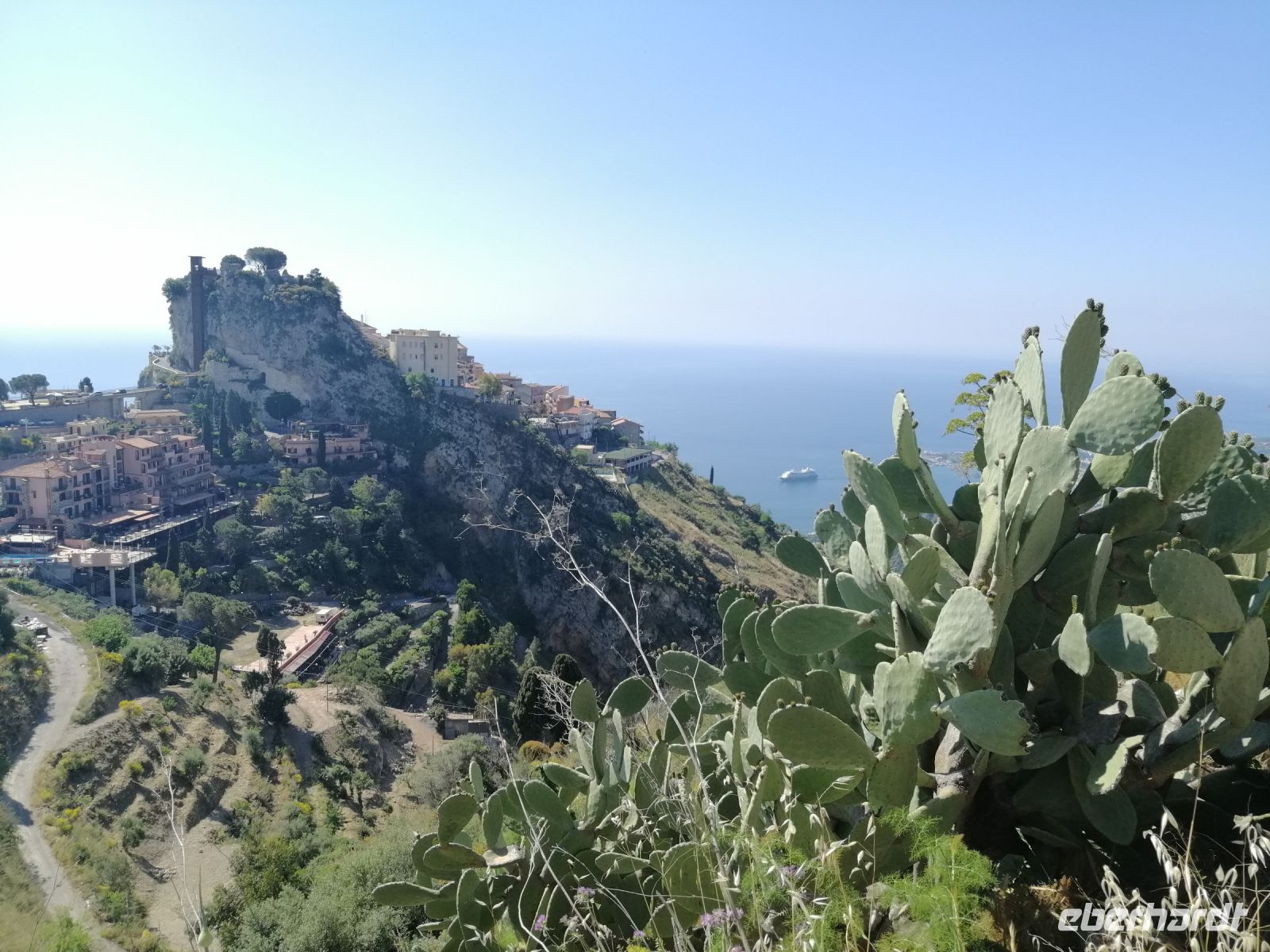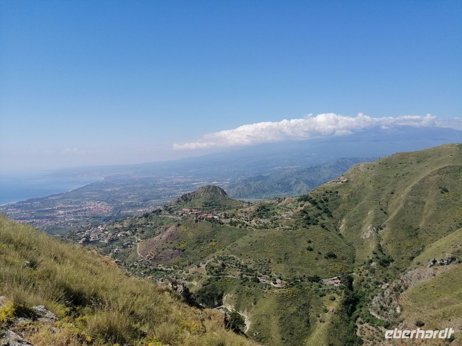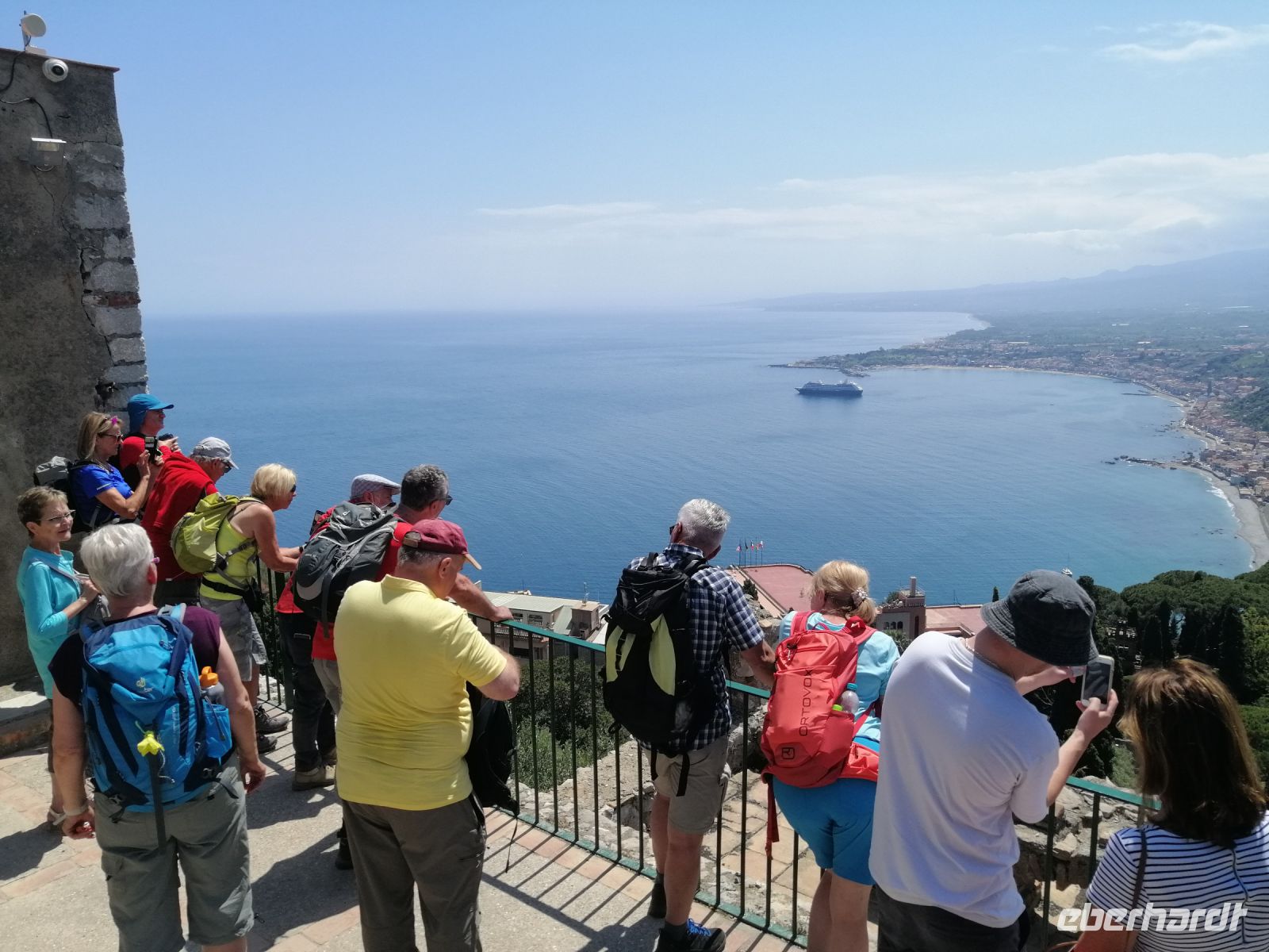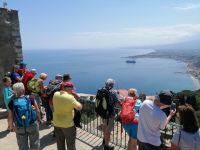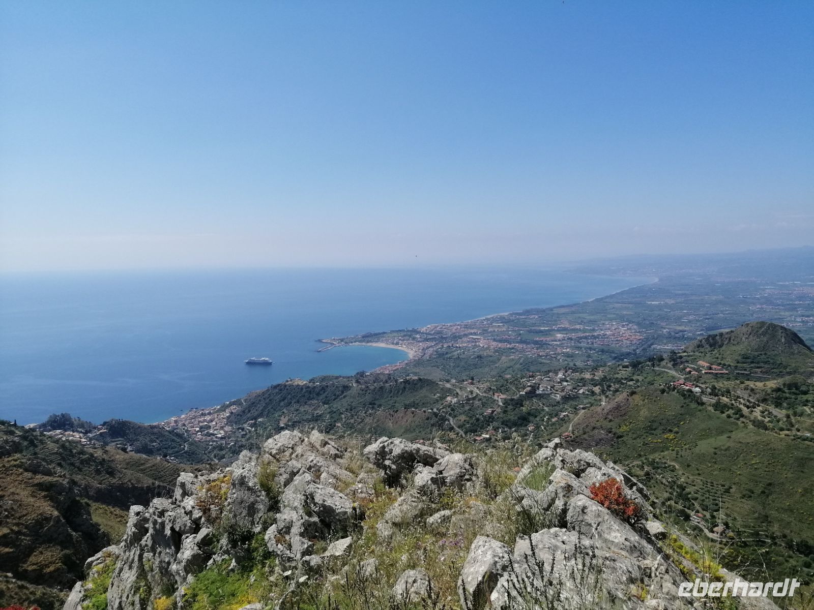 Nach dem Frühstück ging es los. Heute wurden wir von einer Dame gefahren: Florenza! Unser Wanderziel gleich am ersten Tag war der "Berg der Liebe" (Monte Veneretta). Während der Fahrt erzählte uns Vincenzo Einiges über die Geschichte Siziliens, vor allem über die ältere Bezeichnung der Insel - "Trinakria" wörtlich Dreikap. Im Ort Castelmola angekommen, stiegen wir aus: von hier aus startete unsere erste Wanderung. Wir wanderten an einem Friedhof vorbeit und stiegen gleich, teilweise steile Wege, bergauf. Vincenzo erzählte uns unterwegs immer wieder sehr unterhalsam über Rutenkraut, Steckfenchel und andere für diese Region typische Pflanzen:-) Gegen 12 Uhr waren wir ganz oben am Gipfel, ca. 1.000 m hoch und wurden mit einem wunderschönen Panorama bei bestem Wetter belohnt!