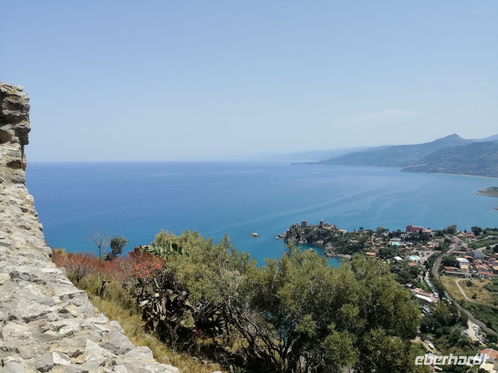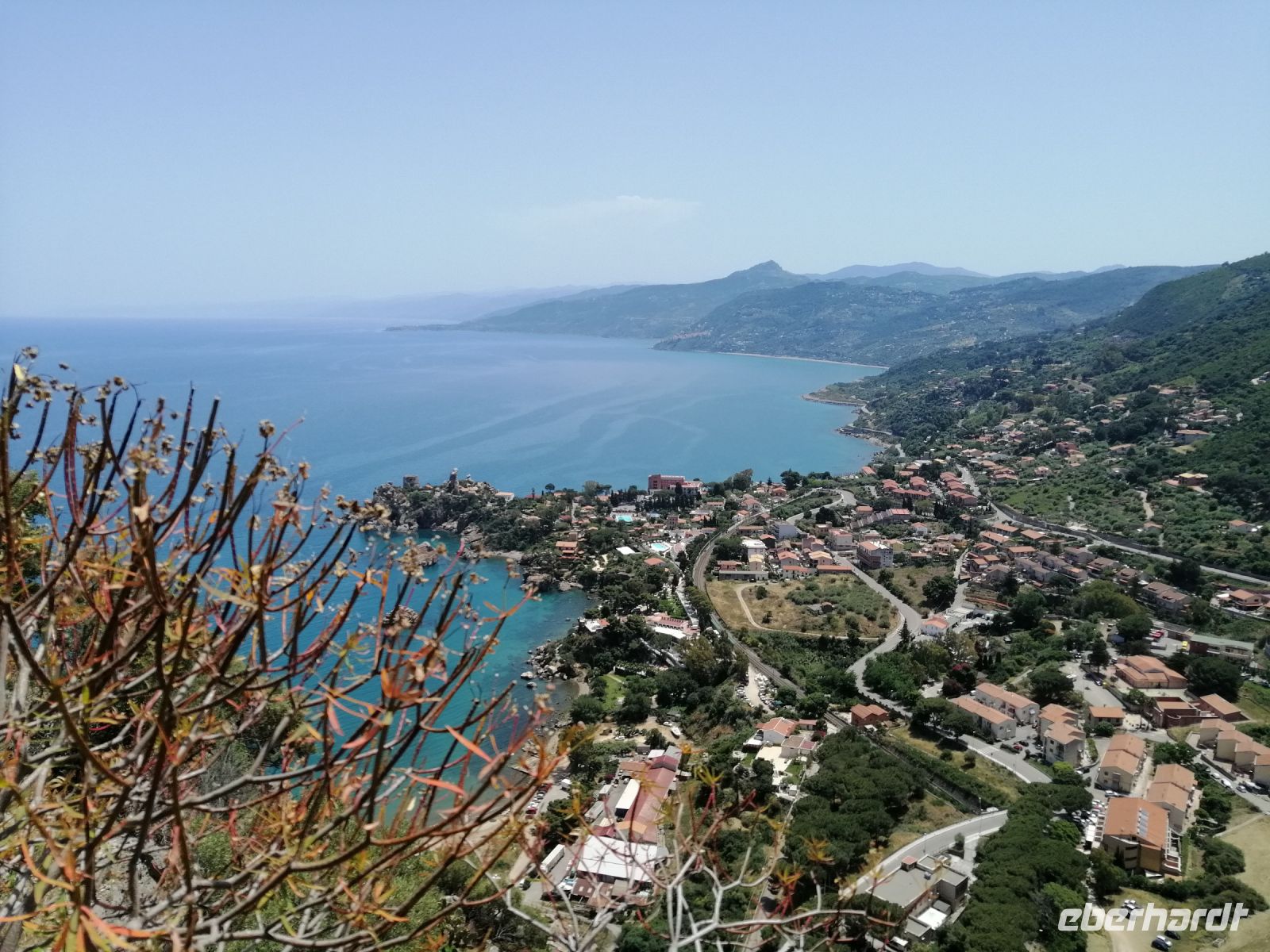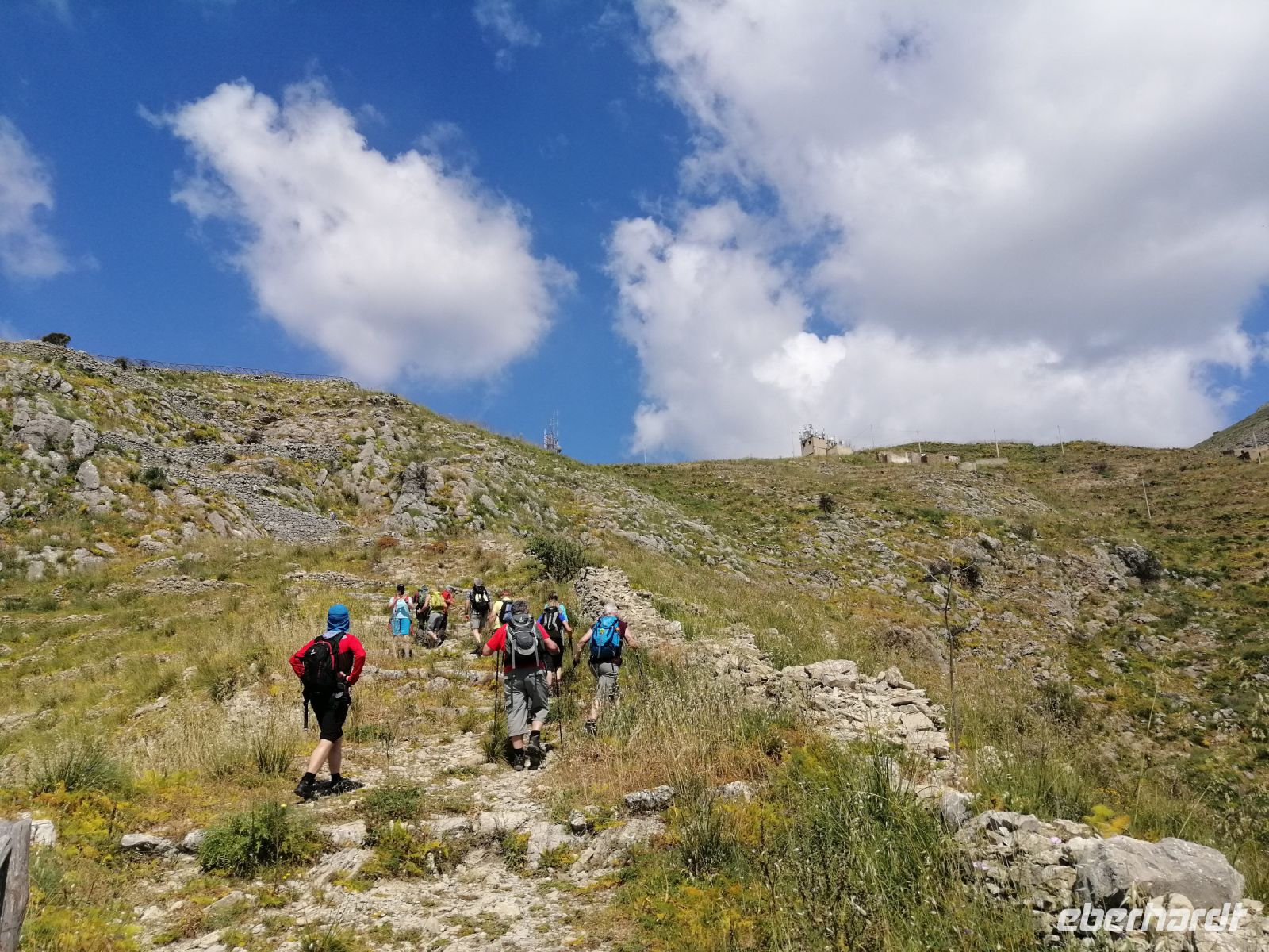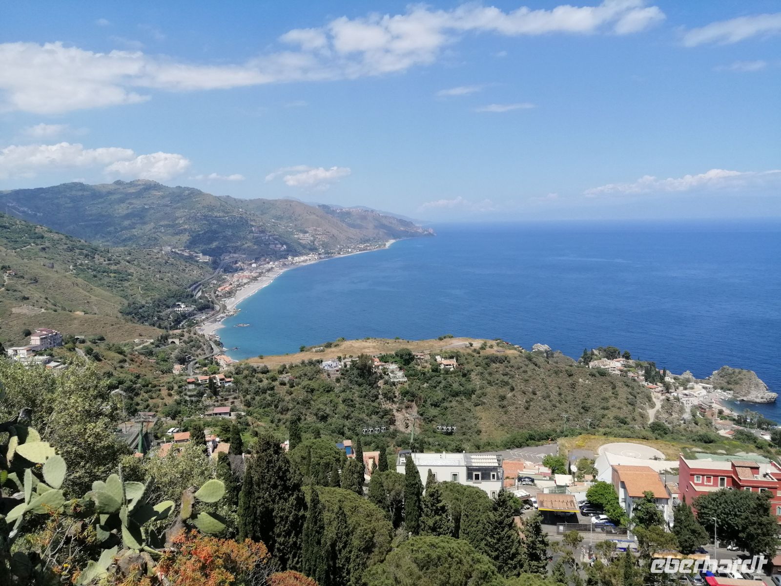Nach dem Frühstück ging es los. Heute wurden wir von einer Dame gefahren: Florenza! Unser Wanderziel gleich am ersten Tag war der "Berg der Liebe" (Monte Veneretta). Während der Fahrt erzählte uns Vincenzo Einiges über die Geschichte Siziliens, vor allem über die ältere Bezeichnung der Insel - "Trinakria" wörtlich Dreikap. Im Ort Castelmola angekommen, stiegen wir aus: von hier aus startete unsere erste Wanderung. Wir wanderten an einem Friedhof vorbeit und stiegen gleich, teilweise steile Wege, bergauf. Vincenzo erzählte uns unterwegs immer wieder sehr unterhalsam über Rutenkraut, Steckfenchel und andere für diese Region typische Pflanzen:-) Gegen 12 Uhr waren wir ganz oben am Gipfel, ca. 1.000 m hoch und wurden mit einem wunderschönen Panorama bei bestem Wetter belohnt!
