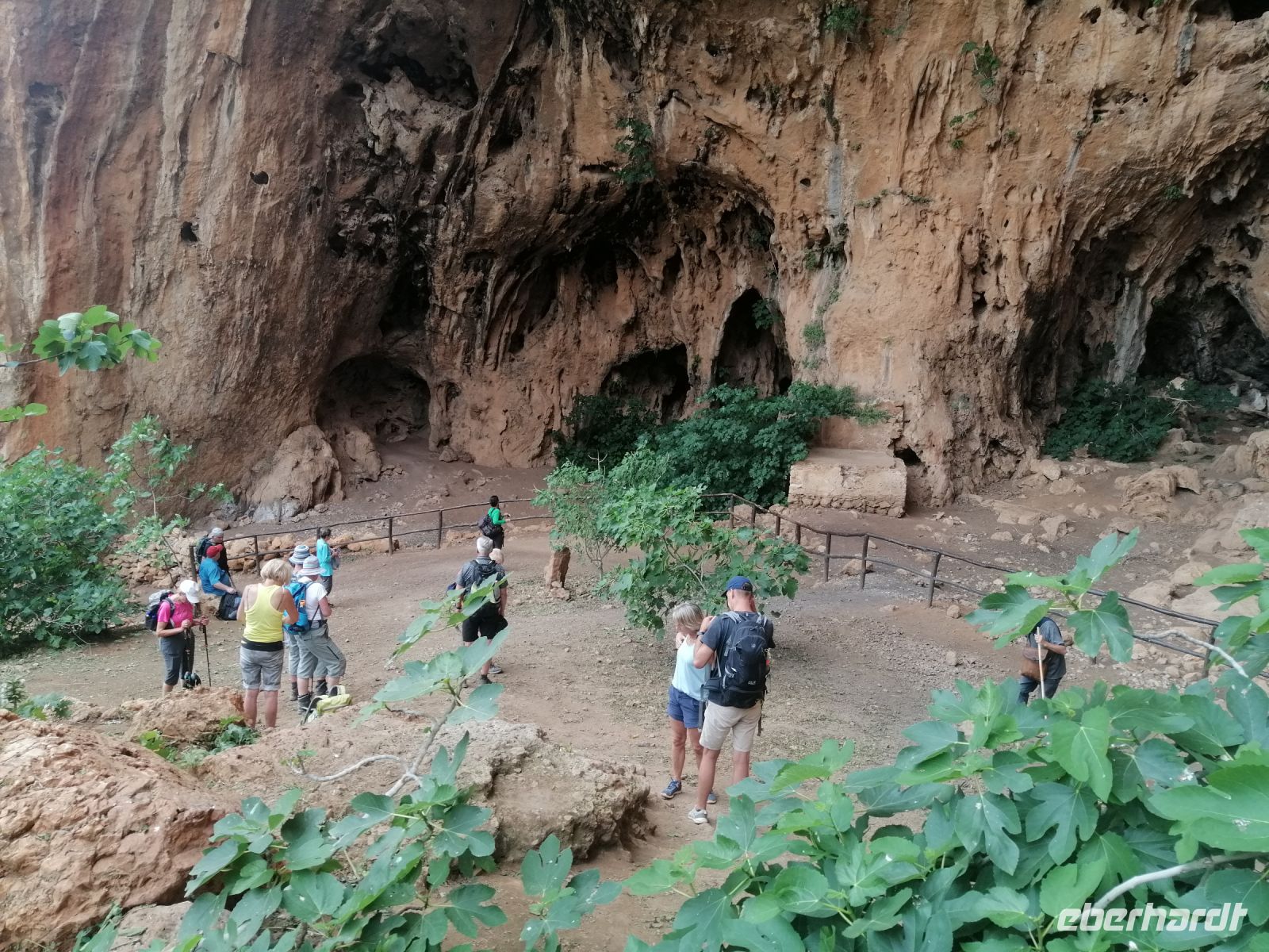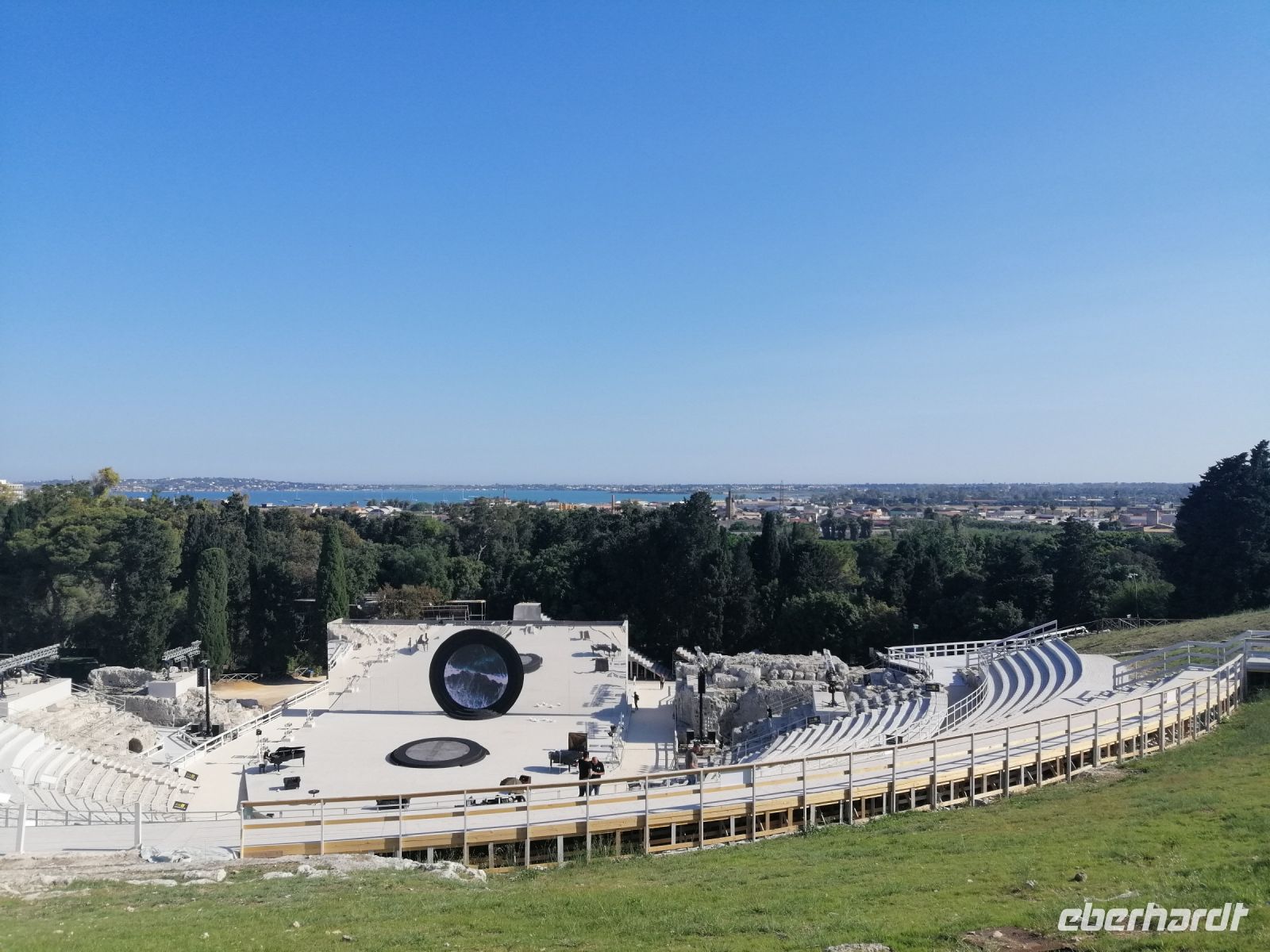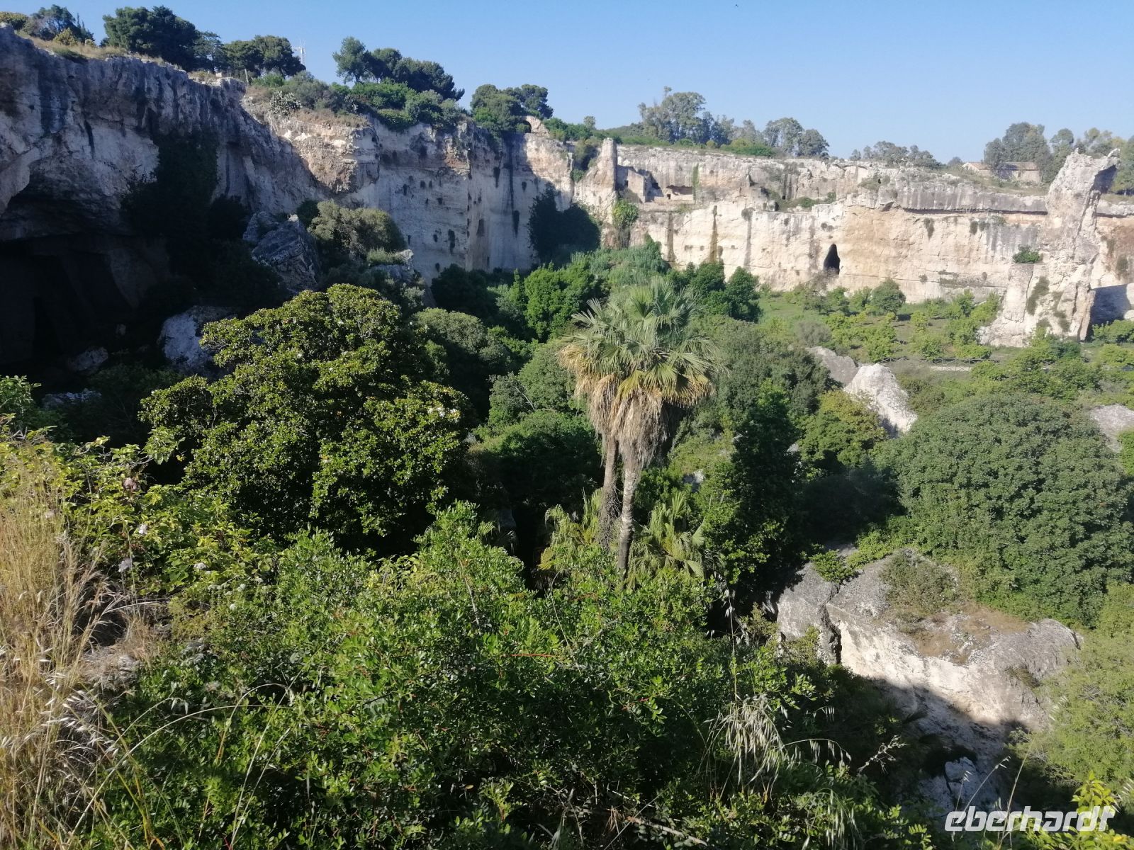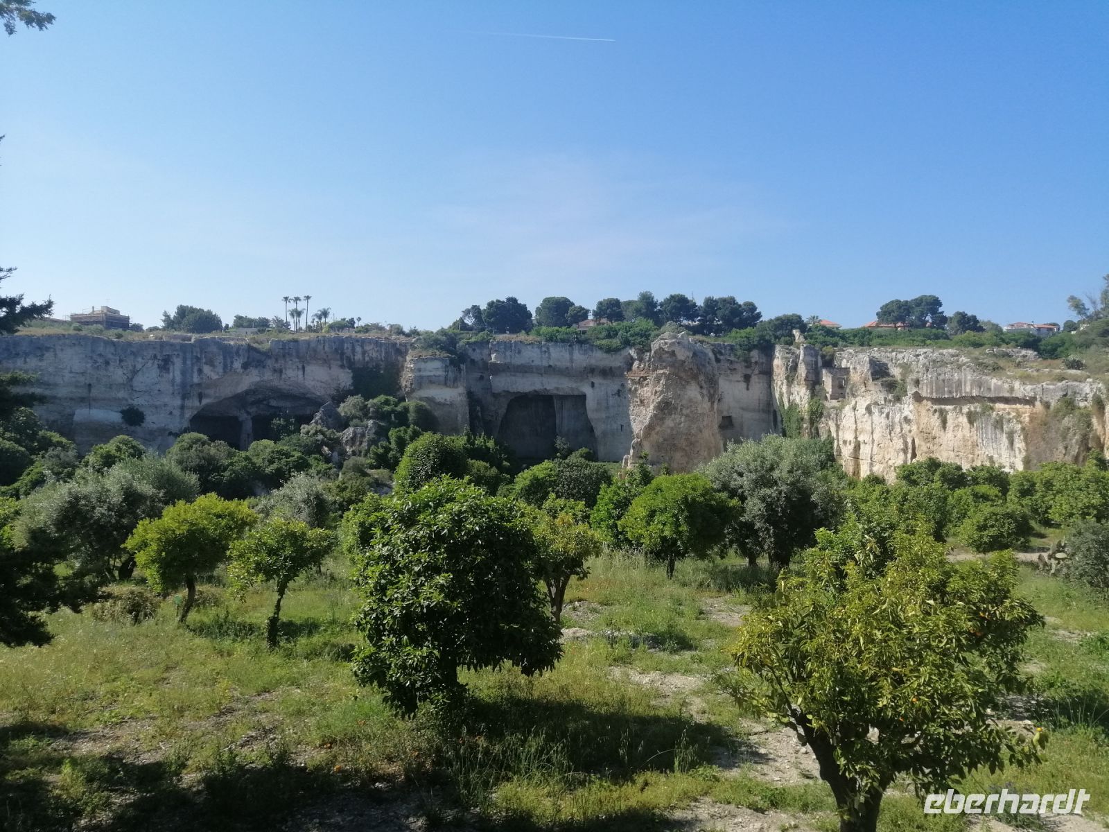 Nach dem Früstück und Auschecken aus dem Hotel, fuhr uns Ignazio nach Sortino, eine Kleinstadt auf der Hochebene von Pantálica. In einem Lebensmittelgeschäft kaufte ich mit Vincenzo für unseren Picknick heute typisches italienisches Essen ein und wir fuhren zum Startpunkt der heutigen Wanderung. Unsere Wanderung verlief entlang des Anapo-Flußes, auf einer alten Bahnstrecke mit vielen Tunneln und Brücken, die Mitte der 50. Jahre eingestellt wurde. Das es heute sehr heiß wurde, merkten wir, als wir aus dem schattigen Flußtal zum "Königlichen Palace" auf die Hochebene bergauf aufsteigen mussten. Nachdem Vincenzo uns mit der Geschichte der Nekropole (Höhlengräber aus dem 13. Jahrhundert) vertraut gemacht hat, gab es ein leckeres Picknick im Schatten der Bäume. Anschließend wanderten wir den geschichtprächtigen und naturbelassenen Wanderweg weiter und genossen nicht nur die tollen Aussichten, sondern auch die blühende Vegetation. Zum vereinbarten Treffepunkt kam Ignazio etwas verspätet, hat uns als Entschuldigung aber unterwegs und relativ spontan ein kaltes Bier ausgegeben, was seine Schuld erheblich reduziert hatte:-) Nach der Wanderung fuhren wir nach Syrakus zum archäologischen Park Neapolis. Seine Führung durch den archäologischen Park mit uns, begann Vincenzo mit der großen, alten Feige, die sich wie in einem Märchenwald auf ihre eigene Äste gestützt hat. Danach gingen wir in den hinteren Teil des Parks und besichtigten die Grotticelle Necropolis und das angebliche Grab von Archimedes. In der Nekropole befinden sich Gräber aus der griechischen und römischen Zeit, von denen nur noch die römischen kaiserlichen Kammergräber sichtbar sind. Unter diesen Kammergräbern befindet sich das angebliche "Grab des Archimedes". Wir liefen an einem Steinbruch vorbei, aus dem die Baumaterialien für das griechische Theater gewonnen wurden. Es wurden Höhlen gegraben, um den gut bearbeitbaren Kalkstein herauszuschneiden. Anschließend besuchten wir mit Vincenzo die Nymphengrotte. Diese befand sich sich im höchsten Teils des kleinen Bergreliefs, auf einer Terrasse, die oberhalb des griechischen Theaters verläuft, mit dem Wasserfall, der durch das Aquädukt Galermi gespeist wurde. Im griechischen Theater wurde gerade geprobt: wir konnten kurz zuschauen. Das Teatro Greco von Syrakus stammt aus dem 5. Jh. vor Christus und war mit einem Durchmesser von knapp 140 m eines der größten griechischen Theater. Es befand sich günstig gelegen am Hang des Temenite-Hügels. Der größte Teil der 67 Zuschauerreihen war direkt aus dem Stein herausgehauen worden. Die Zuschauerblöcke waren in 9 Sektoren unterteilt. Und zum Schluß zeigte uns Vincenzo das römische Amphitheater. Es war eines der attraktivsten in römischer Zeit und ebenfalls größtenteils direkt in den Stein gehauen. Mit seinen 140 m Länge und 119 m Breite gehörte es zu den großen Amphitheatern. Es hatte zwei Zugänge und im Untergrund auch die Möglichkeit der Flutung, um zusätzlich zu Gladiatorenkämpfen und Tierkämpfen auch Seeschlachten austragen zu können. Glücklich und müde fuhren wir dann zu unserem neuen Landhotel, wo wir uns frisch machen konnten. Abends trafen wir uns zum 3. Gänge-Abendbrot und liesen den erlebnisreichen Tag bei einheimichen Weinen gemütlich ausklingen.