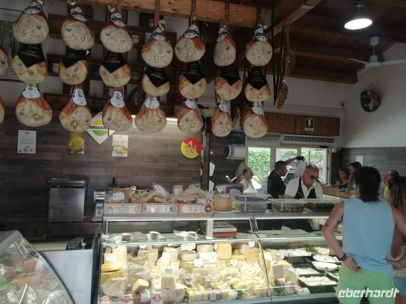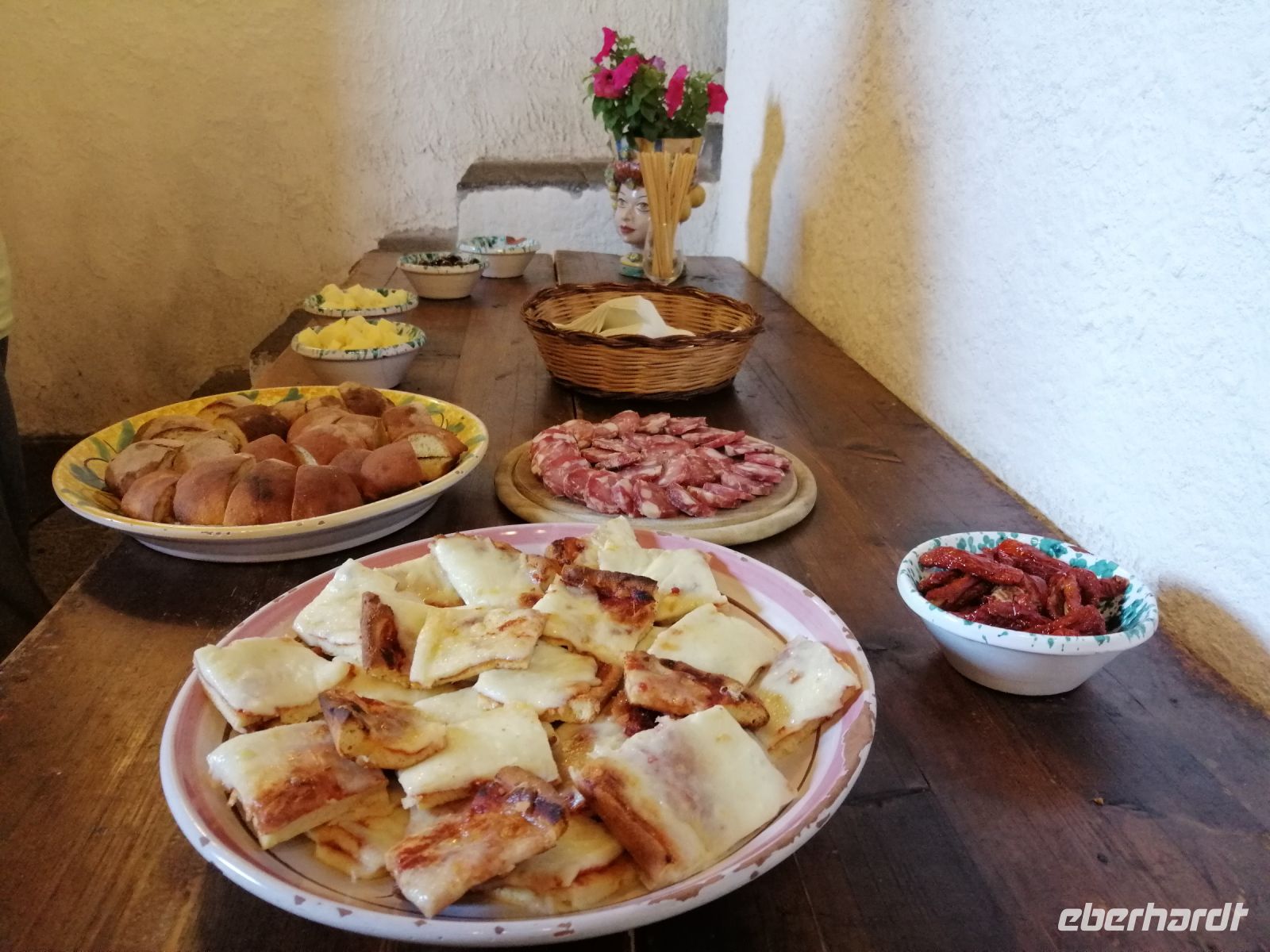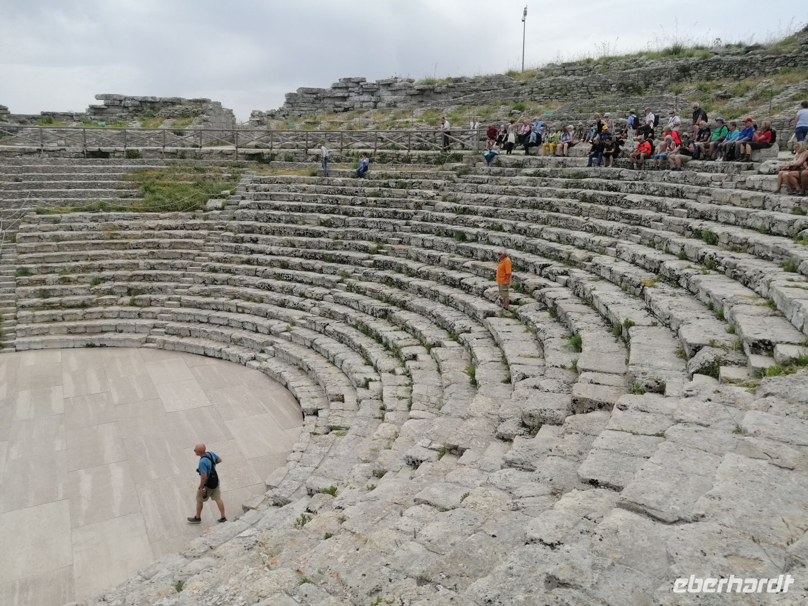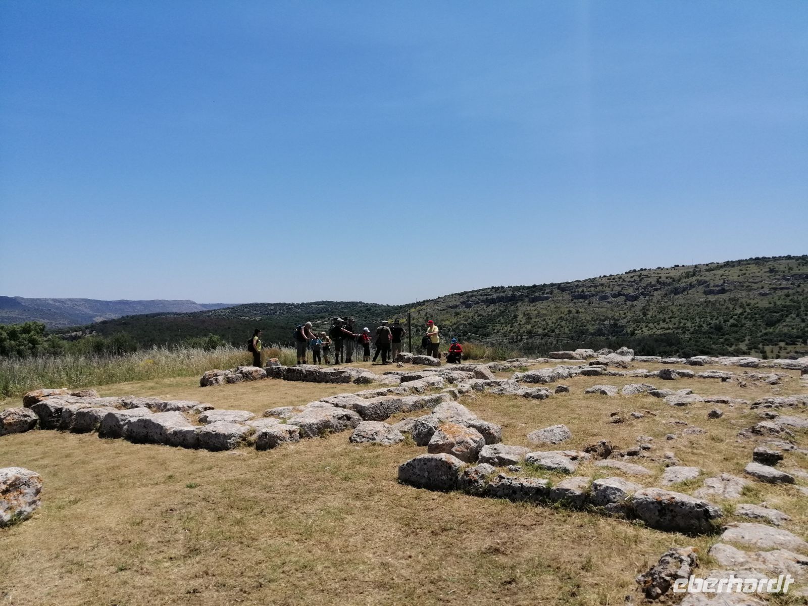 Nach dem Früstück und Auschecken aus dem Hotel, fuhr uns Ignazio nach Sortino, eine Kleinstadt auf der Hochebene von Pantálica. In einem Lebensmittelgeschäft kaufte ich mit Vincenzo für unseren Picknick heute typisches italienisches Essen ein und wir fuhren zum Startpunkt der heutigen Wanderung. Unsere Wanderung verlief entlang des Anapo-Flußes, auf einer alten Bahnstrecke mit vielen Tunneln und Brücken, die Mitte der 50. Jahre eingestellt wurde. Das es heute sehr heiß wurde, merkten wir, als wir aus dem schattigen Flußtal zum "Königlichen Palace" auf die Hochebene bergauf aufsteigen mussten. Nachdem Vincenzo uns mit der Geschichte der Nekropole (Höhlengräber aus dem 13. Jahrhundert) vertraut gemacht hat, gab es ein leckeres Picknick im Schatten der Bäume. Anschließend wanderten wir den geschichtprächtigen und naturbelassenen Wanderweg weiter und genossen nicht nur die tollen Aussichten, sondern auch die blühende Vegetation. Zum vereinbarten Treffepunkt kam Ignazio etwas verspätet, hat uns als Entschuldigung aber unterwegs und relativ spontan ein kaltes Bier ausgegeben, was seine Schuld erheblich reduziert hatte:-) Nach der Wanderung fuhren wir nach Syrakus zum archäologischen Park Neapolis. Seine Führung durch den archäologischen Park mit uns, begann Vincenzo mit der großen, alten Feige, die sich wie in einem Märchenwald auf ihre eigene Äste gestützt hat. Danach gingen wir in den hinteren Teil des Parks und besichtigten die Grotticelle Necropolis und das angebliche Grab von Archimedes. In der Nekropole befinden sich Gräber aus der griechischen und römischen Zeit, von denen nur noch die römischen kaiserlichen Kammergräber sichtbar sind. Unter diesen Kammergräbern befindet sich das angebliche "Grab des Archimedes". Wir liefen an einem Steinbruch vorbei, aus dem die Baumaterialien für das griechische Theater gewonnen wurden. Es wurden Höhlen gegraben, um den gut bearbeitbaren Kalkstein herauszuschneiden. Anschließend besuchten wir mit Vincenzo die Nymphengrotte. Diese befand sich sich im höchsten Teils des kleinen Bergreliefs, auf einer Terrasse, die oberhalb des griechischen Theaters verläuft, mit dem Wasserfall, der durch das Aquädukt Galermi gespeist wurde. Im griechischen Theater wurde gerade geprobt: wir konnten kurz zuschauen. Das Teatro Greco von Syrakus stammt aus dem 5. Jh. vor Christus und war mit einem Durchmesser von knapp 140 m eines der größten griechischen Theater. Es befand sich günstig gelegen am Hang des Temenite-Hügels. Der größte Teil der 67 Zuschauerreihen war direkt aus dem Stein herausgehauen worden. Die Zuschauerblöcke waren in 9 Sektoren unterteilt. Und zum Schluß zeigte uns Vincenzo das römische Amphitheater. Es war eines der attraktivsten in römischer Zeit und ebenfalls größtenteils direkt in den Stein gehauen. Mit seinen 140 m Länge und 119 m Breite gehörte es zu den großen Amphitheatern. Es hatte zwei Zugänge und im Untergrund auch die Möglichkeit der Flutung, um zusätzlich zu Gladiatorenkämpfen und Tierkämpfen auch Seeschlachten austragen zu können. Glücklich und müde fuhren wir dann zu unserem neuen Landhotel, wo wir uns frisch machen konnten. Abends trafen wir uns zum 3. Gänge-Abendbrot und liesen den erlebnisreichen Tag bei einheimichen Weinen gemütlich ausklingen.