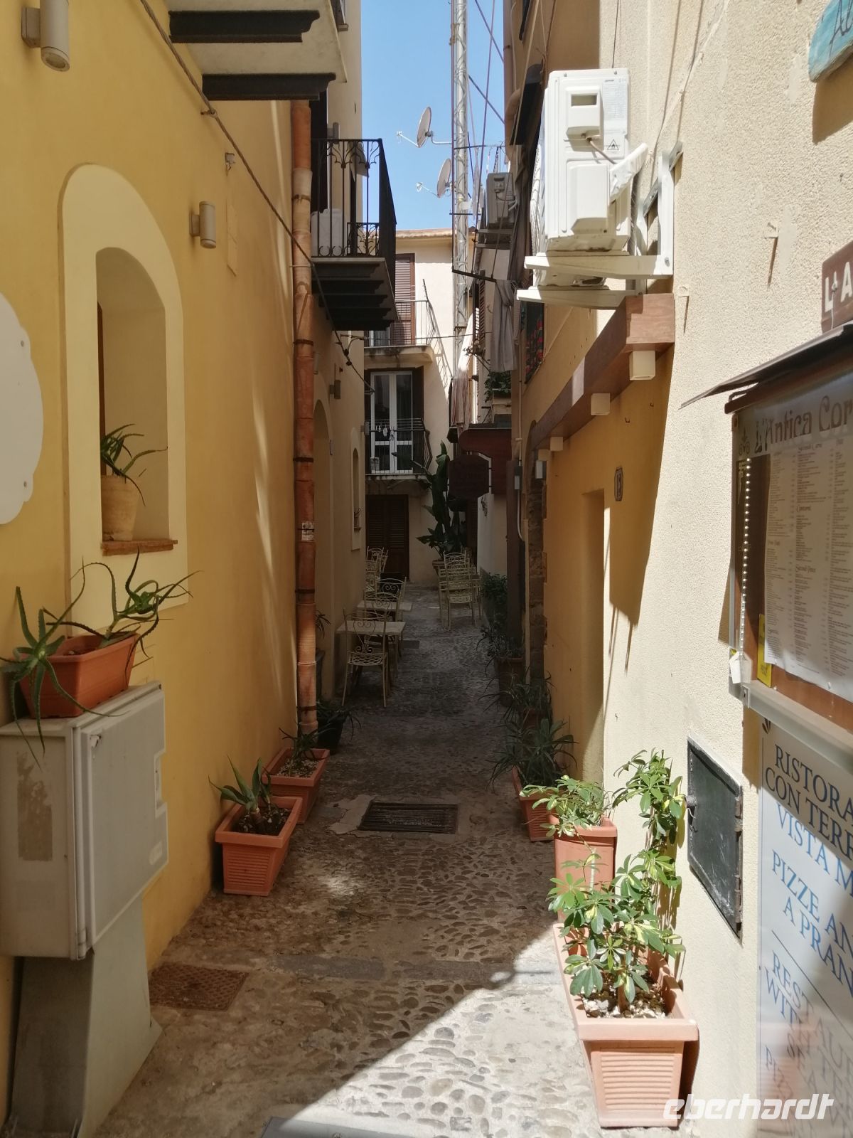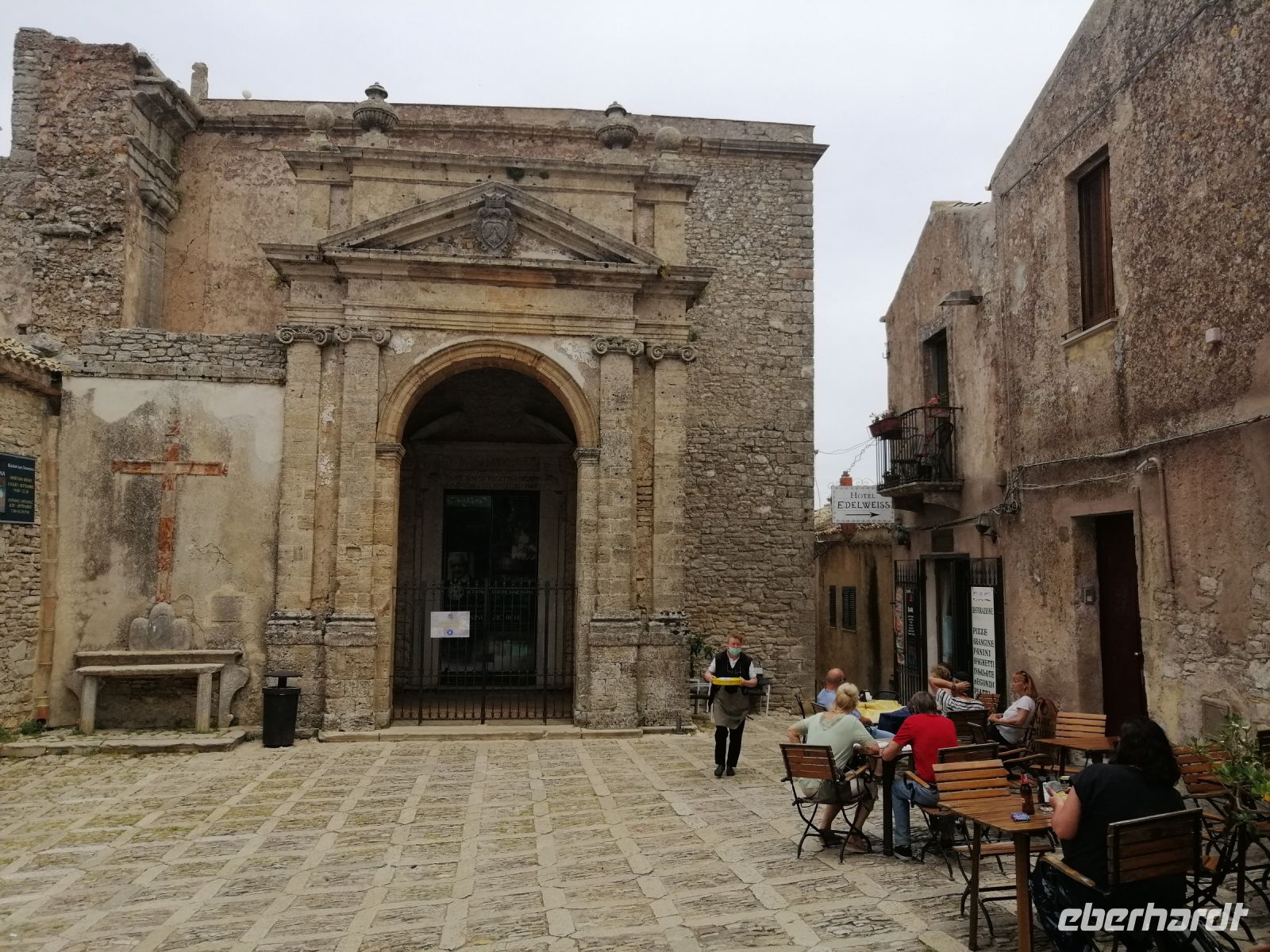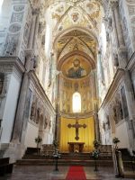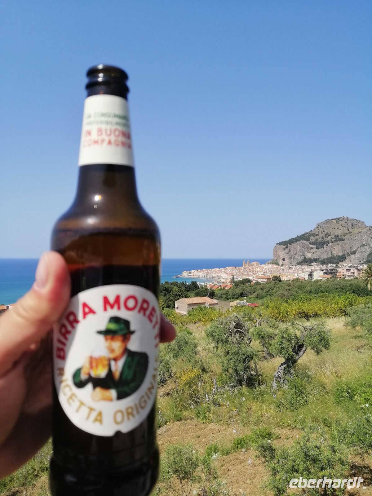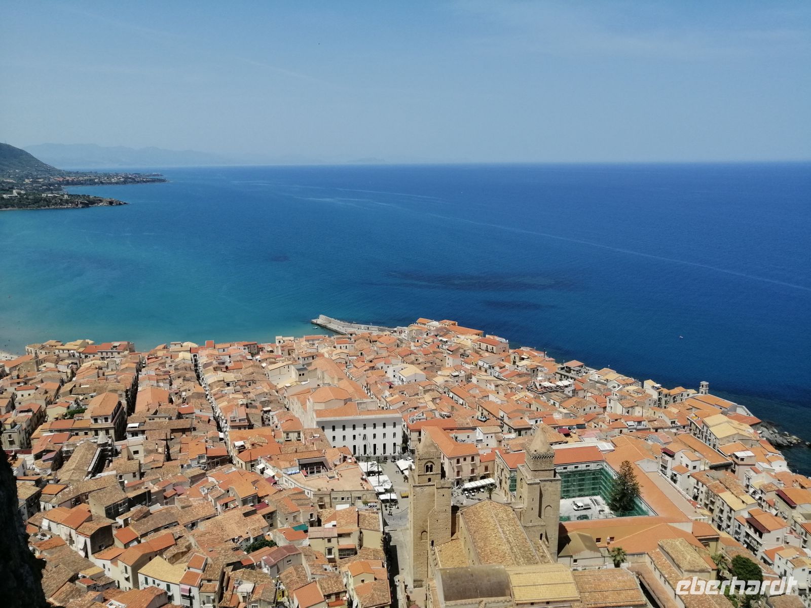 Nach dem Früstück und Ausschecken im Hotel fuhr uns unser neue Busfahrer Juseppe an die Nordküste Siziliens nach Cefalú. In Cefalú unternehmen wir einen Spaziergang durch die Altstadt und besichtigten anschließend den Normannen-Dom. Im Dom machte Vincenzo für uns eine Führung und erzählte uns eine Legende: Der normannische Dom wurde 1130 von Roger II gegründet, der einer Sage zufolge geschworen hatte, eine Kirche zu bauen, wenn er mit seiner Flotte auf dem Weg von Palermo aus heil aus einem Sturm zurückkehren würde. Er wurde an den Strand bei Cefalú ans Land gespült, wo der König wie versprochen den Grundstein dieses beeindruckenden Gebäudes legte. Es ist zweifelsohne eine der schönsten Kathedralen der Welt und ein perfektes Beispiel für den mediterranischen, romanischen Stil. Die Fassade mit den ein- und zweibögigen Fenstern wird von zwei Flankentürmen dominiert, die 1240 gebaut wurden. 1472 wurde ein dritter Säulengang hinzufügt. Die Kirche hat drei Schiffe und zwei Reihen mit Marmorsäulen, darauf ein Bogengang mit sieben Bögen. Die Holzdecke des Mittelschiffes ist bemalt und ein typisches Beispiel islamischer Kunst, das rechte Schiff enthält ein Taufbecken aus dem 12. Jahrhundert. Die Apsis, das Kreuzgewölbe und die angrenzenden Wände sind mit Goldmosaiken dekoriert, deren Hauptmotiv der Schöpfer (Christus Pantocrator) ist. Unter ihm sitzen die Jungfrau Maria, die Apostel sowie einige Engel. Nach der Dom-Besichtigung stiegen wir auf den Berg Rocca di Cefalú hoch und genossen die fabelhafte Aussicht Richtung Tyrrhenische Meer. Nach dem Abstieg gab es Freizeit, die zum Baden, Mittag essen, Kaffee trinken oder Eis essen oder alles zusammen genutzt wurde. Am Nachmittag fuhr uns Juseppe nach Trapani ABER kurz nach Ortsausgang Cefalú gab es eine von mir sehr mühsam vorbereitete Übrraschung: ein kaltes Bier mit Blick auf Rocca di Cefalú:-)! Nach dem Abendessen in unserem neuen Hotel in Trapani unternahmen wir abends einen Spaziergang durch die Altstadt.