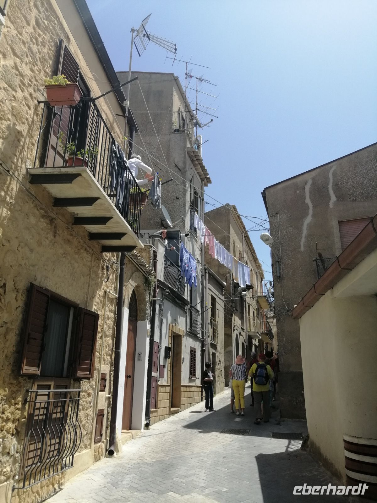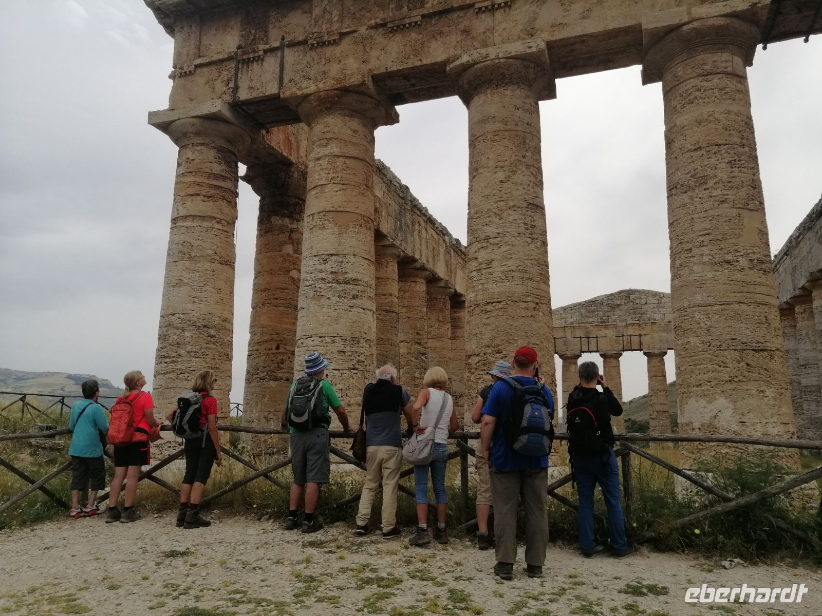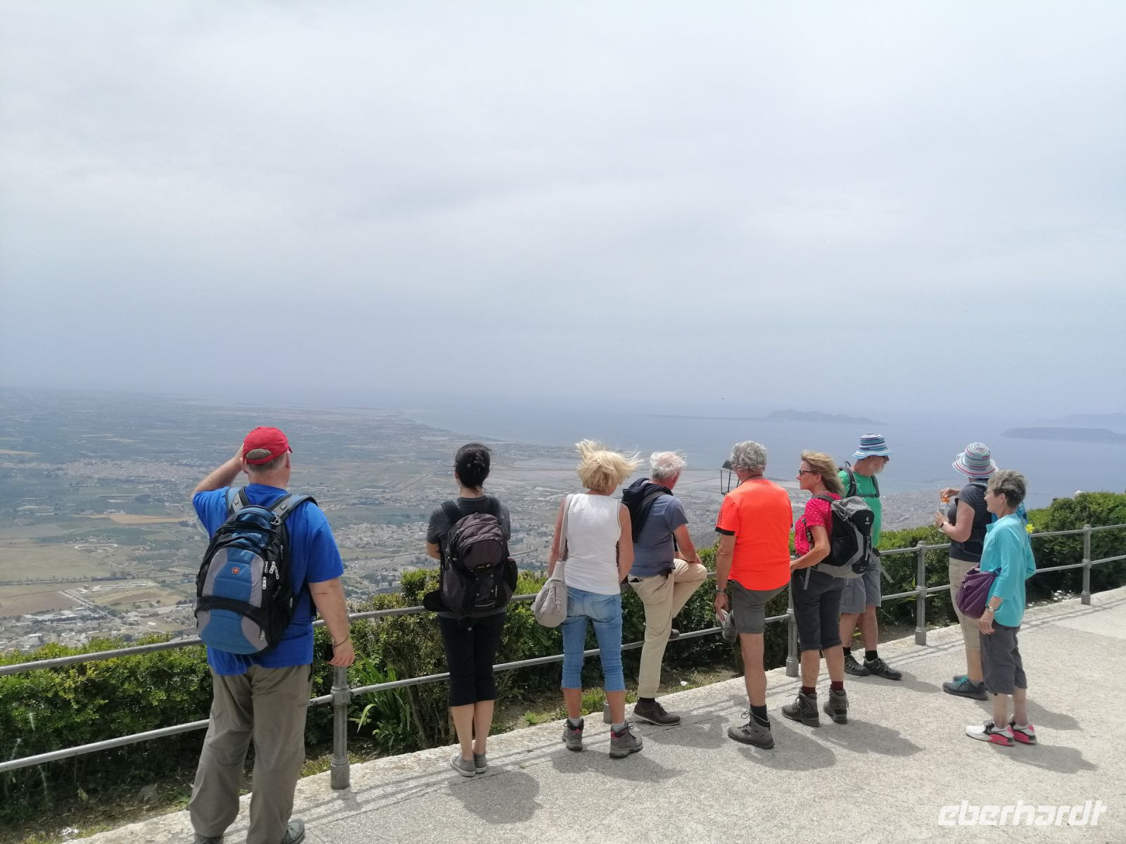 Nach dem Frühstück fuhr uns Juseppe nach Segesta. Dort besichtigten wir einen der besterhaltenen griechischen Tempel Siziliens und eines der schönsten antiken Amphitheater. Der Tempel wurde im 5.Jrh v.Chr. gebaut und hat die Form eines dorischen Perystils, mit 6 Säulen an den Fassaden und mit 14 an den langen Seiten. Er bedeckt eine Grundfläche von 61,15 x 26,25 m. Seine Stufen wurden nie vollendet. Wie überhaupt der gesamte Tempel nie vollendet wurde. Generell widerspricht er der üblichen griechischen Bauweise, wo mit der Cella begonnen wurde und der Säulengang dann drumherum errichtet wurde. In Segesta allerdings gibt keine Spuren einer Cella. Nach der Besichtigung des Tempels wanderten wir den fast zugewachsenen alten Wanderweg Berg hoch, zum Amphitheater. Durch seine Lage mit Blick auf eine Landschaft mit zum Meer hin abfallenden Hügeln kann man es wirklich als eines der schönsten antiken Theater bezeichnen. Es wurde teilweise über einer heiligen Grotte des Elymerkult gebaut. Der Eingang zur Grotte befindet sich unter dem Zuschauerraum. Das gesamte Theater ist von einer halbkreisförmigen Mauer umgeben. Wir stiegen wieder ab und gönnten uns ein Eis oder ein Glas (Plastebächer) Bier (aber VORSICHT: für 6 EUR!). Von Segesta aus fuhr uns Juseppe in die Antikestadt Erice, die auf dem gleichnamigen, rund 750 Meter hohen Berg Monte Erice thront. In Erice unternahmen wir zuerst einen Stadtrundgang. Vincenzo erzählte uns über die wichtigsten Sehenswürdigkeiten der Stadt. Erice selber ist urig, verwinkelt und einfach wunderschön. Die kleinen, engen Gassen, die ab und an recht steil sind, die kopfsteingepflasterten Marktplätze, die uralte Stadtmauer – diese Stadt verzaubert einen und man fühlt sich glatt um Jahrhunderte zurückversetzt. Nach der Stadtführung hatten wir ausreichend Freizeit, um die Stadt zu erkunden und sich kulinarisch verwöhnen zu lassen. Am späteren Nachmittag fuhren wir nach Trapani und besuchten noch die Salinen. Vincenzo erklärte uns die grobe Arbeitsabläuge der Salzgewinnung und übersetzte bei einem Salzhändler, der dirt seinen Verkaufsstand hatte. Anschließend fuhren wir mit dem Bus zum Hotel, verabschiedenet sich vom Juseppe und traffen uns zum gemeinsamen Abednessen. Nach dem Abendessen organiserte ich für unsere Gruppe ien separaten Raum und wir konnten uns bei einem Glas Prosecco unsere Wanderreise Revue passieren lassen, bedankten uns bei Vencenzo für seine tolle Reisebegleitung! Ihm ist es definitiv gelungen, ein Teil seiner Liebe zu Sizilien mit uns zu teilen, sodass wir etwas von seiner Heimat mit nach Hause nehmen können! Wir verabschiedeten uns auch von den Gästen, die morgen etwas später zum Flughafen nach Palermo fahren wollten.
