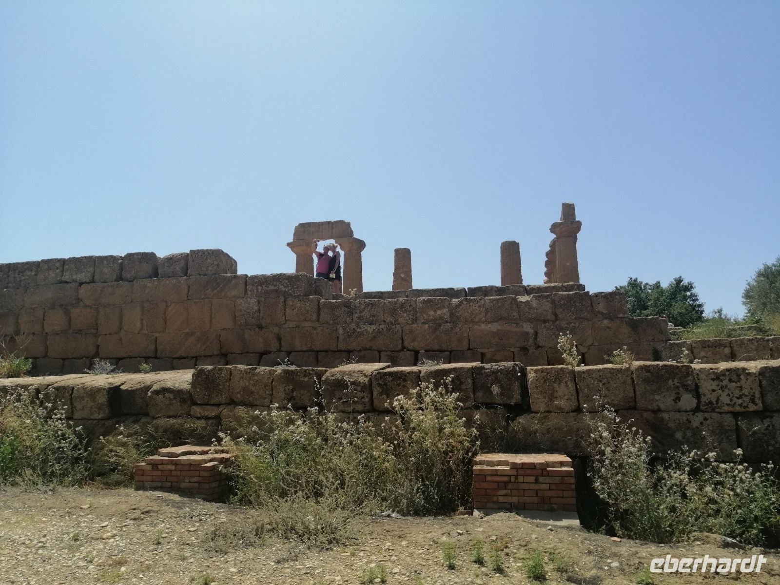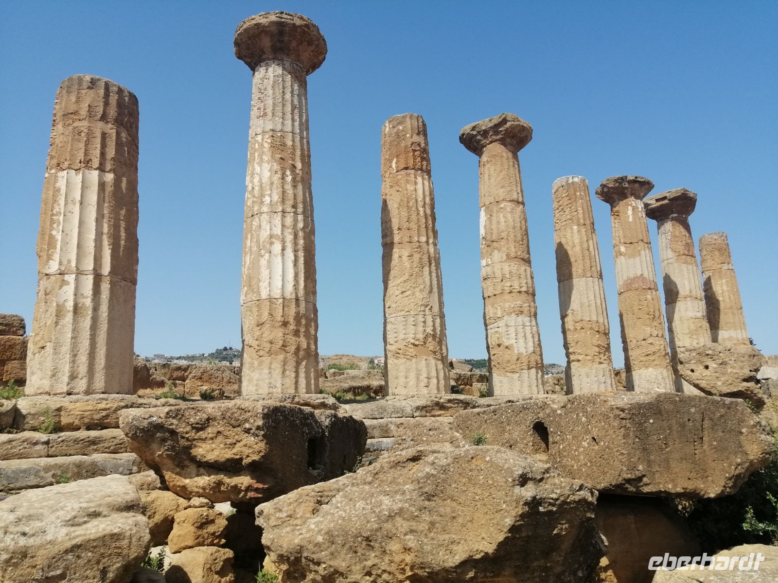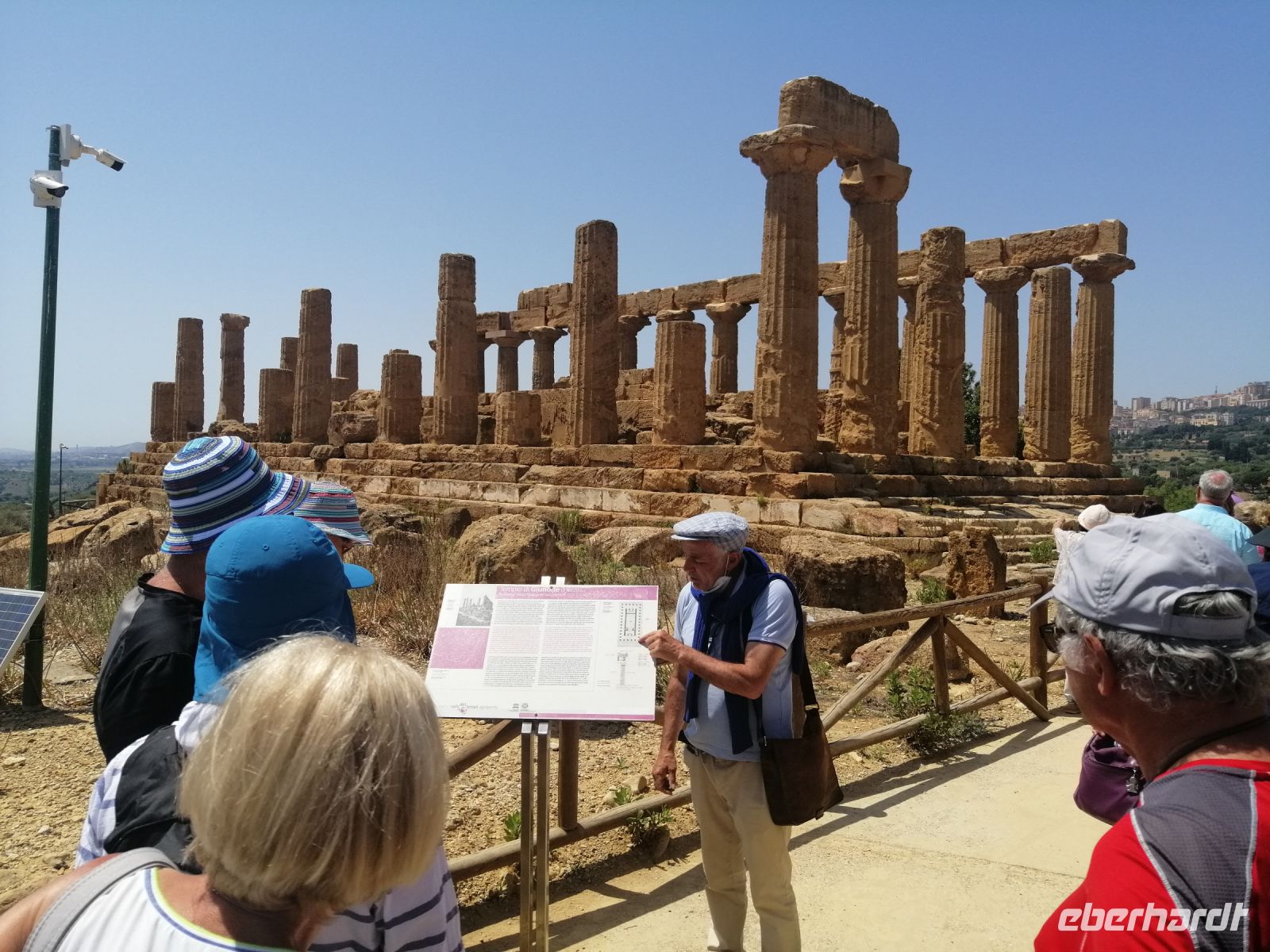 Nachem Frühstück und Ausschecken aus dem Hotel fuhren wir nach Enna, zum Mittelpunkt Siziliens. Während der Fahrt erzählte uns Vincenzo viel über Hartweizen, denn Sizilien ist ein Hartweizenland. Außerdem informierte er uns über die Geschichte Siziliens und welchen Einfluß Römer, Spanier und Habsburger in Sizilien hinterlassen haben. In Enna unternahmen wir einen Spaziergang durch die Gassen der Altstadt und besichtigten die Kathedrale Duomo di Enna.Von Vincenzo erfuhren wir, dass Enna nicht nur im geografischen Zentrum Siziliens, sondern auch 1.000 Meter hoch liegt und deshalb als die höchstgelegene Provinzhauptstadt Italiens gilt. Ihren heutigen Namen erhielt die 30.000 Einwohner zählende Stadt Enna im Jahre 1926. Anlass war ihre Erhebung zur Provinzhauptstadt. Bis dahin hiess sie Castrogiovanni, was auf eine ähnlich lautende, arabische Bezeichnung zurückging. Mit „Enna“ knüpfte man 1926 an den früheren, von den Römern gewählte Namen an, in dem das altlateinische Wort für „hoch“ nachschwingt. Nach der Stadtbescihtigung fuhren wir nach Agrigent weiter. Kurz vor Agrigent besichtigten wir "das Tal der Tempel". Während der Führung machte Vincenzo uns mit der Geschichte der Tempel ein bisschen vertraut. Der Ursprung des Tals geht auf das 6. Jahrhundert v. Chr. zurück, als die griechischen Siedler, die sich zuerst in Gela (südlich von Agrigent) niedergelassen hatten, beschlossen, etwas weiter ins Landesinnere zurückzukehren, um Selinuntaes Expansionsversuche zu kontern. Das Land im Tal war sehr fruchtbar und für den Getreideanbau günstig, so dass der Ort perfekt war. Die griechische Stadt Akragas (der alte Name von Agrigent) erlebte damals eine Zeit des wirtschaftlichen Aufschwungs. Die berühmten Tempel wurden in dieser Zeit errichtet und tragen noch Jahrhunderte später zum Ruhm des Ortes bei. Leider waren viele Städte neidisch auf diesen Erfolg. Im Jahr 406 v. Chr. wurde die Stadt von den Karthagern angegriffen. Die 8-monatige Belagerung endete mit dem Sieg der Karthager und alle Bewohner wurden getötet oder vertrieben. Nach einer ruhigeren Zeit wurde Akragas gezwungen, sich den Karthagern im Krieg gegen die Römer anzuschließen. Die Stadt wurde 210 v. Chr. besiegt und das "Tal der Tempel" wurde dann allmählich verlassen. Heute ist das Tal ein herrlicher archäologischer Park von fast 1.300 Hektar. Anschließend fuhren wir in unser Hotel, verabschiedeten uns von unserem Busfahrer Ignazio und trafen uns abends zum gemeinsamen Abendessen. In diesem Hotel blieben wir nur eine Nacht, die für Einige von uns ziemlich unruhig war, obwohl ein Polizeikomando ebenfalls im Hotel übernachtete.