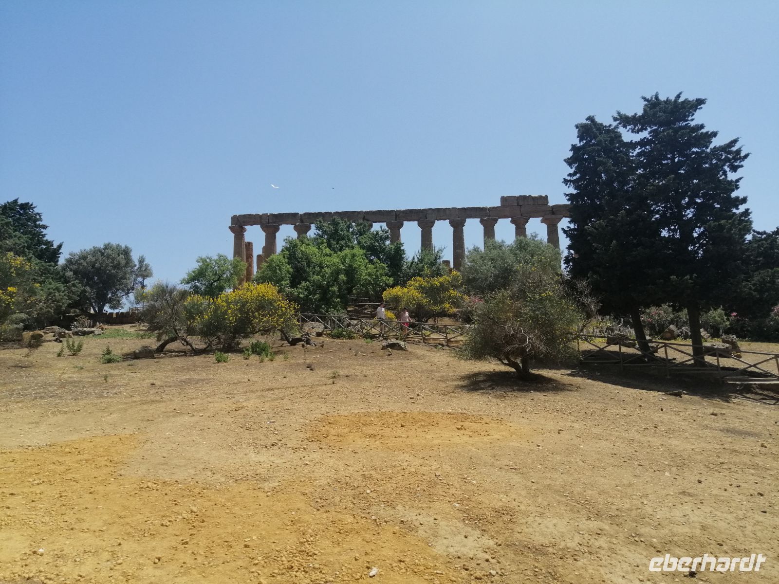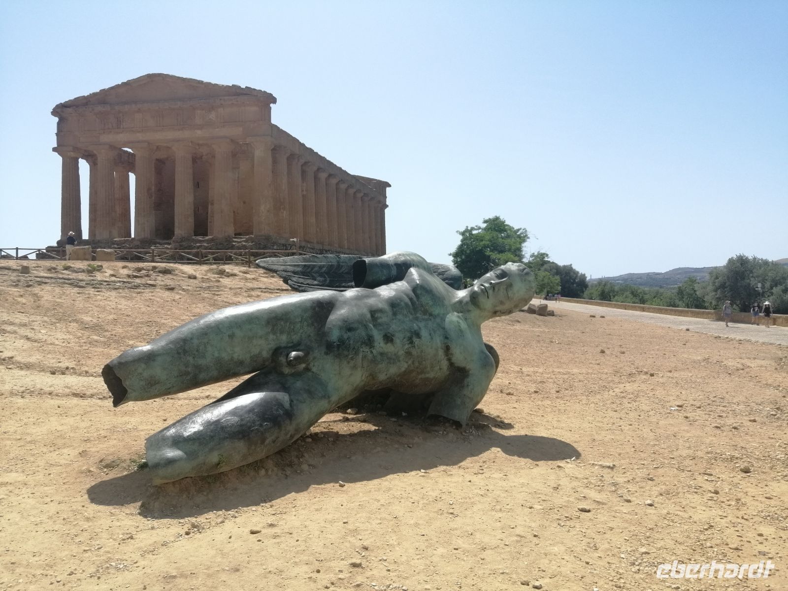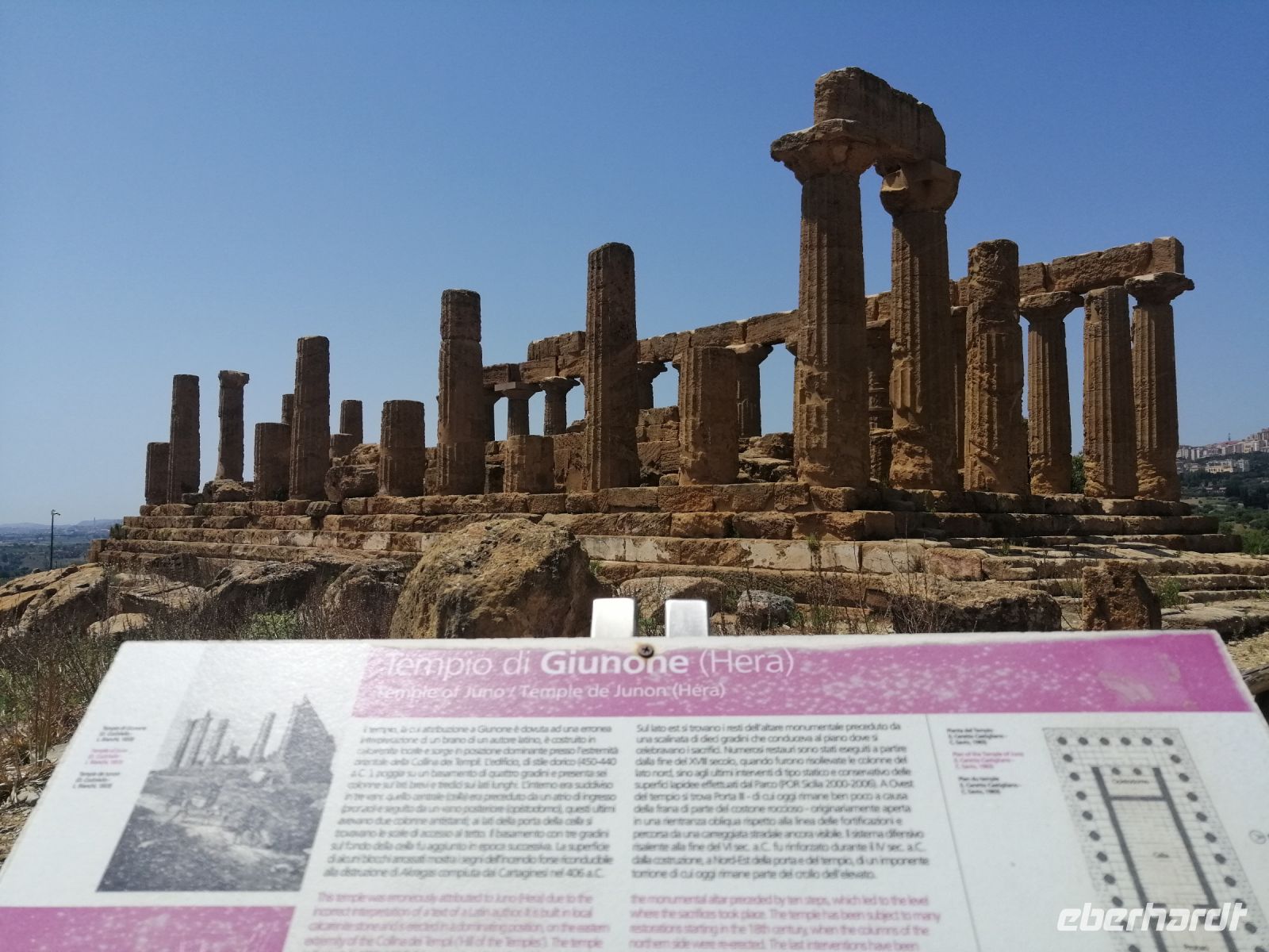 Nachem Frühstück und Ausschecken aus dem Hotel fuhren wir nach Enna, zum Mittelpunkt Siziliens. Während der Fahrt erzählte uns Vincenzo viel über Hartweizen, denn Sizilien ist ein Hartweizenland. Außerdem informierte er uns über die Geschichte Siziliens und welchen Einfluß Römer, Spanier und Habsburger in Sizilien hinterlassen haben. In Enna unternahmen wir einen Spaziergang durch die Gassen der Altstadt und besichtigten die Kathedrale Duomo di Enna.Von Vincenzo erfuhren wir, dass Enna nicht nur im geografischen Zentrum Siziliens, sondern auch 1.000 Meter hoch liegt und deshalb als die höchstgelegene Provinzhauptstadt Italiens gilt. Ihren heutigen Namen erhielt die 30.000 Einwohner zählende Stadt Enna im Jahre 1926. Anlass war ihre Erhebung zur Provinzhauptstadt. Bis dahin hiess sie Castrogiovanni, was auf eine ähnlich lautende, arabische Bezeichnung zurückging. Mit „Enna“ knüpfte man 1926 an den früheren, von den Römern gewählte Namen an, in dem das altlateinische Wort für „hoch“ nachschwingt. Nach der Stadtbescihtigung fuhren wir nach Agrigent weiter. Kurz vor Agrigent besichtigten wir "das Tal der Tempel". Während der Führung machte Vincenzo uns mit der Geschichte der Tempel ein bisschen vertraut. Der Ursprung des Tals geht auf das 6. Jahrhundert v. Chr. zurück, als die griechischen Siedler, die sich zuerst in Gela (südlich von Agrigent) niedergelassen hatten, beschlossen, etwas weiter ins Landesinnere zurückzukehren, um Selinuntaes Expansionsversuche zu kontern. Das Land im Tal war sehr fruchtbar und für den Getreideanbau günstig, so dass der Ort perfekt war. Die griechische Stadt Akragas (der alte Name von Agrigent) erlebte damals eine Zeit des wirtschaftlichen Aufschwungs. Die berühmten Tempel wurden in dieser Zeit errichtet und tragen noch Jahrhunderte später zum Ruhm des Ortes bei. Leider waren viele Städte neidisch auf diesen Erfolg. Im Jahr 406 v. Chr. wurde die Stadt von den Karthagern angegriffen. Die 8-monatige Belagerung endete mit dem Sieg der Karthager und alle Bewohner wurden getötet oder vertrieben. Nach einer ruhigeren Zeit wurde Akragas gezwungen, sich den Karthagern im Krieg gegen die Römer anzuschließen. Die Stadt wurde 210 v. Chr. besiegt und das "Tal der Tempel" wurde dann allmählich verlassen. Heute ist das Tal ein herrlicher archäologischer Park von fast 1.300 Hektar. Anschließend fuhren wir in unser Hotel, verabschiedeten uns von unserem Busfahrer Ignazio und trafen uns abends zum gemeinsamen Abendessen. In diesem Hotel blieben wir nur eine Nacht, die für Einige von uns ziemlich unruhig war, obwohl ein Polizeikomando ebenfalls im Hotel übernachtete.