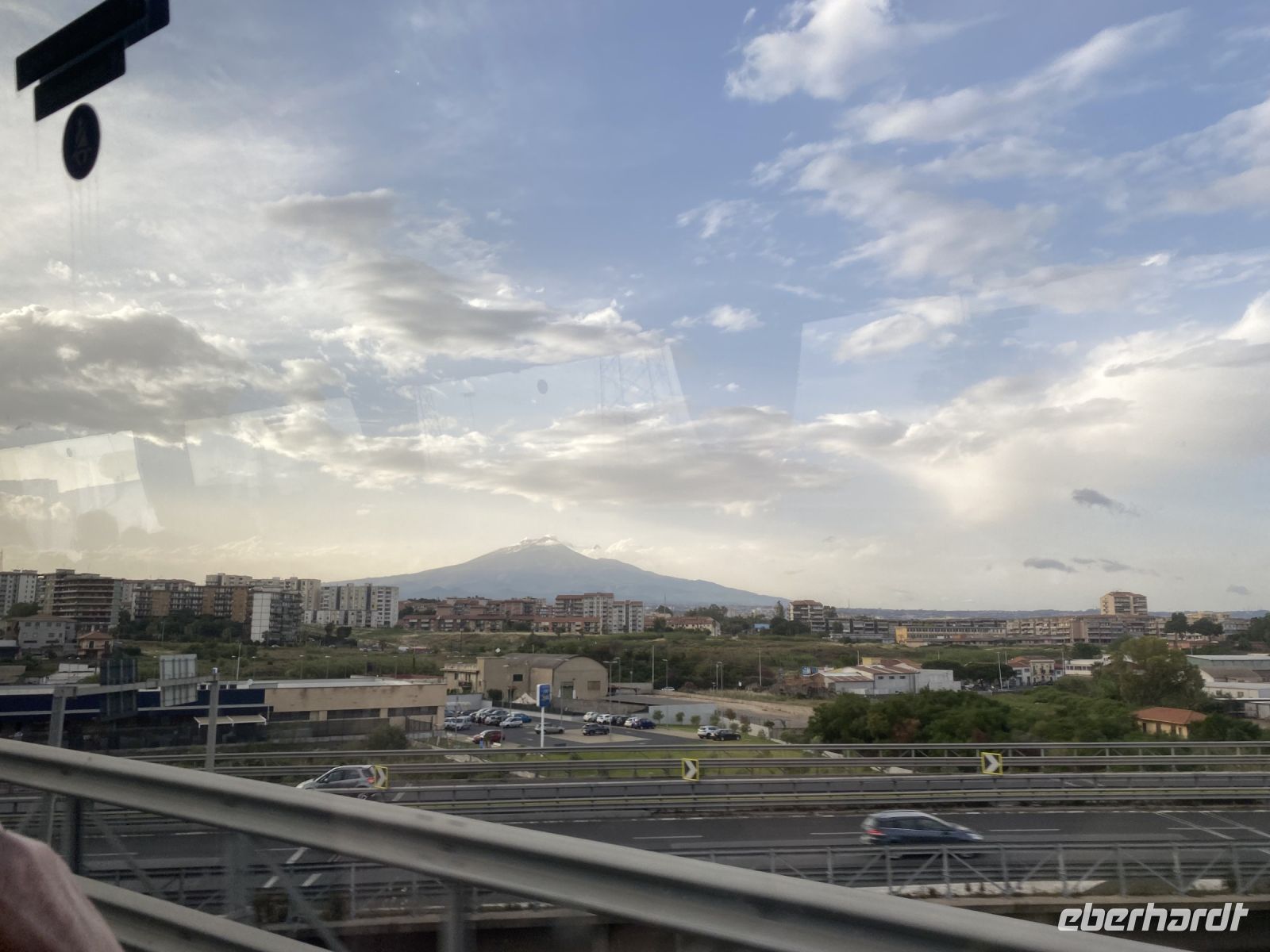 Auf unserer Fahrt, wir sitzen in kurzer Sommerkleidung, erhaschen wir aus dem Busfenster den Ätna….. „unseren spektakulären Vulkan“ und er liegt mit zwei Rauchsäulen, die eine scheinbar unendliche Rauchfahne am Himmel flankieren. Wir versuchen aus unzähligen Perspektiven ein gutes Foto zu erhaschen, ist es doch kaum zu glauben, was wir erst vor ein paar Tagen dort erleben konnten. Aber unsere Fahrt bewegte sich in Richtung Westen, das war auch ein letzter Blick gen Ätna für uns.