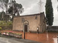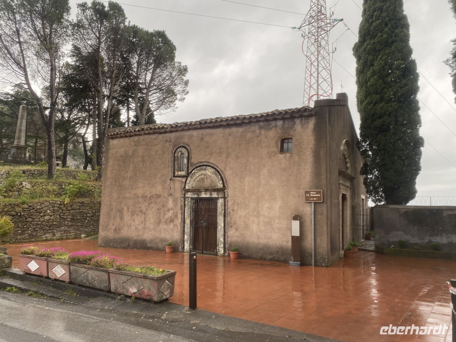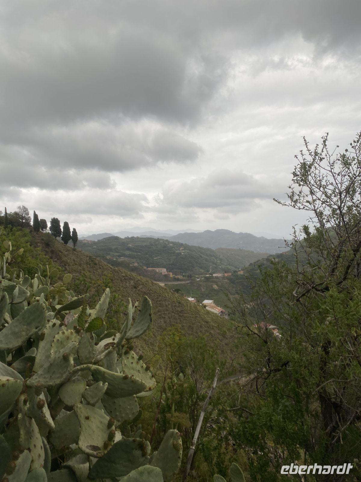 Wir brauchen nicht viel Vorstellungskraft, trotz Regen sind wir begeistert von der Höhenlage des Monte Tauro, von dem aus wir angekommen über die Landschaft blicken können. Und es scheint wie eine kleine Belohnung, dass der Regen tatsächlich in dem Moment eine Pause einlegte, als wir mit dem Bus an der Stelle einer ersten Wanderung ankamen. So zeigte uns Camillo die kleine Kirche San Giorgio, die zu unserem Besuch natürlich geschlossen war, immerhin wird sie nur zweimal im ganzen Jahr geöffnet. Und weil sich das Wetter stabil gibt, schlägt Camillo vor, den an der Kirche gelegenen Höhenweg auch direkt zu erlaufen. So bekommen wir schon am ersten Tag eine gute Ahnung von dem, was vorgesehen ist „mit mehr Bewegung“. Senkrecht schlängelt sich die Strasse hinauf zum Bergplateau, vorbei an noch einzeln stehenden Wohnhäusern. Je höher wir kommen, desto traumhafter der Blick über die Landschaft. Die einzige Steigerung wäre nun noch dies mit blauem Himmel und Sonnenschein gewesen. Aber es zieht erneut zu und wir konnten an den herannahenden Wolken sehr genau ausmachen, dass wir schon kurzfristig wieder nass werden würden. Und so kam es auch und wir erreichten unseren Bus sehr dankbar aber klischnass.