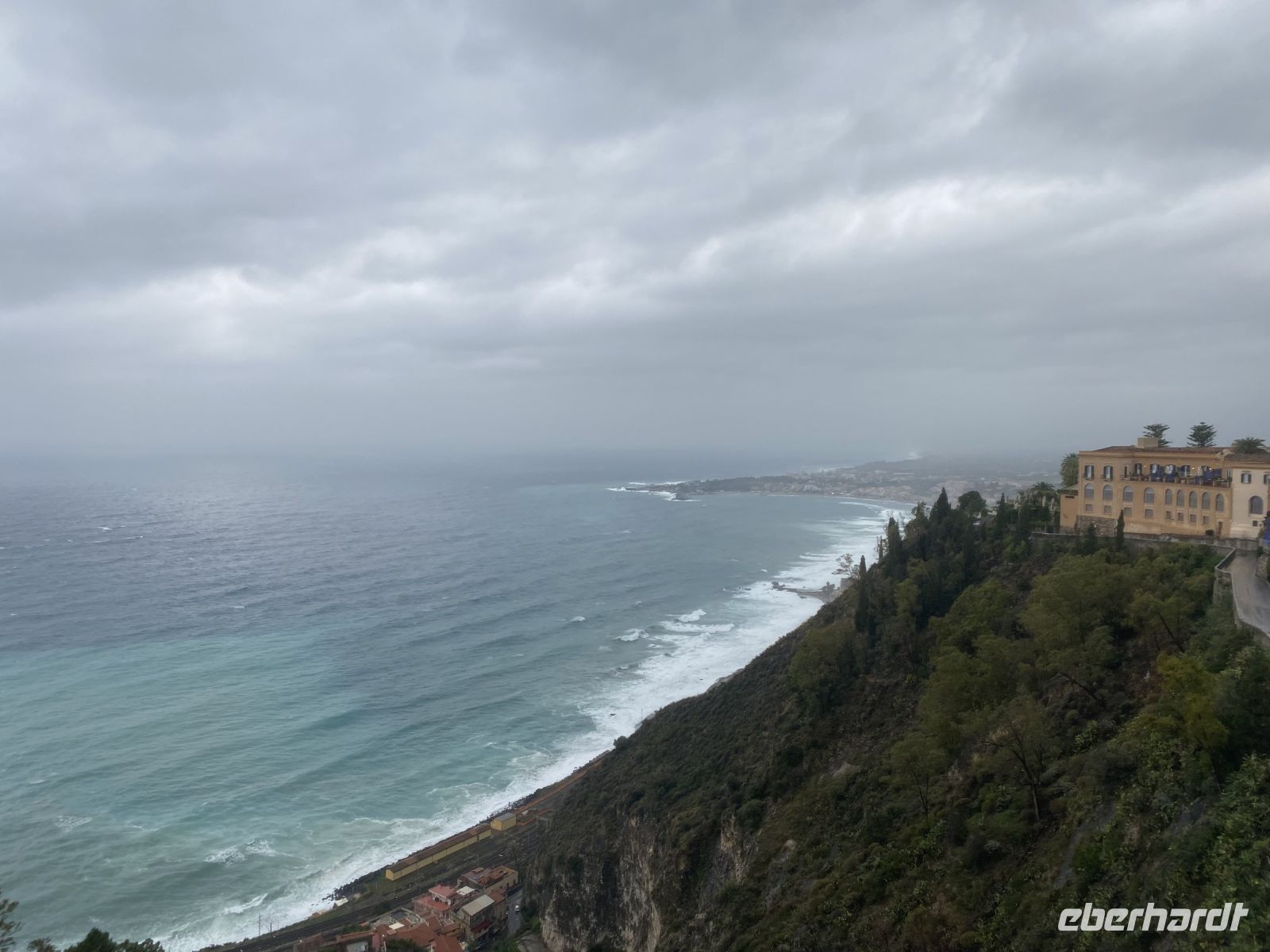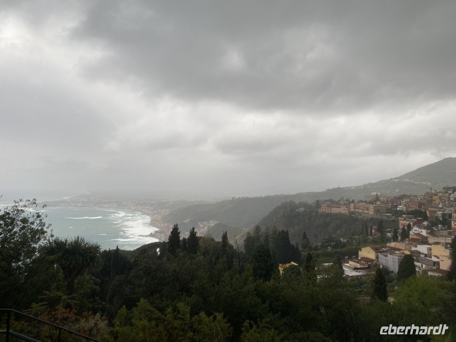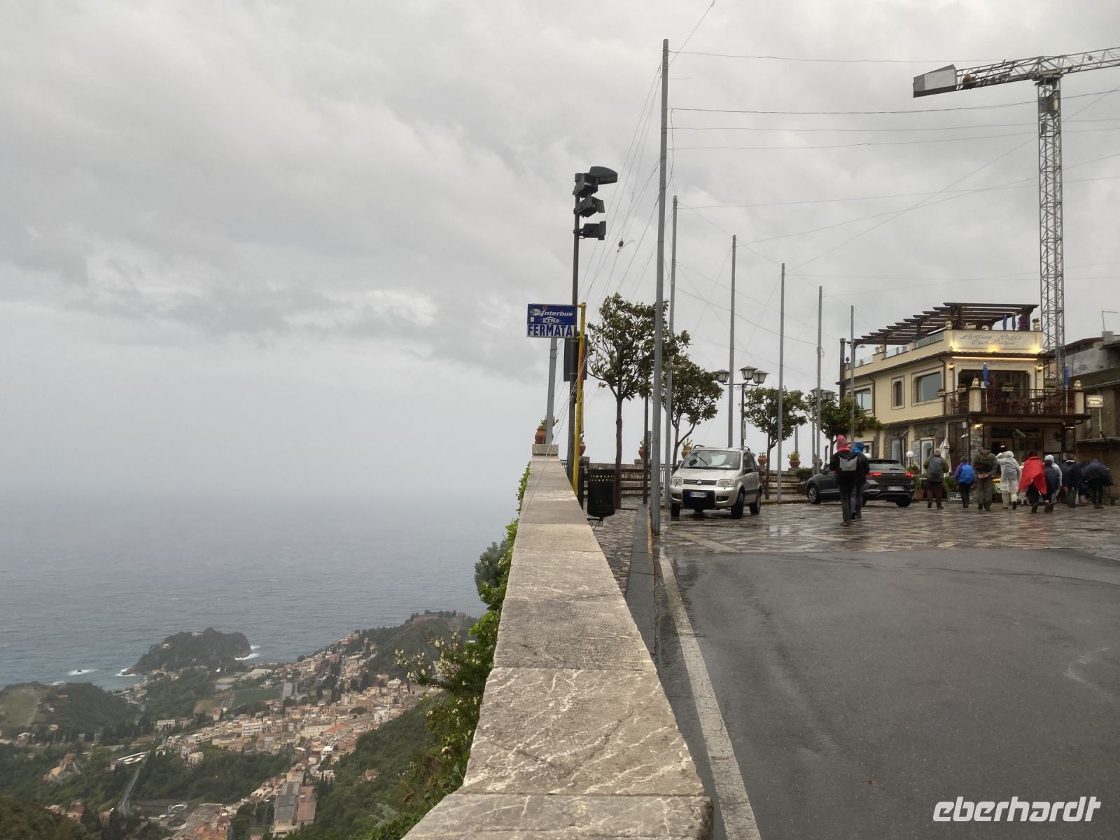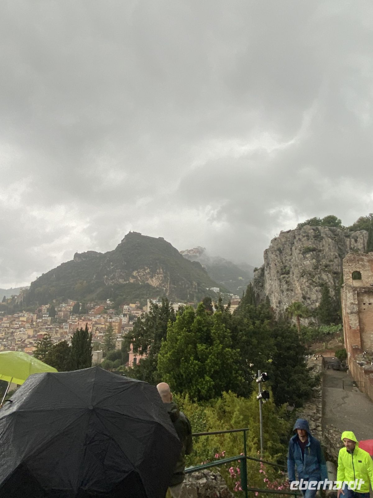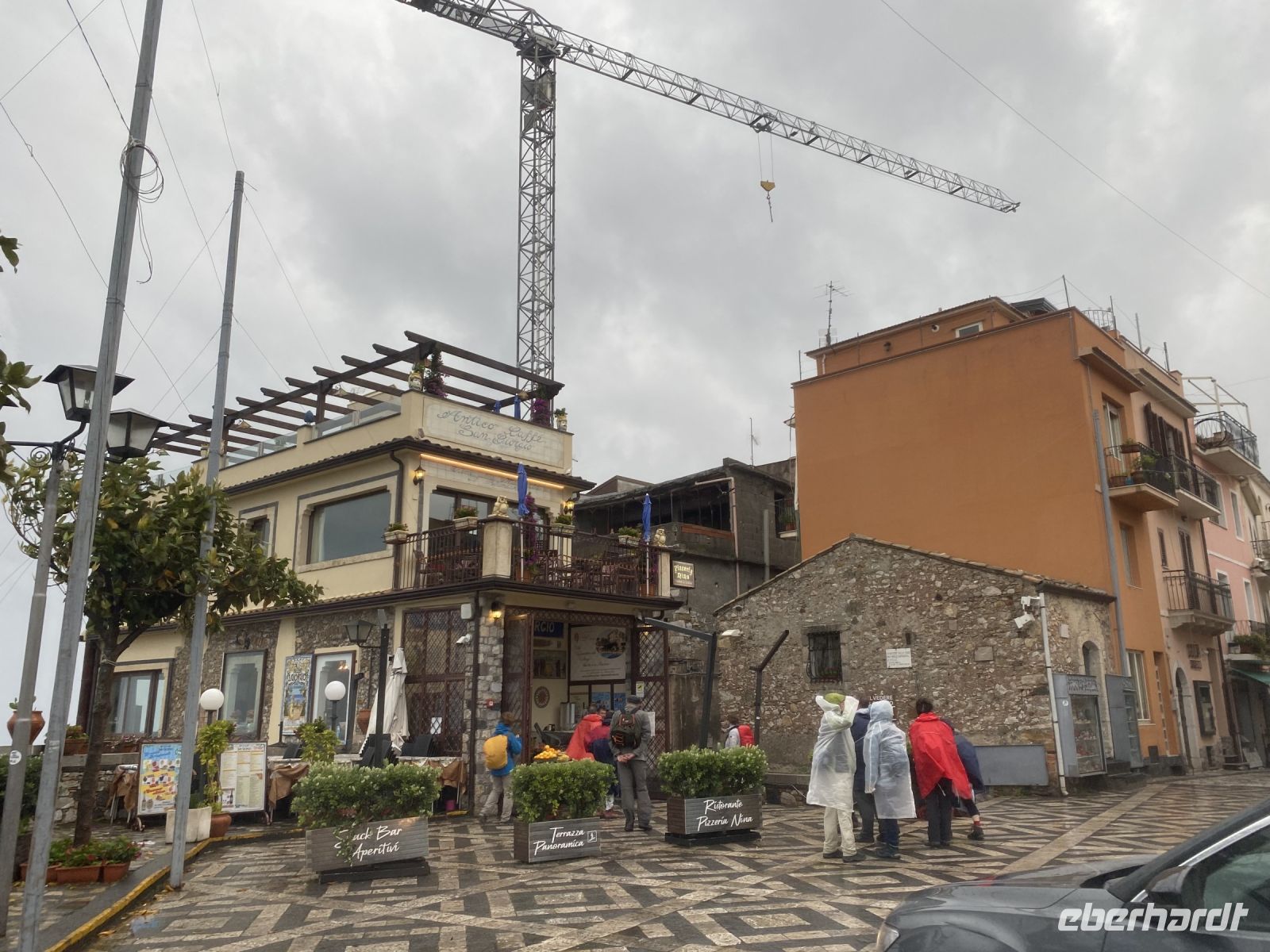 Und wieder wartete eine kleine Belohnung auf uns: die Gassen von Castelmola menschenleer liefen wir in das Cafe Antico San Giorgio und hatten unseren vielleicht ersten sizilianischen Moment bei Espresso und Mandelgebäck. Und da meine Reisegäste ja wie bereits erwähnt erprobte Wanderer waren, durfte auch eigentlich nie der spektakuläre, abenteuerliche Moment fehlen, der uns hier beim Öffnen der Ladentür in Richtung Toiletten entgegenschlug. Der Regen kam mittlerweile mit derart stark stürmischen Böen von seitwärts, das machte es zu einer Herausforderung die Seitentreppe am Haus sicher hinunter zu nehmen. Aber auch noch an dieser Stelle, immerhin waren alle im sogenannten Wonnemonat auf Italienreise, blieben meine Gäste bei guter Laune und gespannt auf die nächste Station Taormina, die Camillo uns ankündigte.