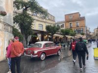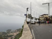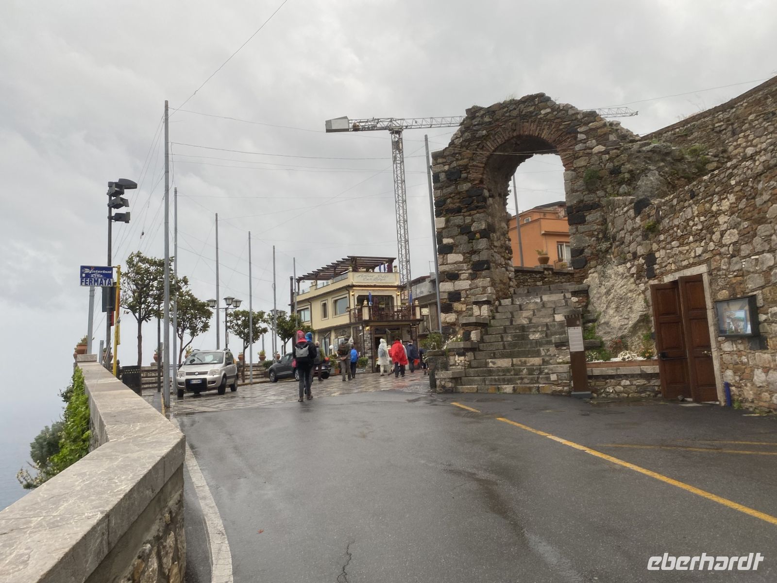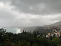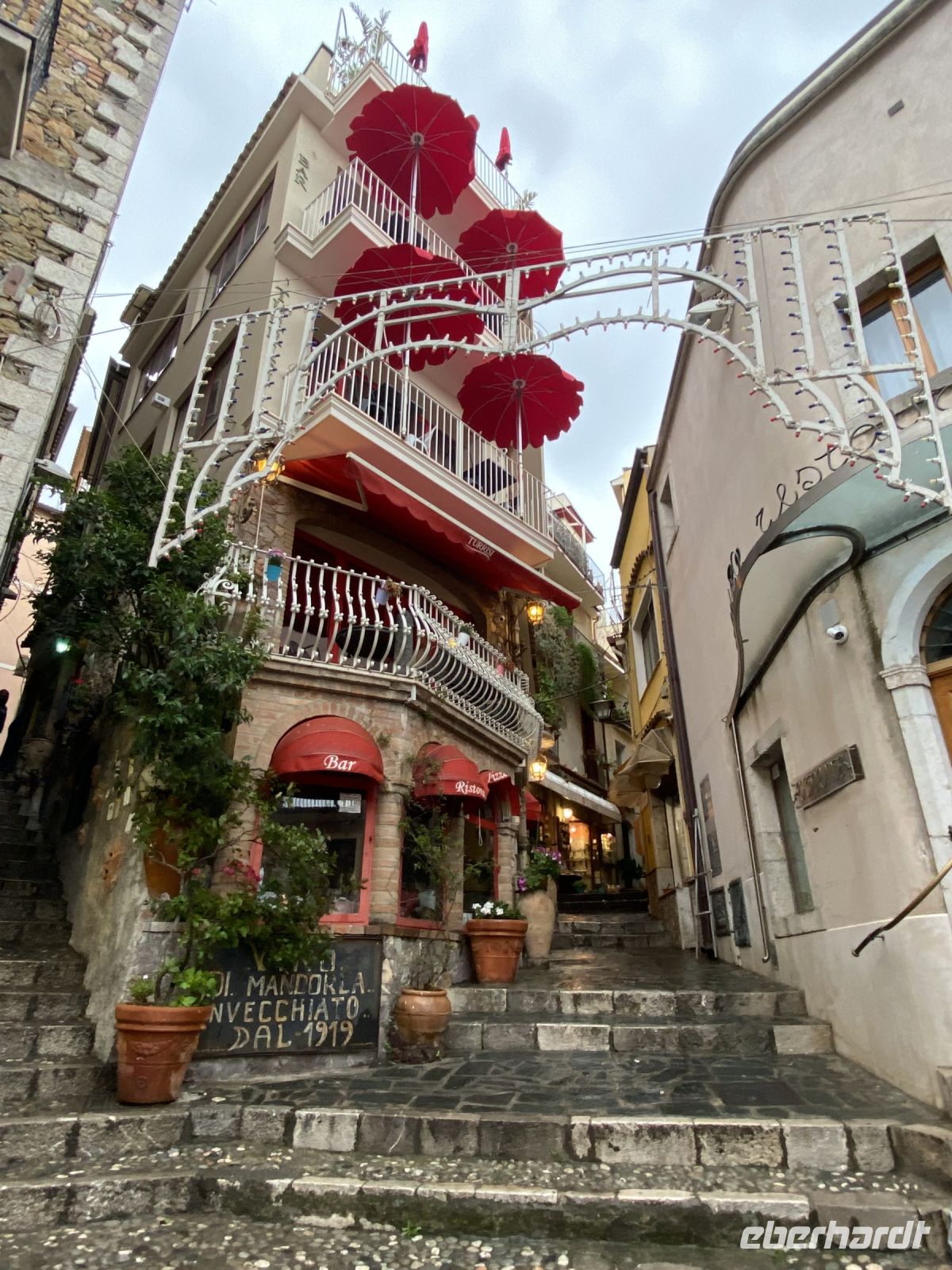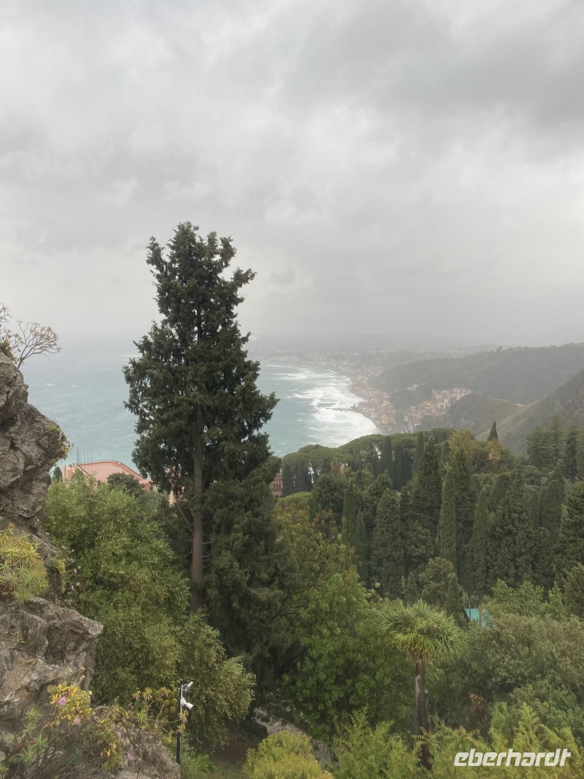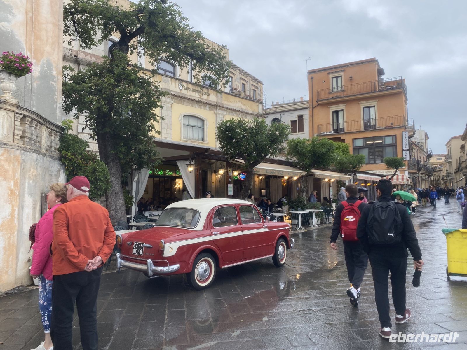 Und wieder wartete eine kleine Belohnung auf uns: die Gassen von Castelmola menschenleer liefen wir in das Cafe Antico San Giorgio und hatten unseren vielleicht ersten sizilianischen Moment bei Espresso und Mandelgebäck. Und da meine Reisegäste ja wie bereits erwähnt erprobte Wanderer waren, durfte auch eigentlich nie der spektakuläre, abenteuerliche Moment fehlen, der uns hier beim Öffnen der Ladentür in Richtung Toiletten entgegenschlug. Der Regen kam mittlerweile mit derart stark stürmischen Böen von seitwärts, das machte es zu einer Herausforderung die Seitentreppe am Haus sicher hinunter zu nehmen. Aber auch noch an dieser Stelle, immerhin waren alle im sogenannten Wonnemonat auf Italienreise, blieben meine Gäste bei guter Laune und gespannt auf die nächste Station Taormina, die Camillo uns ankündigte.