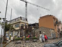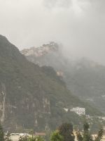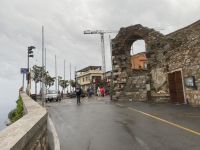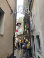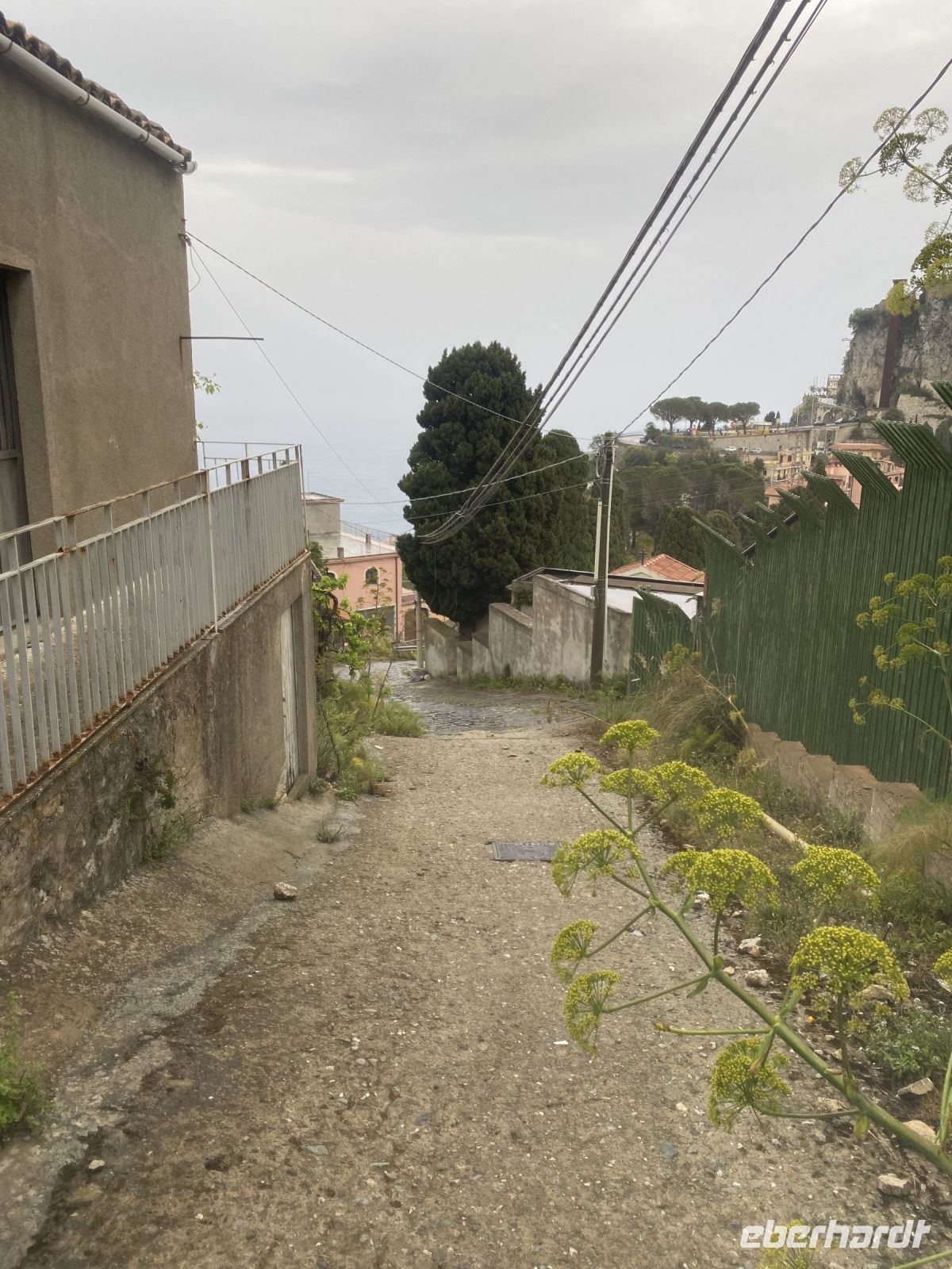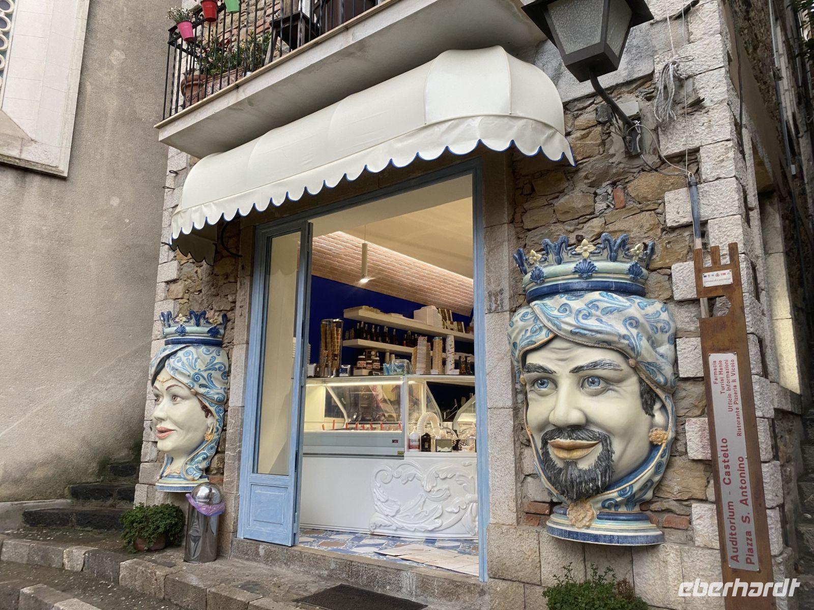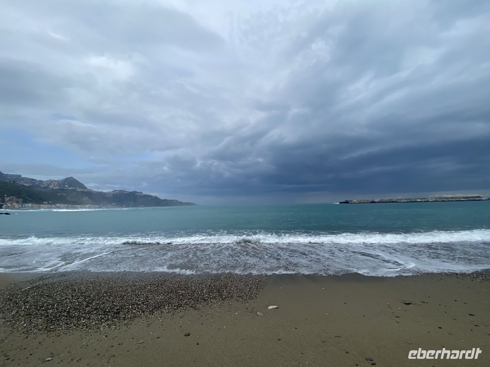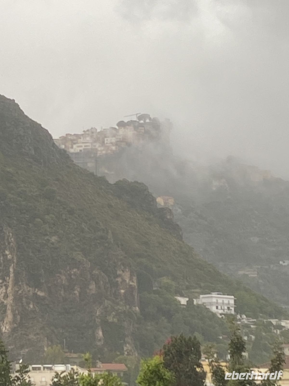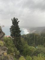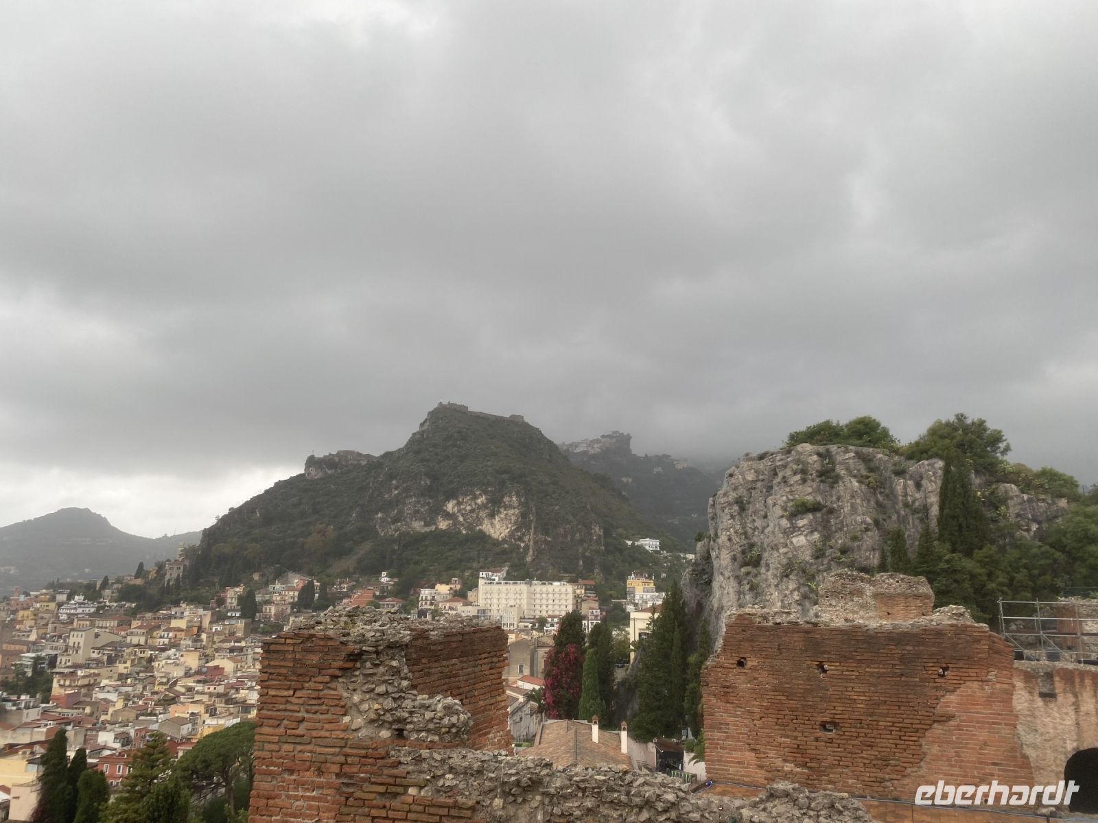 Und wieder wartete eine kleine Belohnung auf uns: die Gassen von Castelmola menschenleer liefen wir in das Cafe Antico San Giorgio und hatten unseren vielleicht ersten sizilianischen Moment bei Espresso und Mandelgebäck. Und da meine Reisegäste ja wie bereits erwähnt erprobte Wanderer waren, durfte auch eigentlich nie der spektakuläre, abenteuerliche Moment fehlen, der uns hier beim Öffnen der Ladentür in Richtung Toiletten entgegenschlug. Der Regen kam mittlerweile mit derart stark stürmischen Böen von seitwärts, das machte es zu einer Herausforderung die Seitentreppe am Haus sicher hinunter zu nehmen. Aber auch noch an dieser Stelle, immerhin waren alle im sogenannten Wonnemonat auf Italienreise, blieben meine Gäste bei guter Laune und gespannt auf die nächste Station Taormina, die Camillo uns ankündigte.