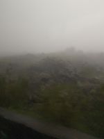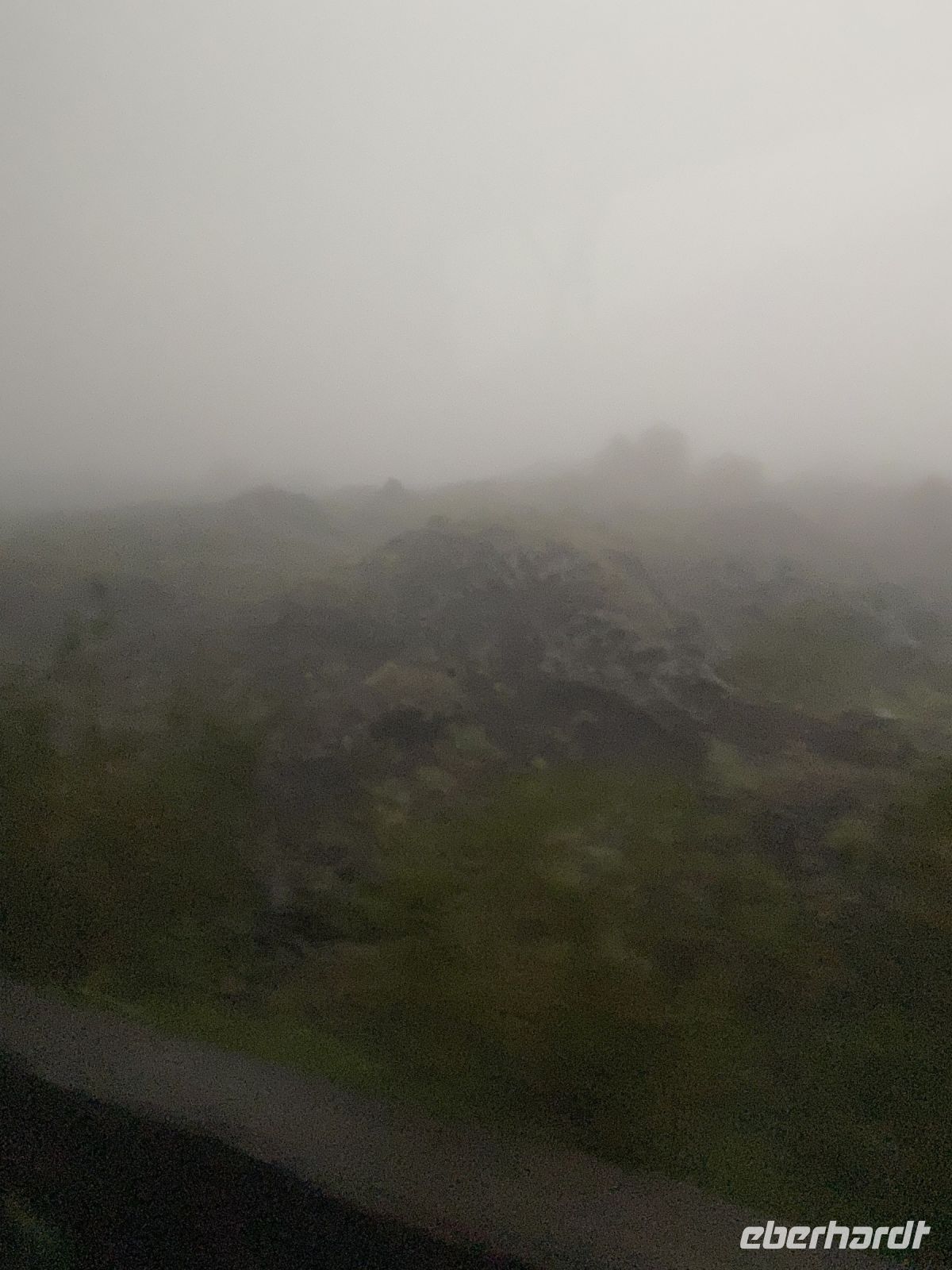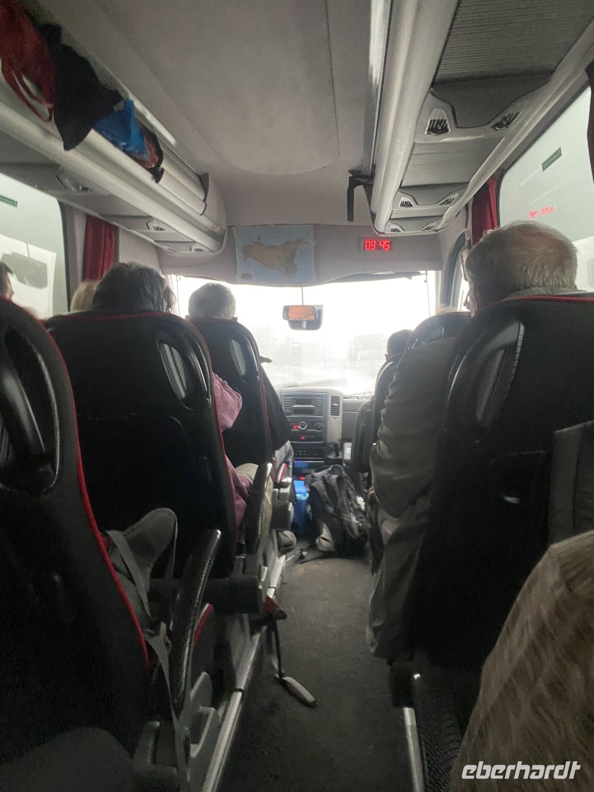 Auf dem touristischen Plateau Ätna angekommen sehen wir schon Gastronomie und Seilbahn und beschliessen zunächst eine unserer vielen technischen Pausen. Doch dann kam alles ganz schnell: eine Alarmmeldung der Agentur, die die Vulkanwacht herausgegeben hatte, wir mögen sofort das Gebiet des Vulkans verlassen, da es einen Vulkanausbruch gibt. Schon am Vortag konnten wir auf einschlägiger Internetseite lesen, dass der Vulkan starke Eruptionen messen liess. Aber nun dies: in einem Souvenirladen mit Cafe und Toiletten verteilt machten verschiedene Reiseleiter mobil, unverzüglich das Ätnagelände zu verlassen und so stürmten wir natürlich Camillo folgend Richtung Bus. Und ja, wir hatten sehr wohl bemerkt, dass es draussen immer dunkler wurde, die Sicht massiv eingeschränkt. Aber der dann nur kurze Weg zu unserem Bus hatte etwas dramatisch dunkles, wir waren uns einig: Weltuntergangsstimmung, und diese gepaart mit Steinschüssen bei orkanartigen Böen. Jedoch waren wir alle so eingenommen von diesen nur wenigen Minuten des Weges zu unserem schützenden Bus…..spektakulär und berauschend spannend. Und gleichzeitig so unwirklich. Ich stieg als letzte in den Bus und wollte überprüfen, ob alle meine Gäste vollständig da waren, als ich schon darauf hingewiesen wurde, dass ich kleine schwarze Steinchen in Gesicht und Haar hatte. Und ja, die Steine des Ätna kamen mit derartiger Windstärke, dass es sogar durch feste Hosen britzelte. Aber wie schon gesagt, alles passierte fast wie unwahr und erst während der Abfahrt zurück ins Tal kam in uns so eine Art Rekapitulation auf und wir fühlten uns nur noch angetan von der Situation und eigentlich dabei von der berechtigten Unberechenbarkeit der Natur fasziniert. Ich würde sagen, dass wir vom Ätna fasziniert waren, trotzdem wir ihn nicht mal bestiegen haben.