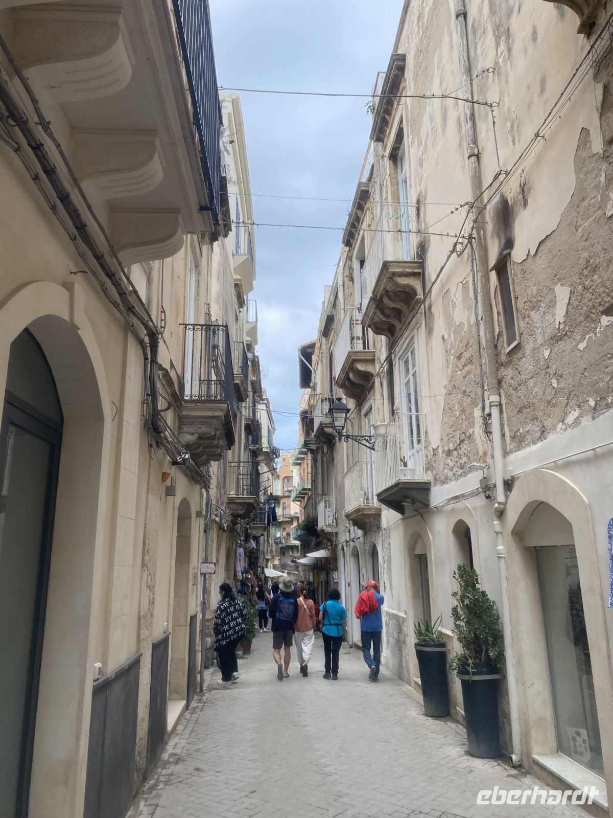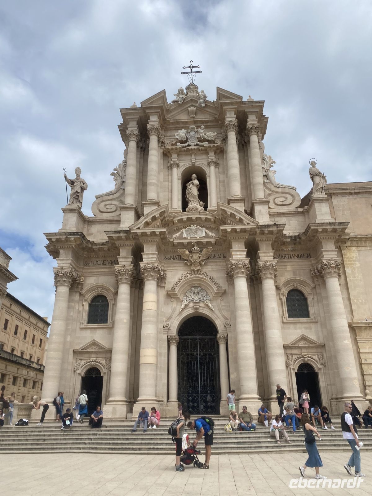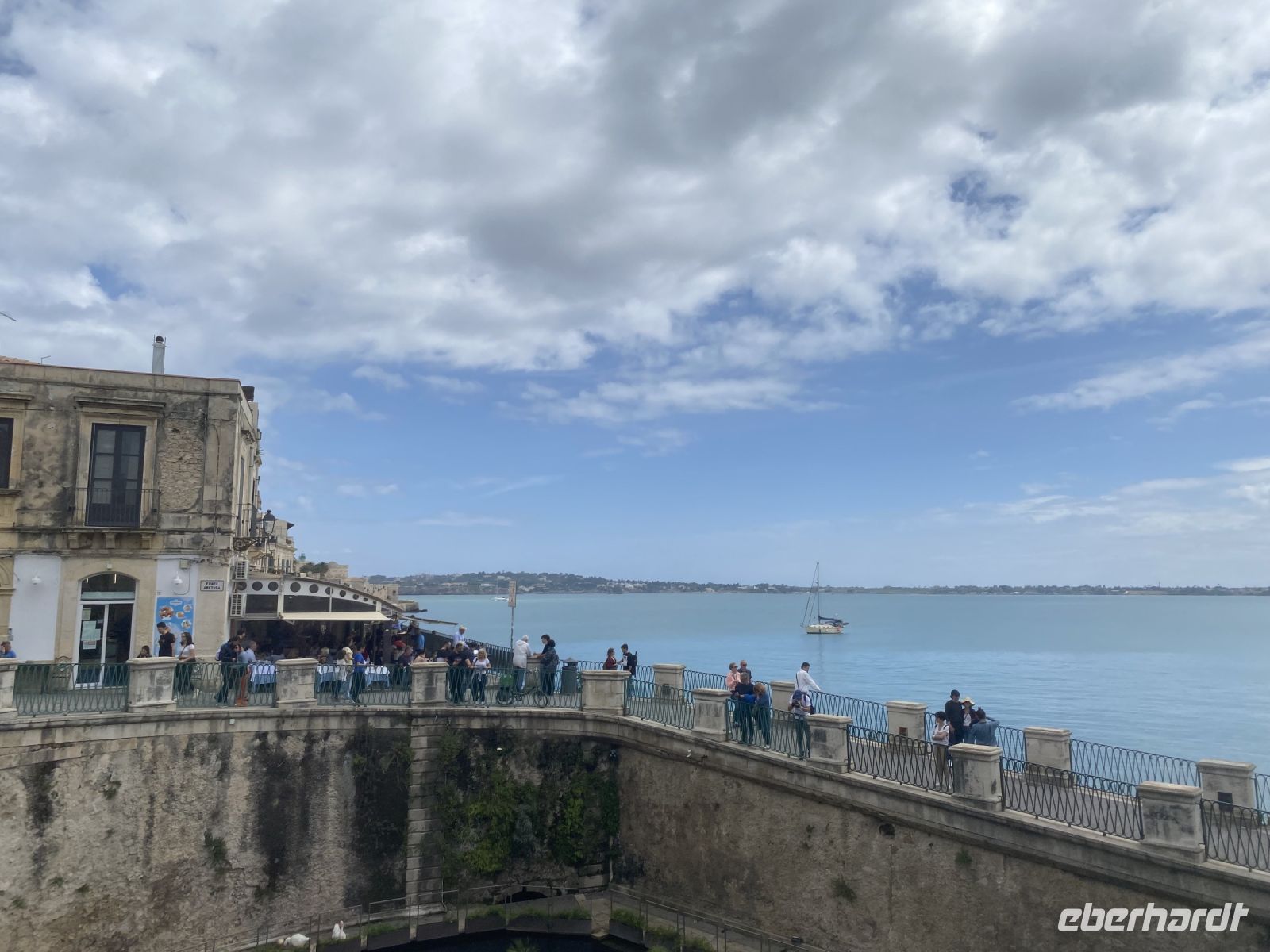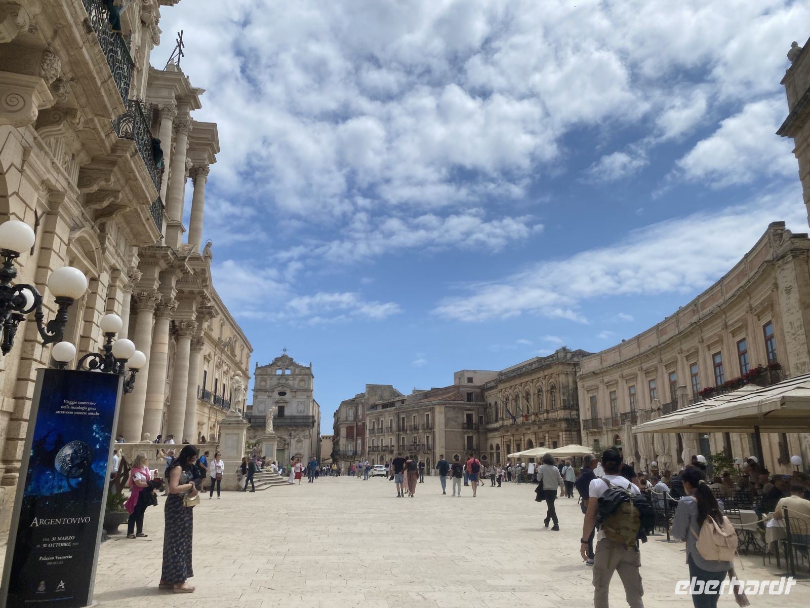 Unsere Mittagspause ein wenig nach hinten verschoben, zog es uns direkt weiter nach Syrakus. Camillo führte uns zur Insel Ortigia, auf der sich die Altstadt von Syrakus befindet. Unser Weg führte vorbei am Hafen, dem Apollo Tempel, dem Stadttor. Wir liefen durch kleine Gassen bis zur Piazza del Duomo, von wo aus wir dann die Altstadt auf eigene Faust erkunden. Wir pausieren in kleinen Strassenlokalen und stöbern hier und da, die Stadt ist voll von ausländischen Touristen.