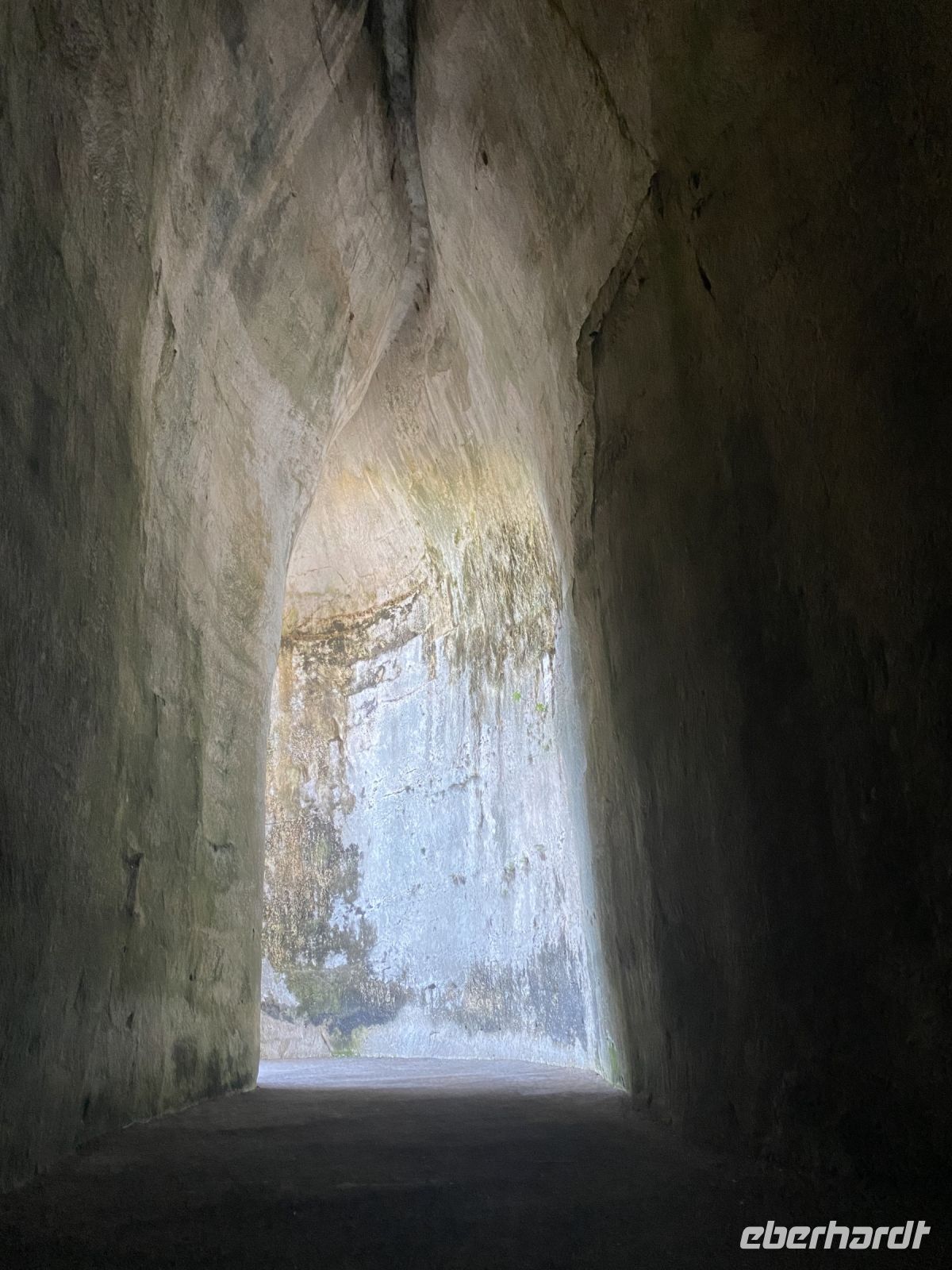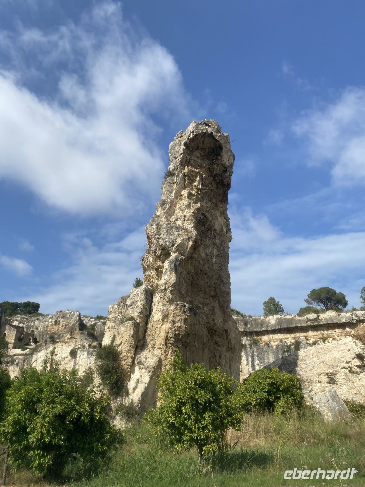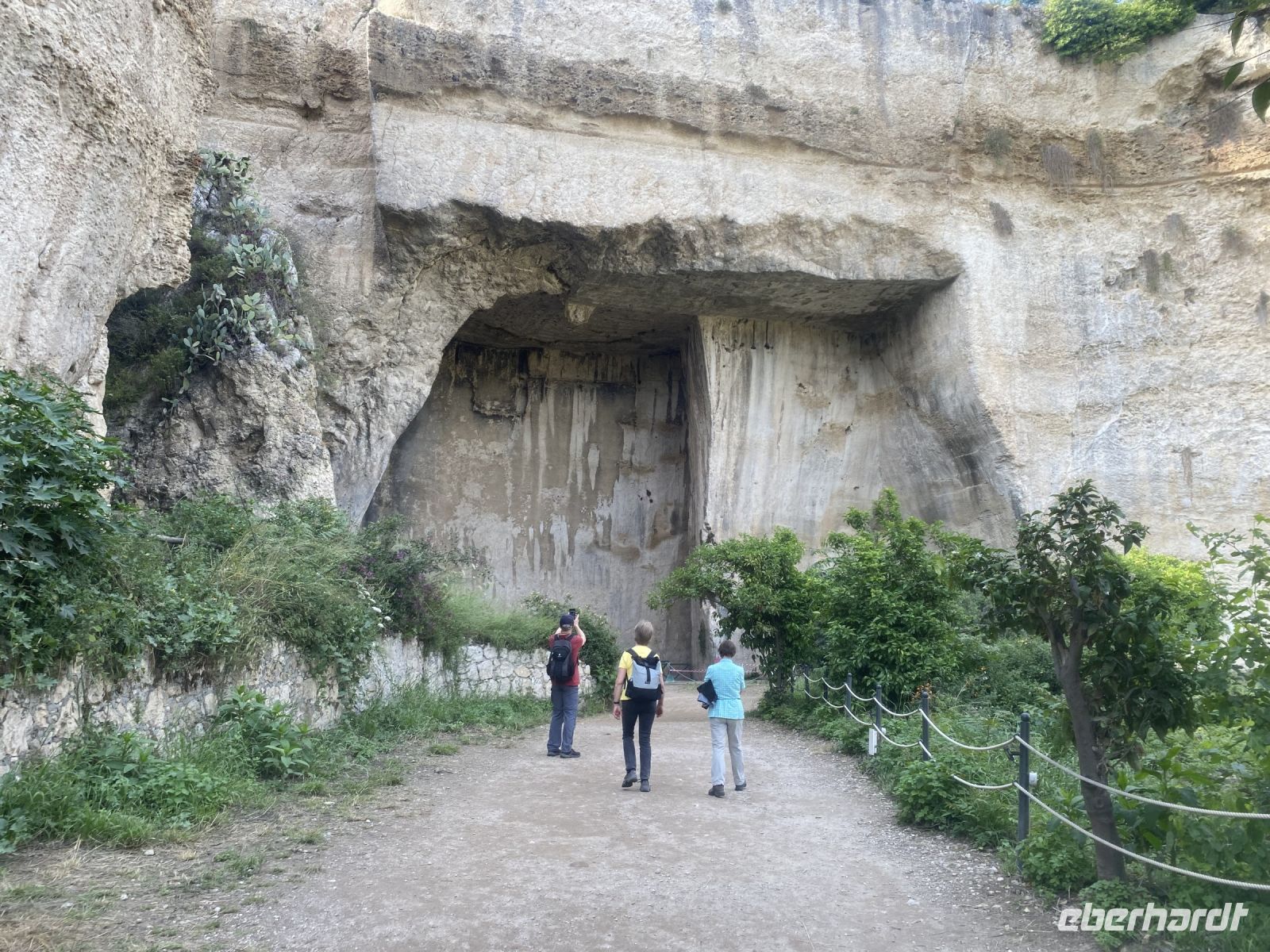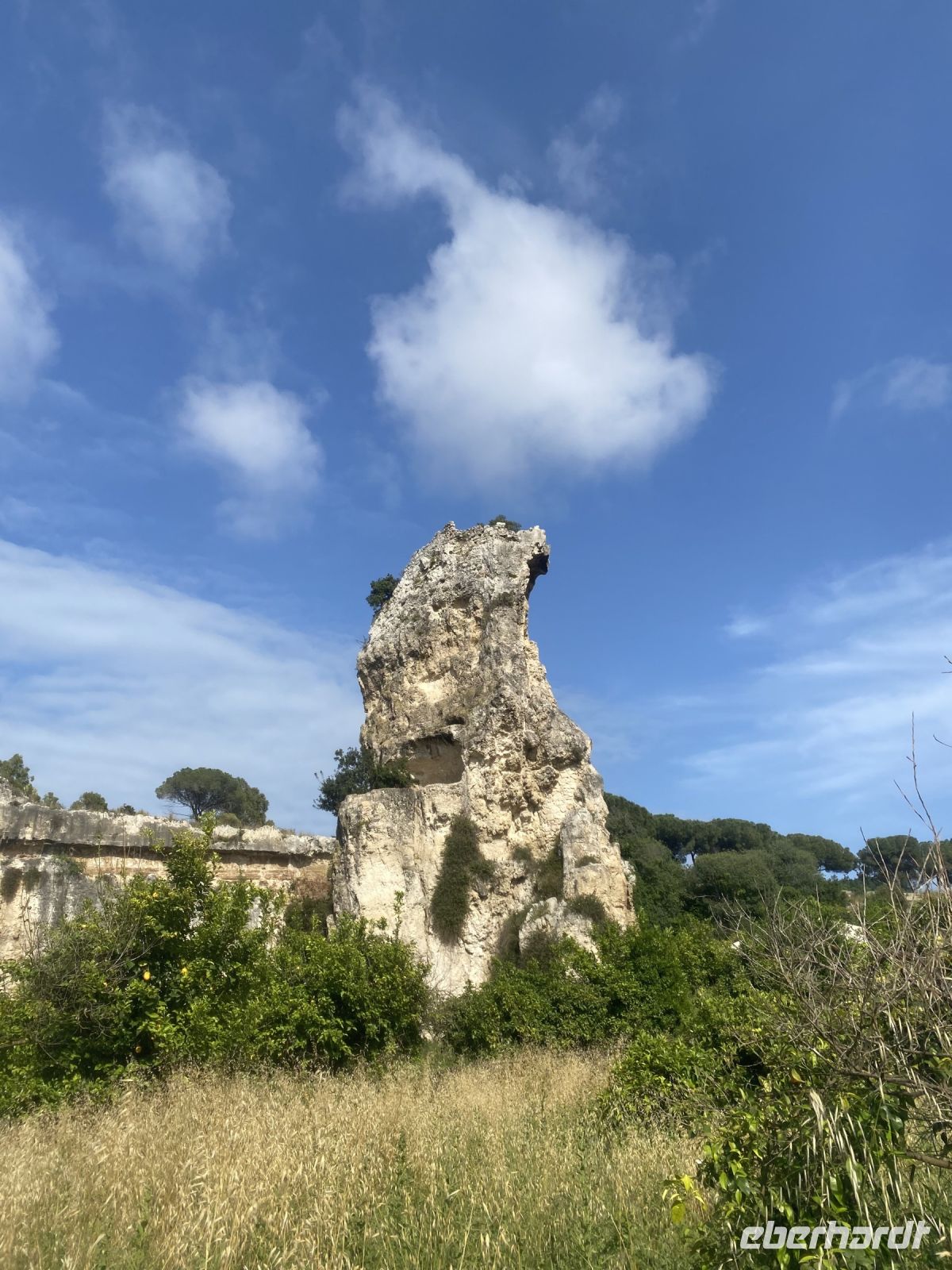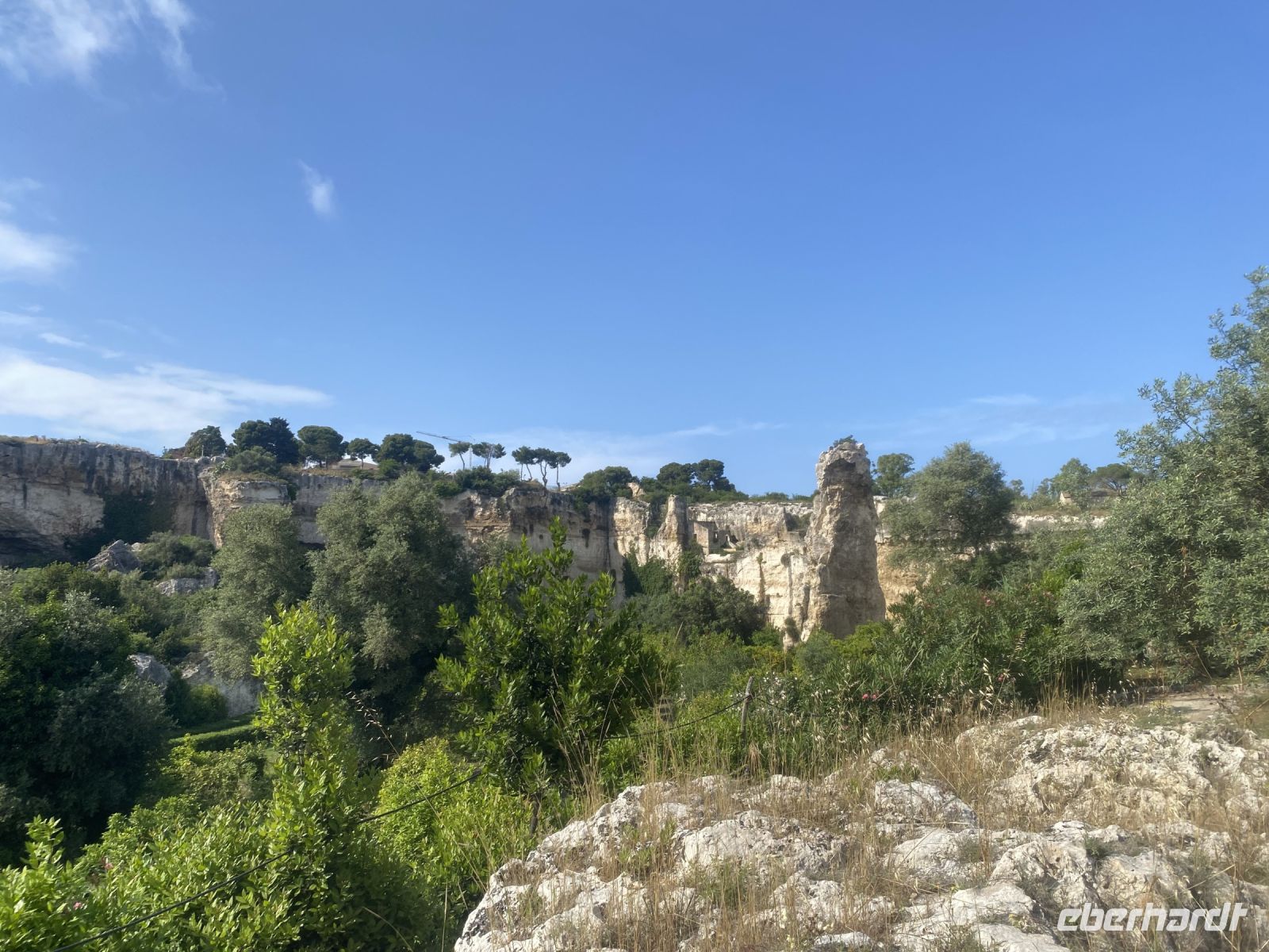 Eigentlich war für den heutigen Tag eine Wanderung in der Hochebene von Pantalica geplant, im Anschluss wollten wir ein kleines Picknick machen. Zwar gab es an diesem Morgen keinen Regen mehr, aber die Landschaft war von den Unwettern der letzten Tage gezeichnet und wir entschieden, dass zumindest ein Picknick vorzubereiten nicht sinnvoll sein wird. Nach einiger Fahrtzeit, begleitet durch die Ausführungen von Camillo zu Land und Geschichte erreichten wir unseren ersten kleinen Wanderhalt. Aber auch hier musste spontan umgeplant werden, die Anlage Pantalica war nicht zugänglich. Das Wetter war nun mittlerweile vollständig aufgebrochen und blauer Himmel und Sonnenschein sollten von nun an unser ständiger Begleiter auf dieser Reise sein.